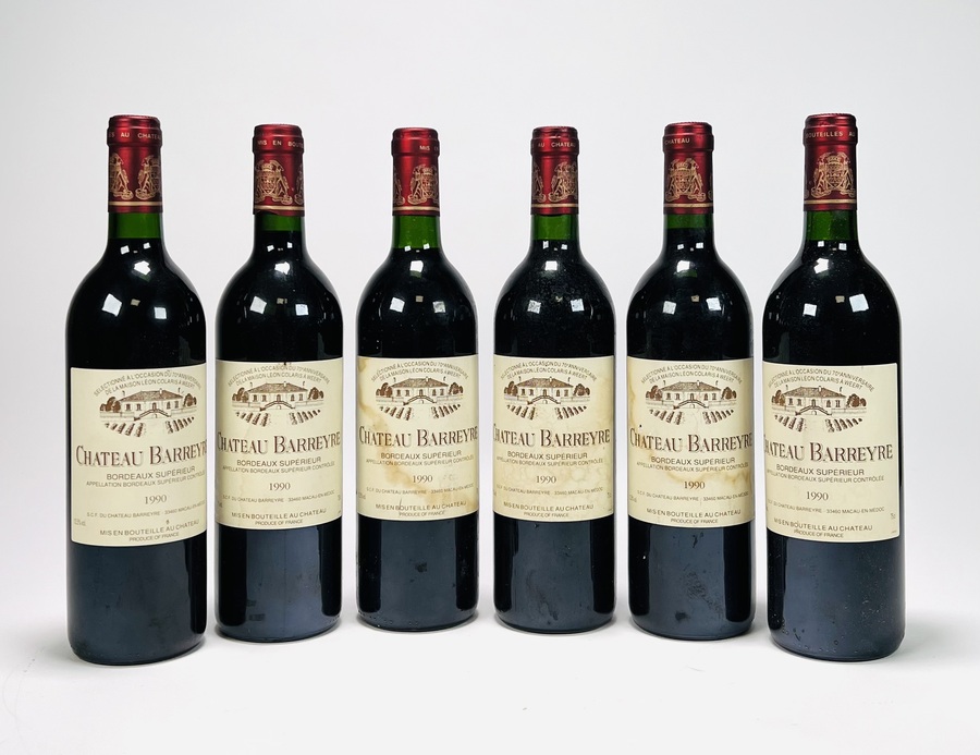 Zes flessen rode Bordeaux wijn van Chateau Barreyre, jaar 1990. |