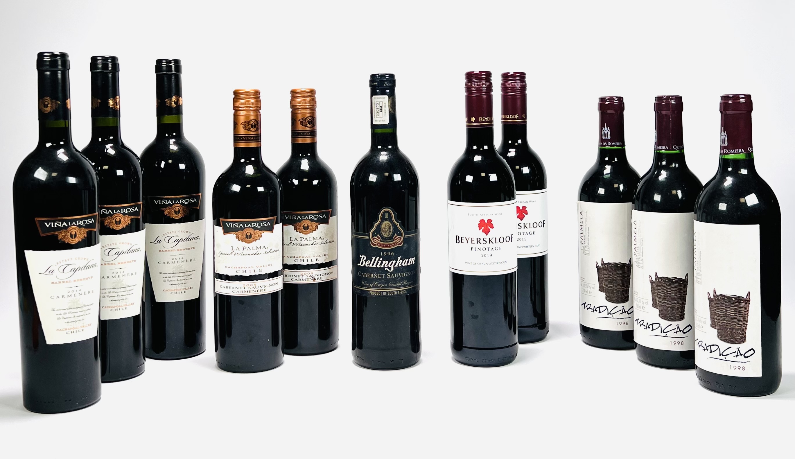 Elf flessen rode wijn waaronder Bellingham, La Palma Chili, Beyerskloof Zuid-Afrika. 21e eeuw. |