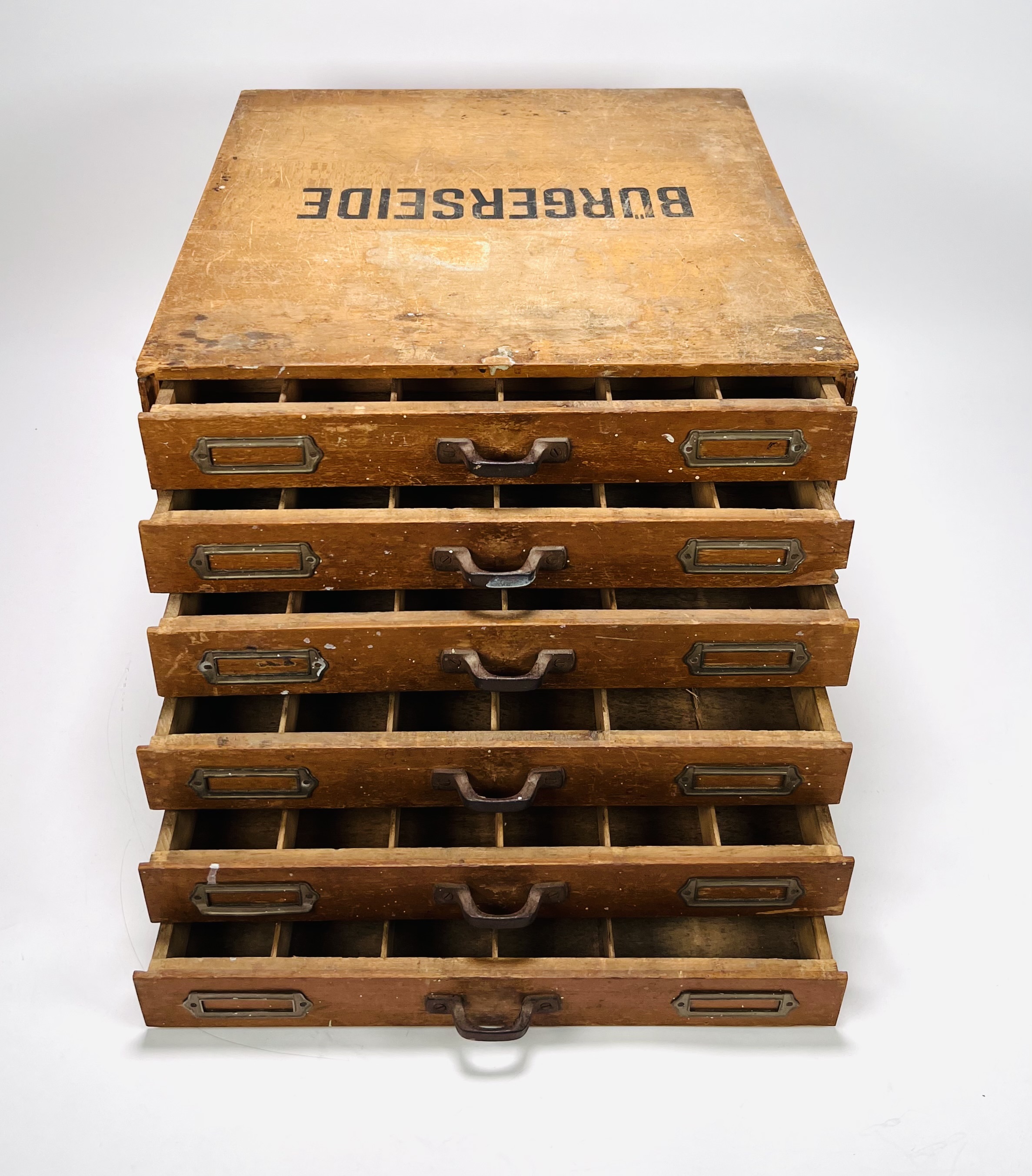 Houten opbergkastje met zes laden voor naaigaren van de firma Bürgerseide. Duitsland, tweede kwart 20e eeuw. |