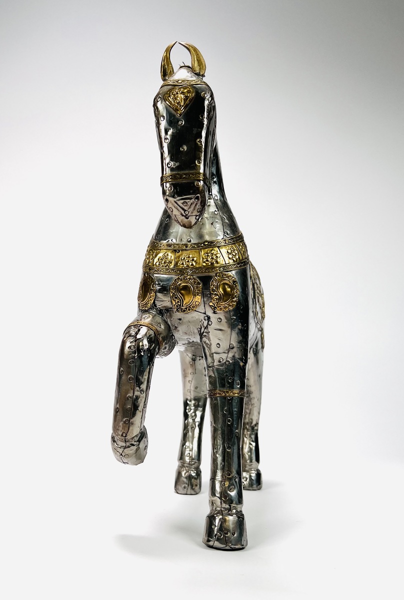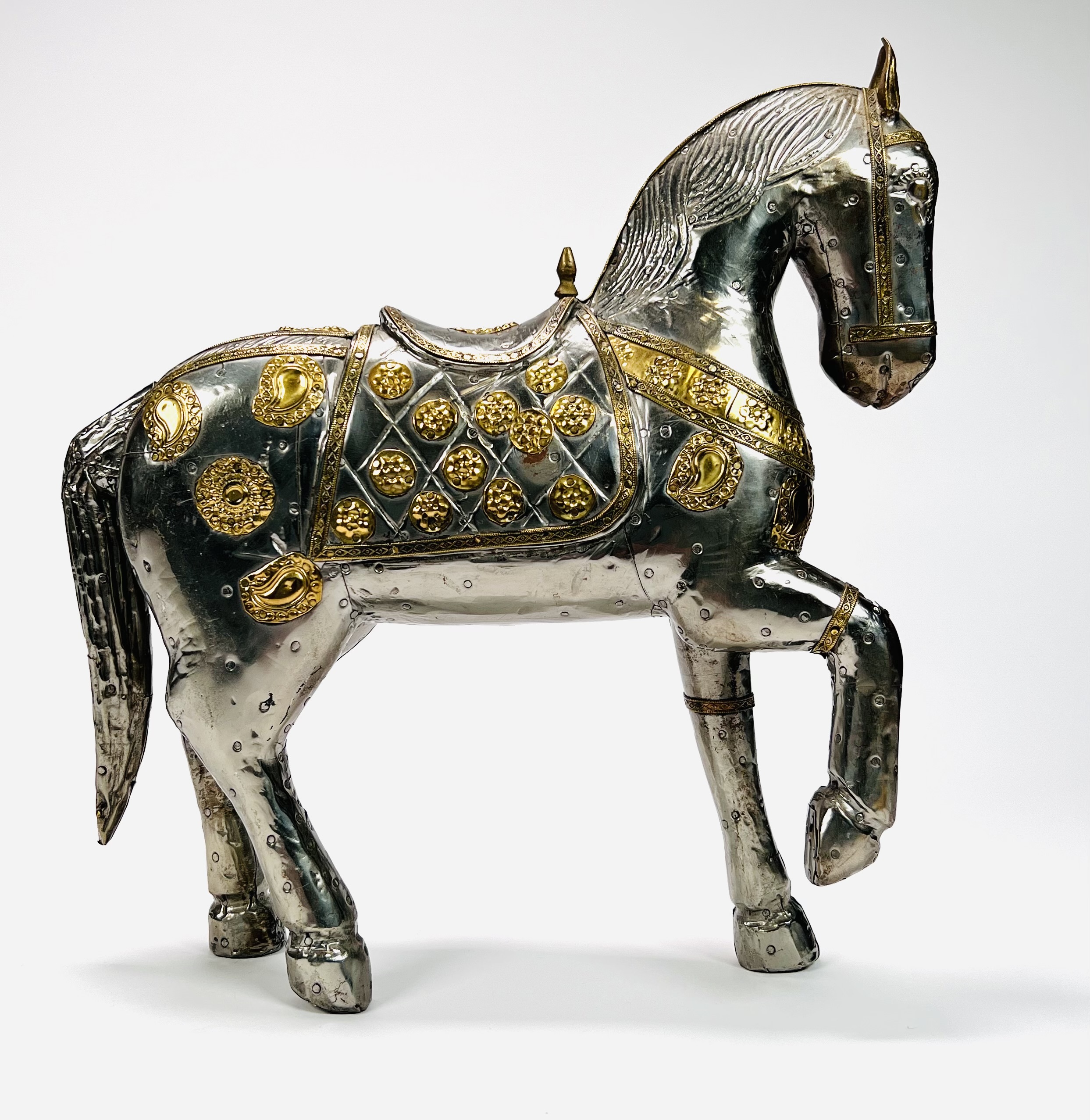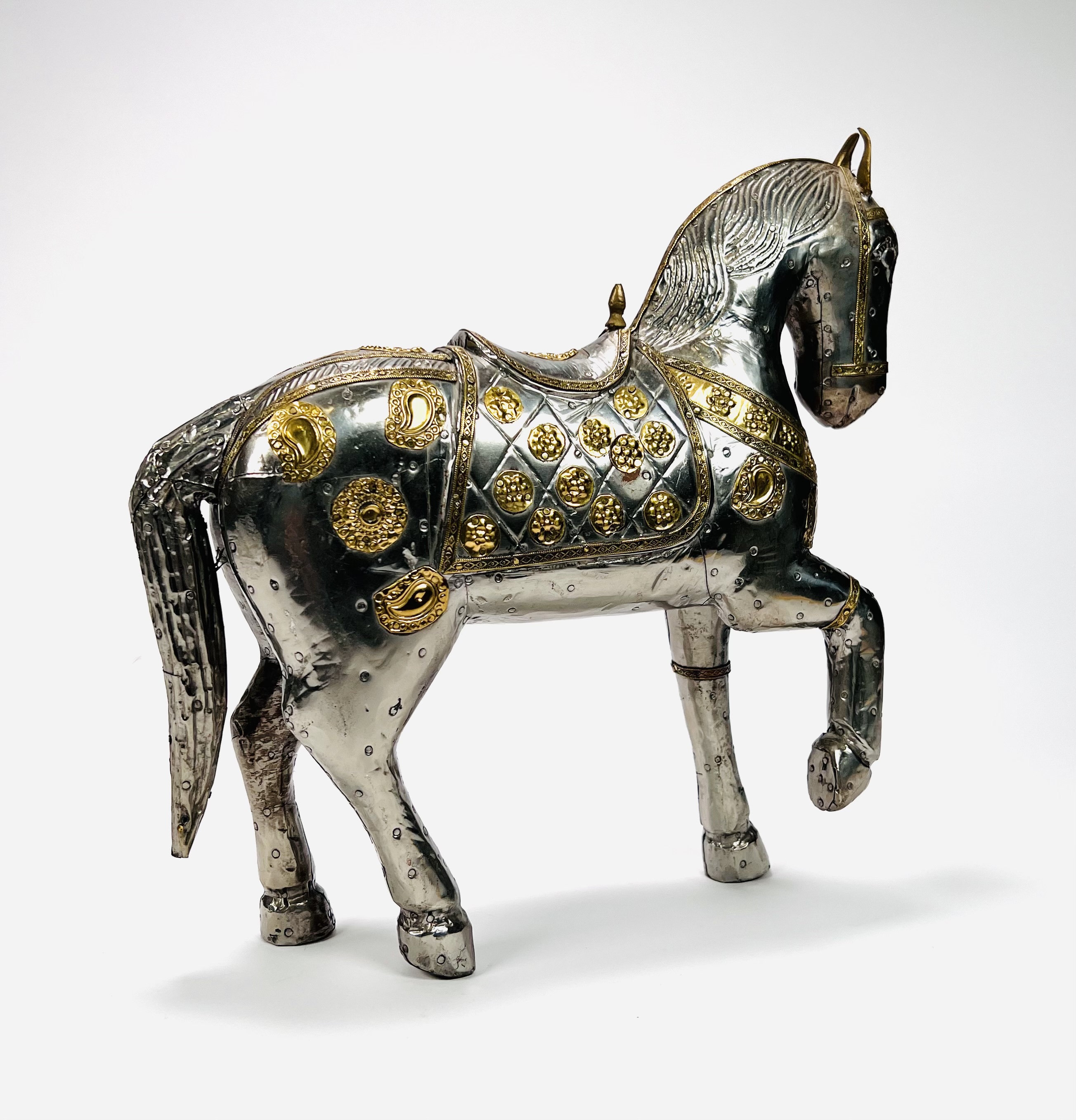 Houten paard beslagen met blik- en messing ornamenten. India, eind 20e eeuw. |