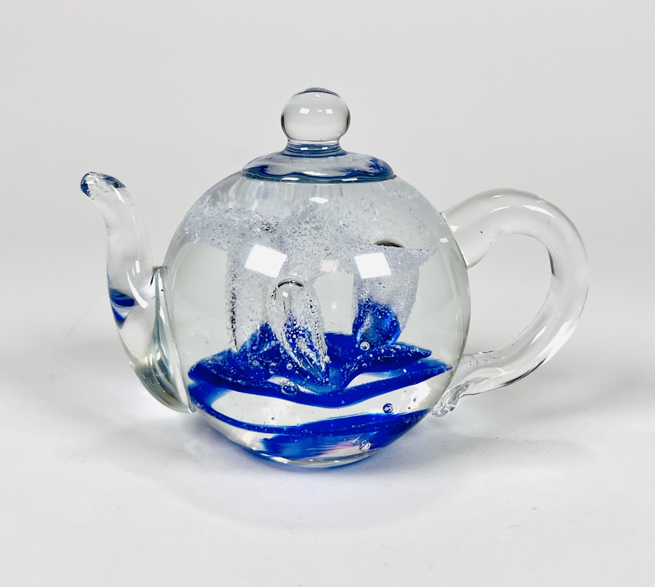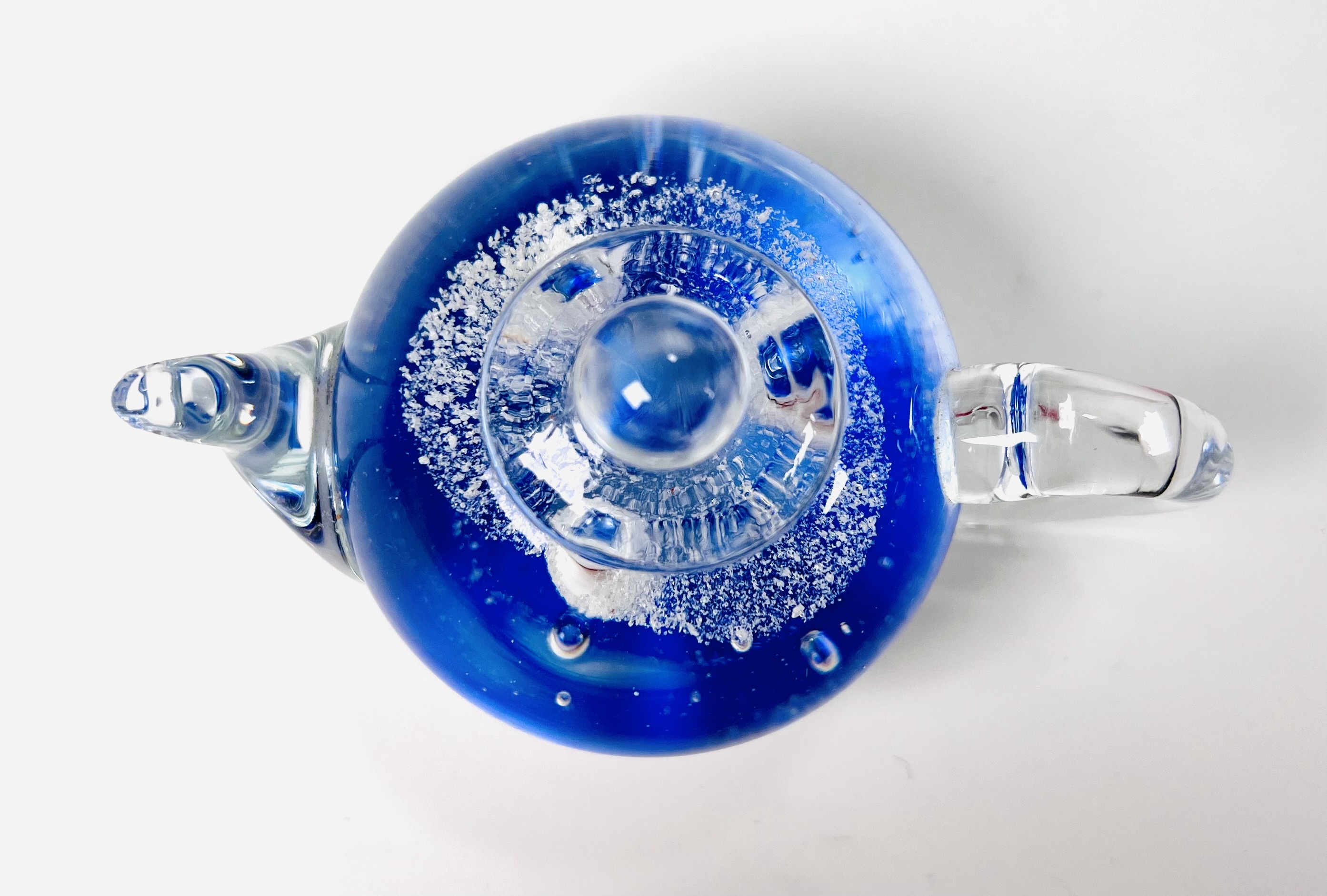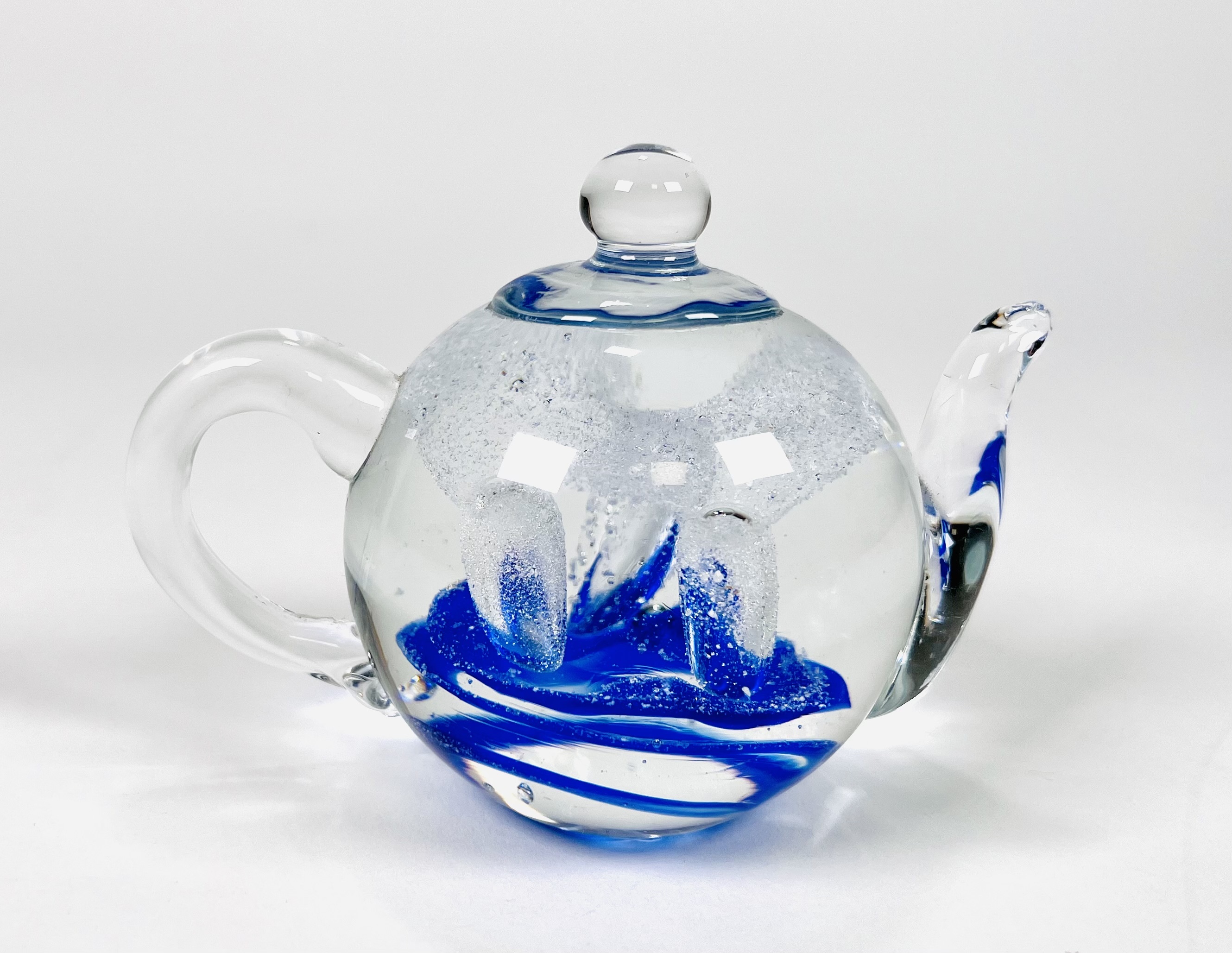 Kristallen presse-papier in de vorm van een theepot met ingesloten blauwe werveling en luchtbellen, gefabriceerd door Edinburgh Glass. Schotland, eind 20e eeuw. |