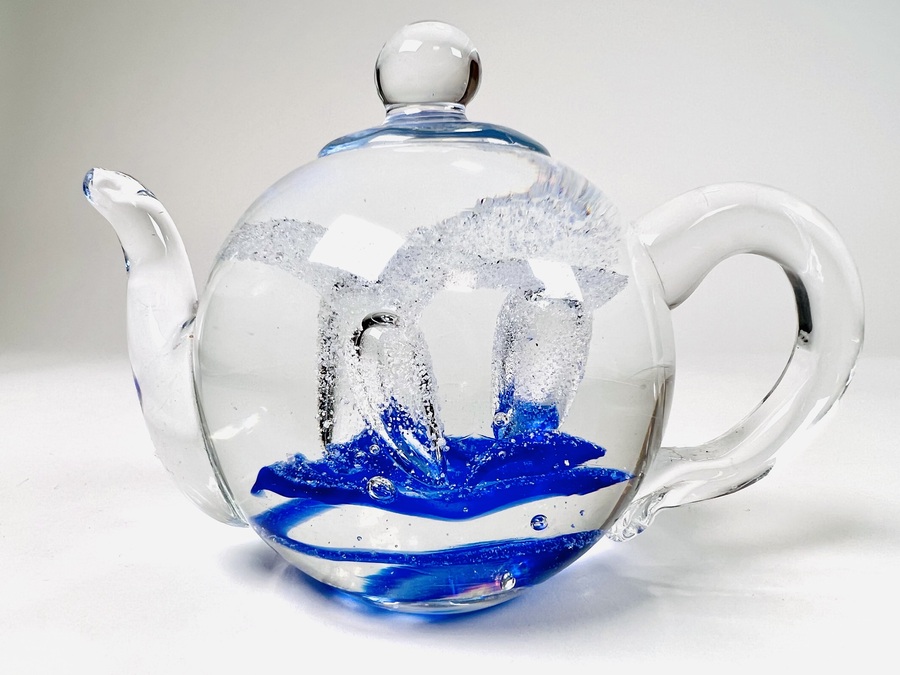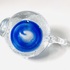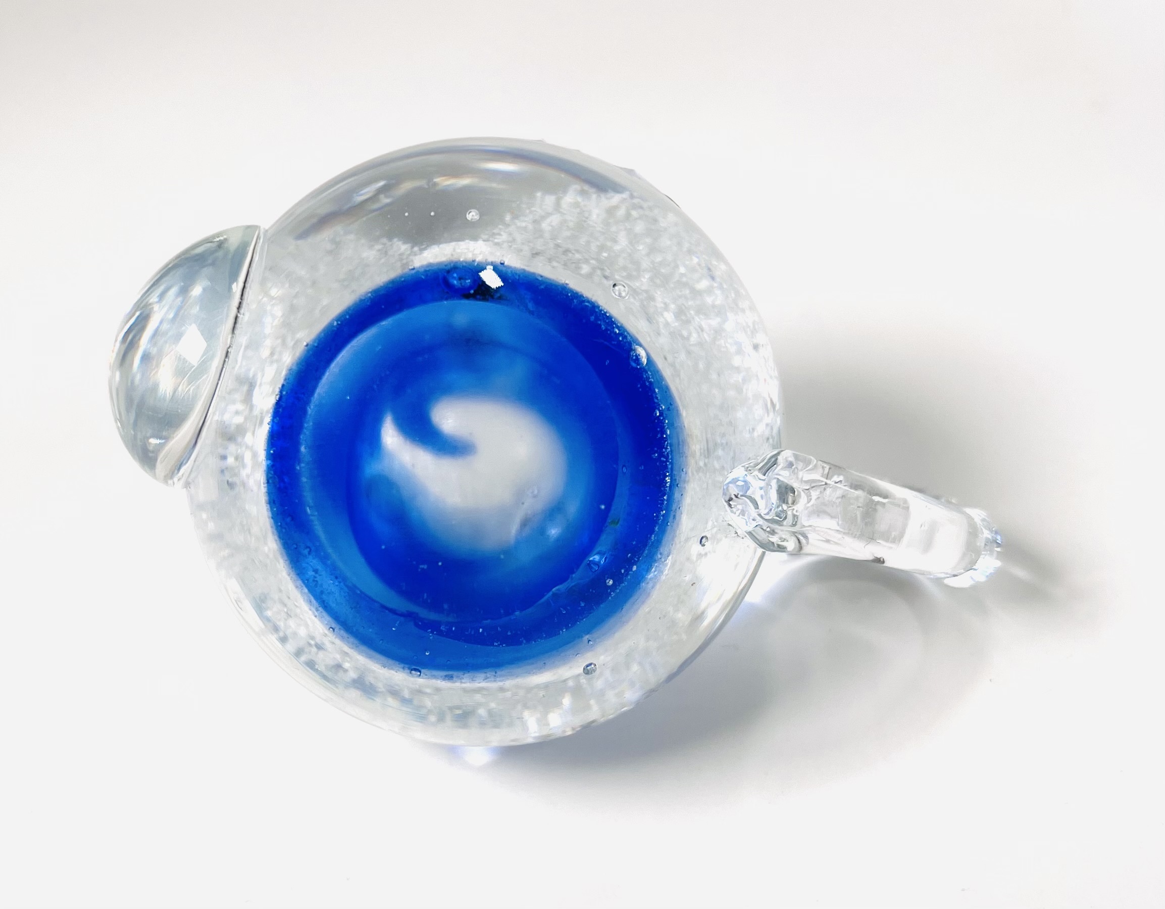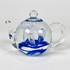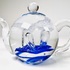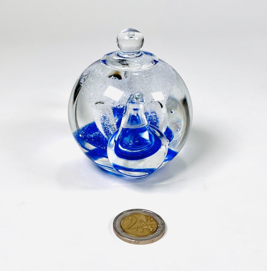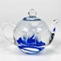 Kristallen presse-papier in de vorm van een theepot met ingesloten blauwe werveling en luchtbellen, gefabriceerd door Edinburgh Glass. Schotland, eind 20e eeuw. |