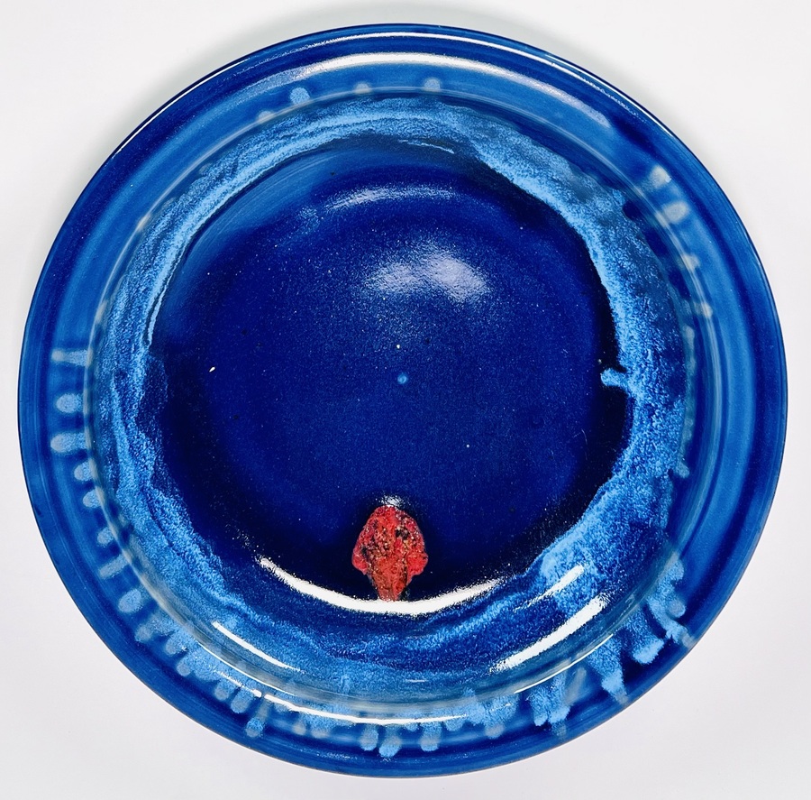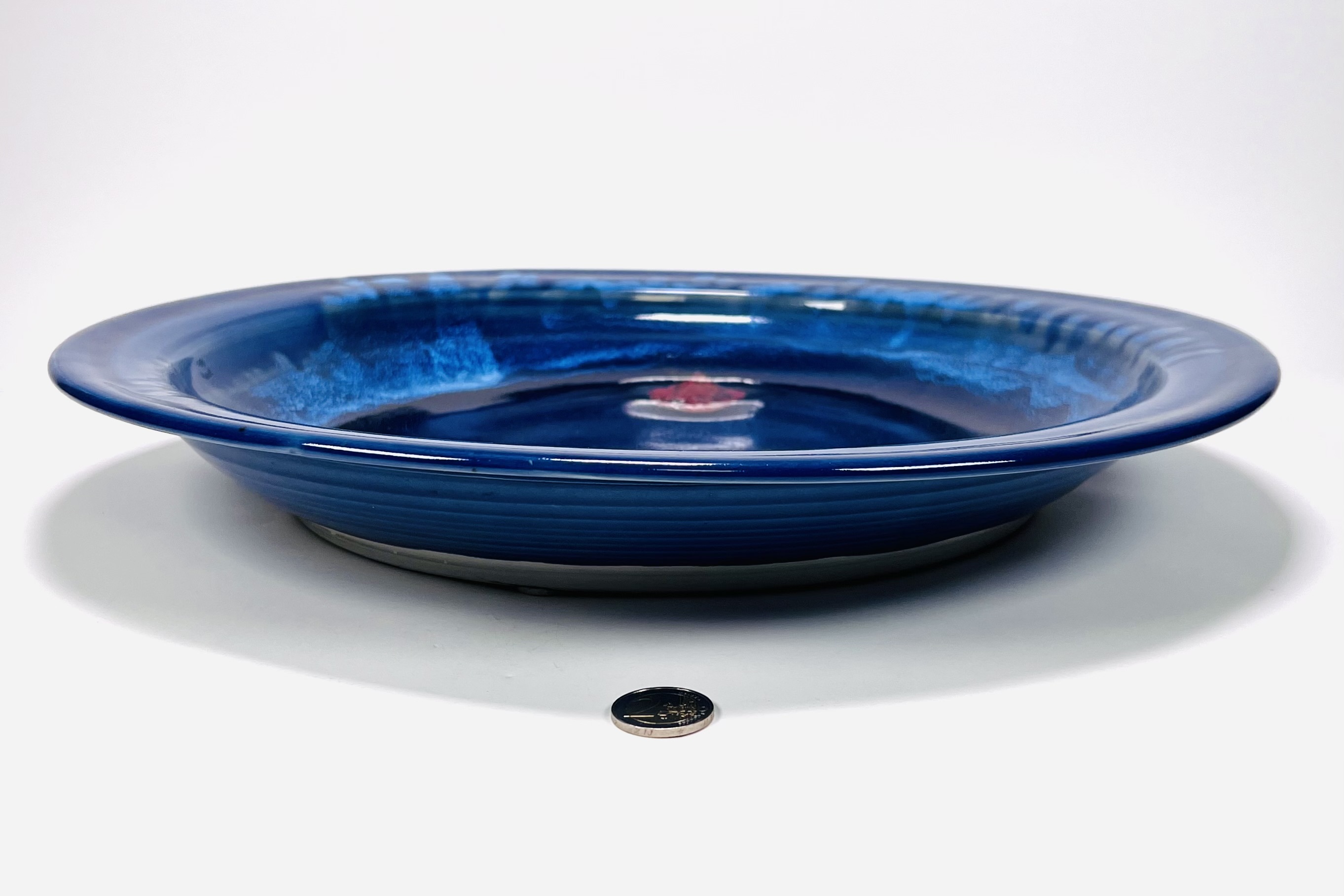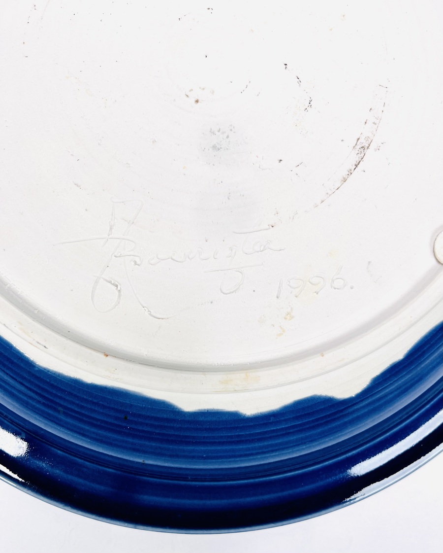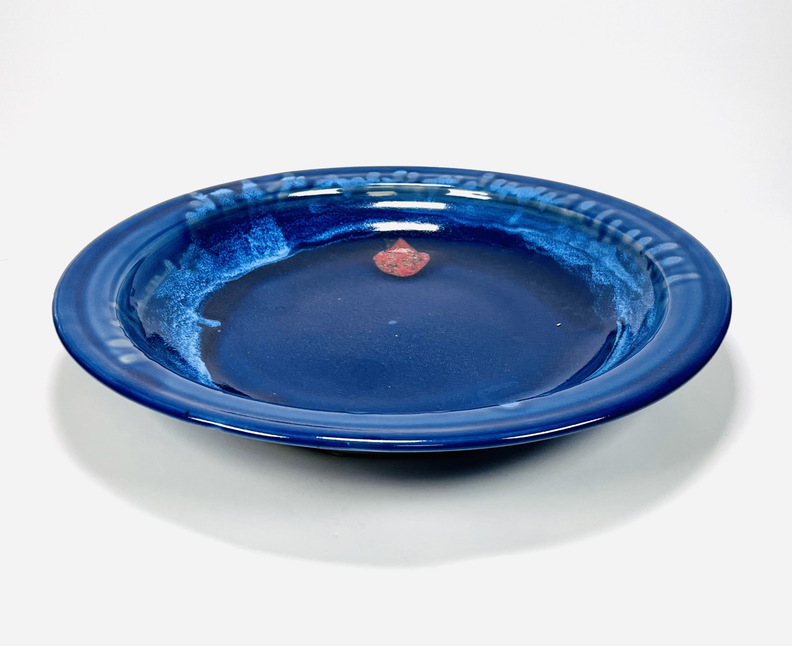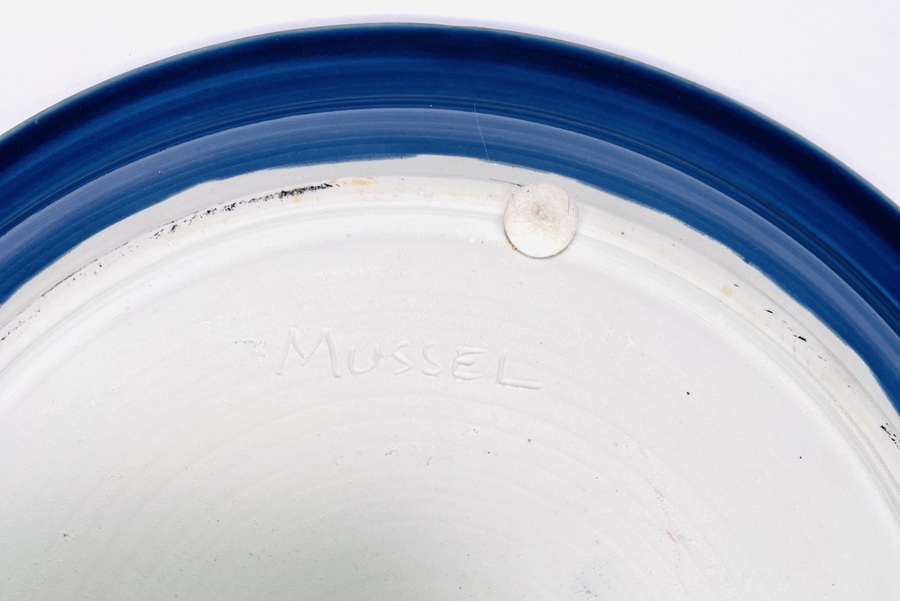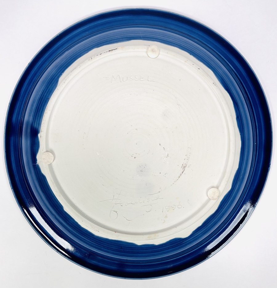 Blauwe geglazuurde aardewerken schaal met een roodbruin element door Johan Alexander (Han) Boerrigter (Nijmegen 1935-2023). Vermelding aan de onderzijde Mussel, volledige naam en datering 1996. |