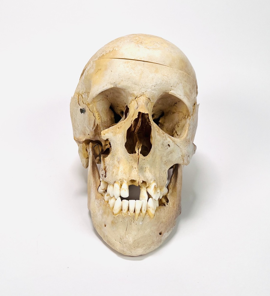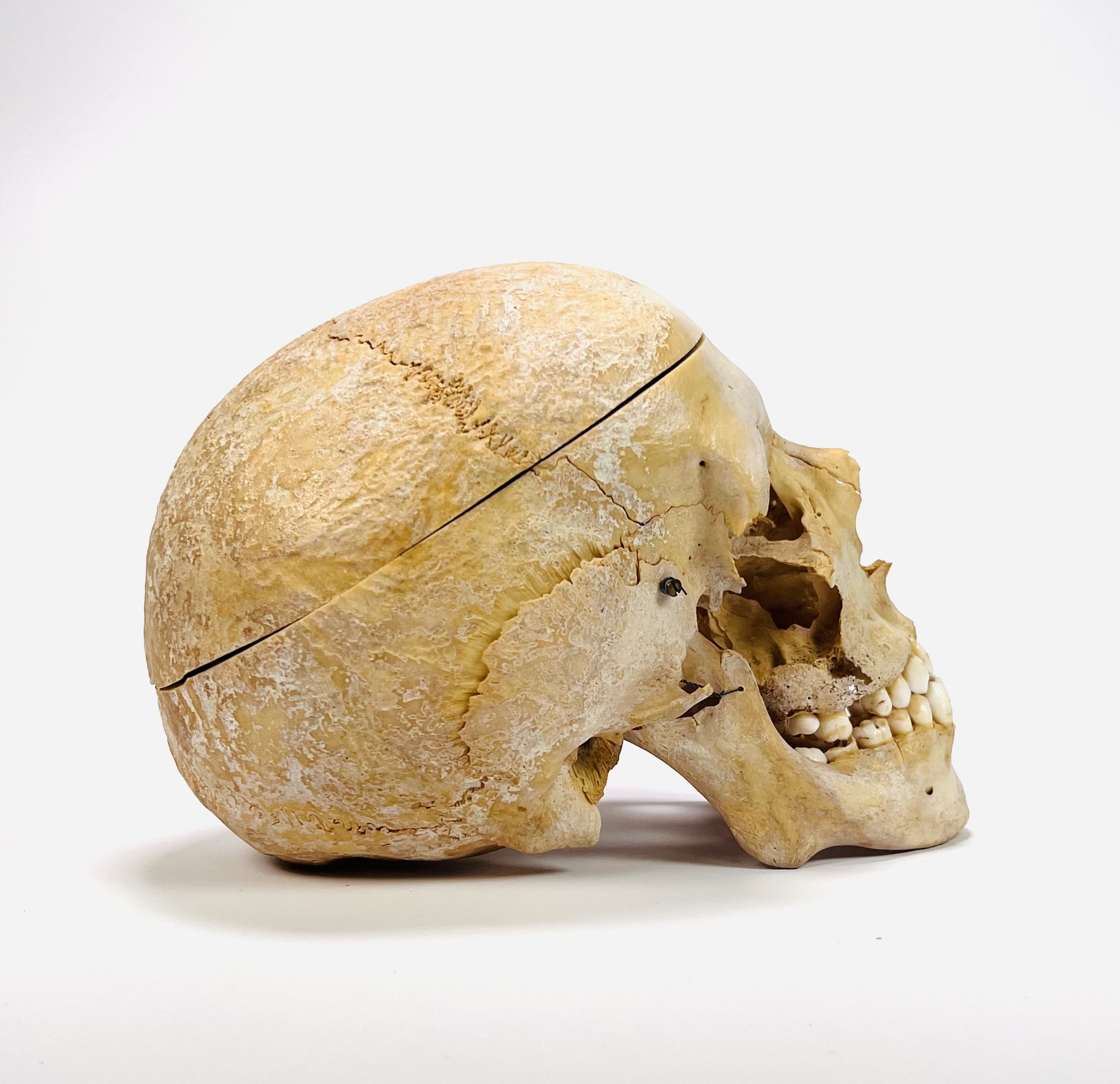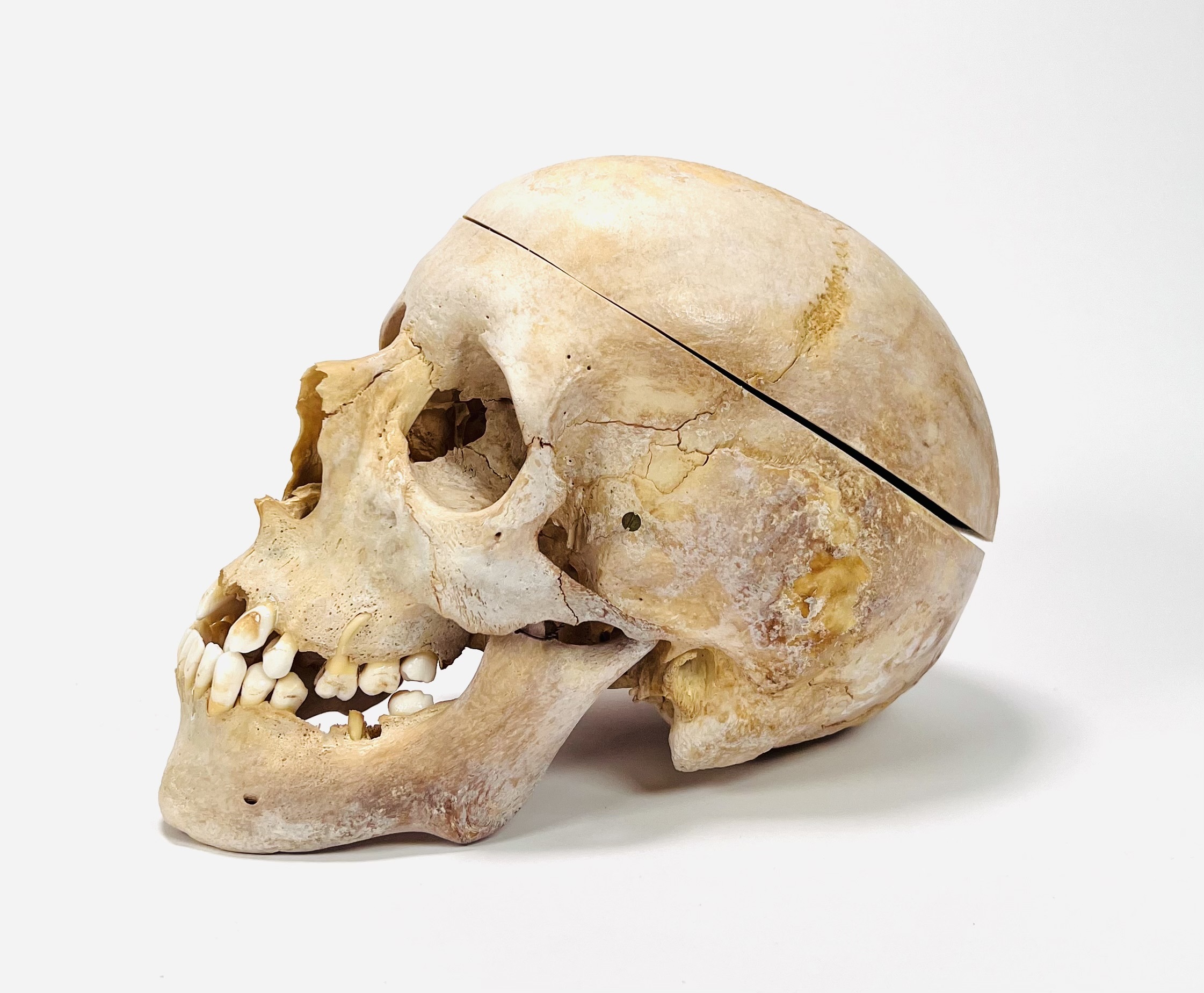 Anatomische menselijk schedel met onderkaak van een volwassen vrouw, afneembaar schedeldak en alle schedelnaden duidelijk zichtbaar. Omstreeks 1900. |