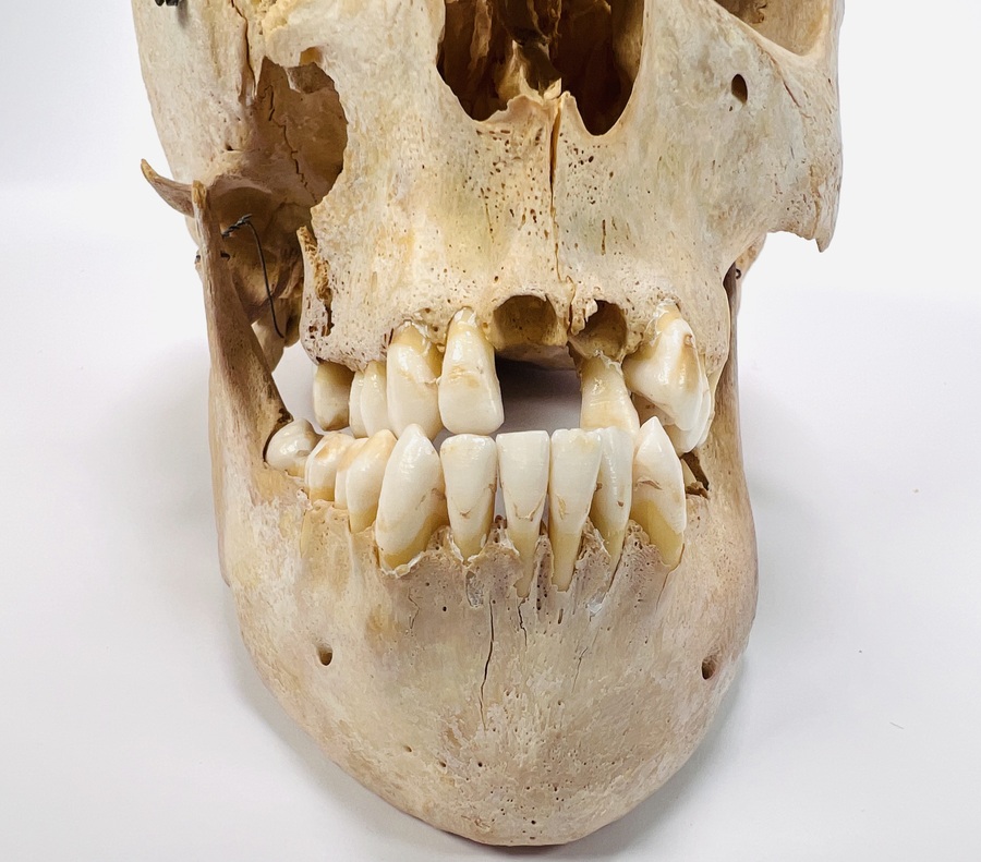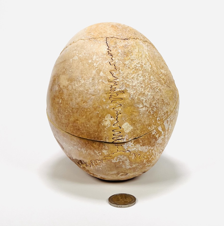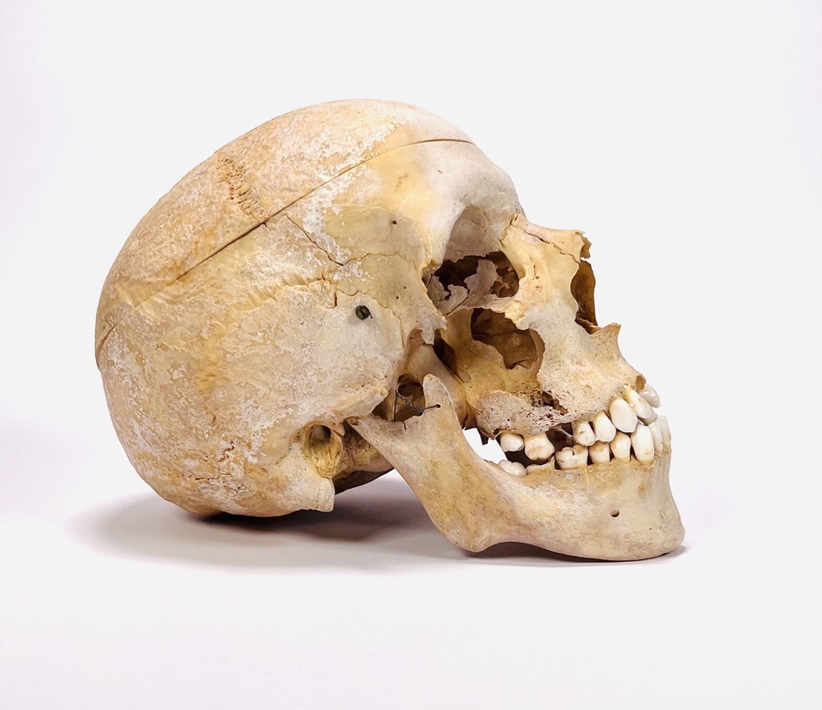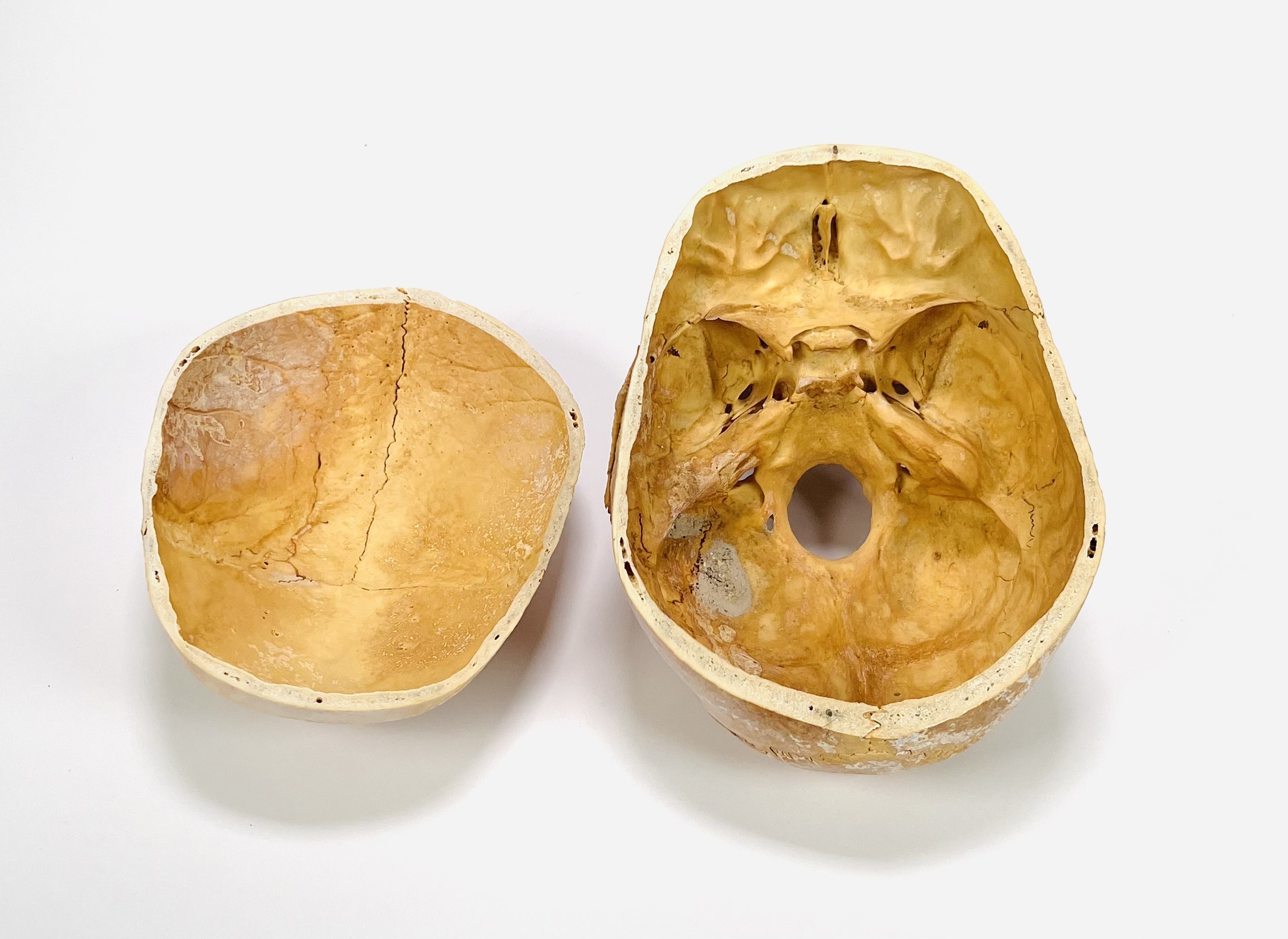 Anatomische menselijk schedel met onderkaak van een volwassen vrouw, afneembaar schedeldak en alle schedelnaden duidelijk zichtbaar. Omstreeks 1900. |