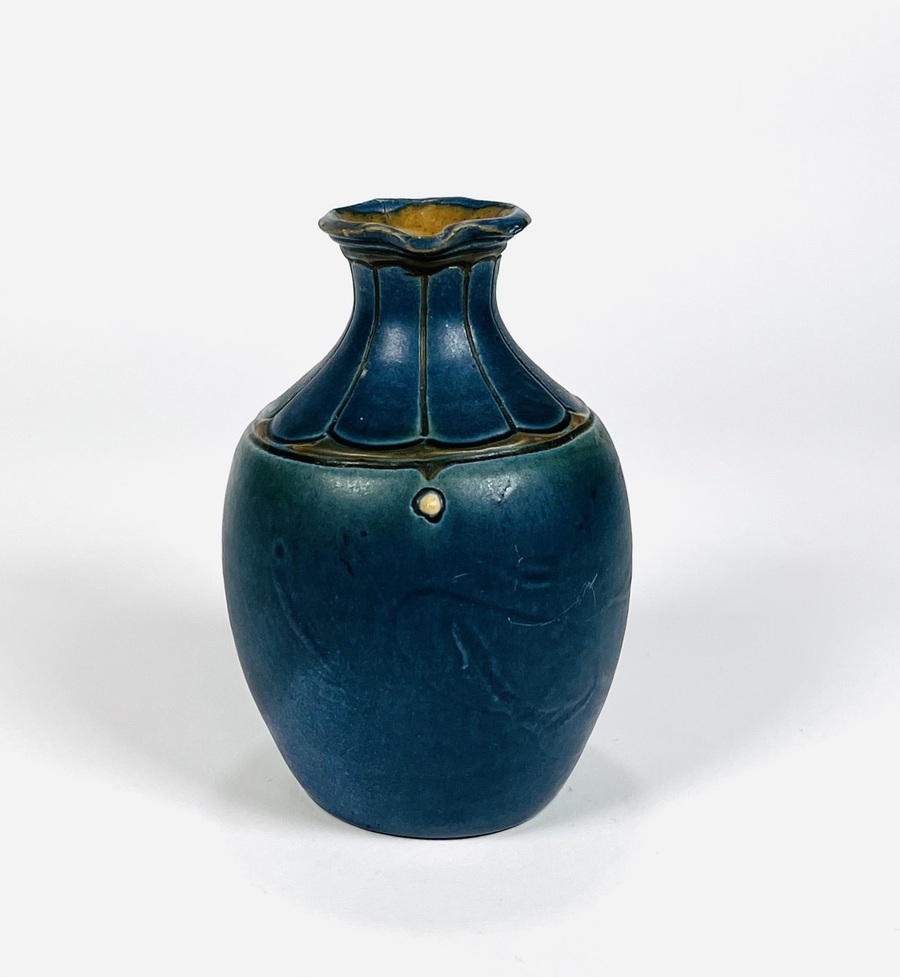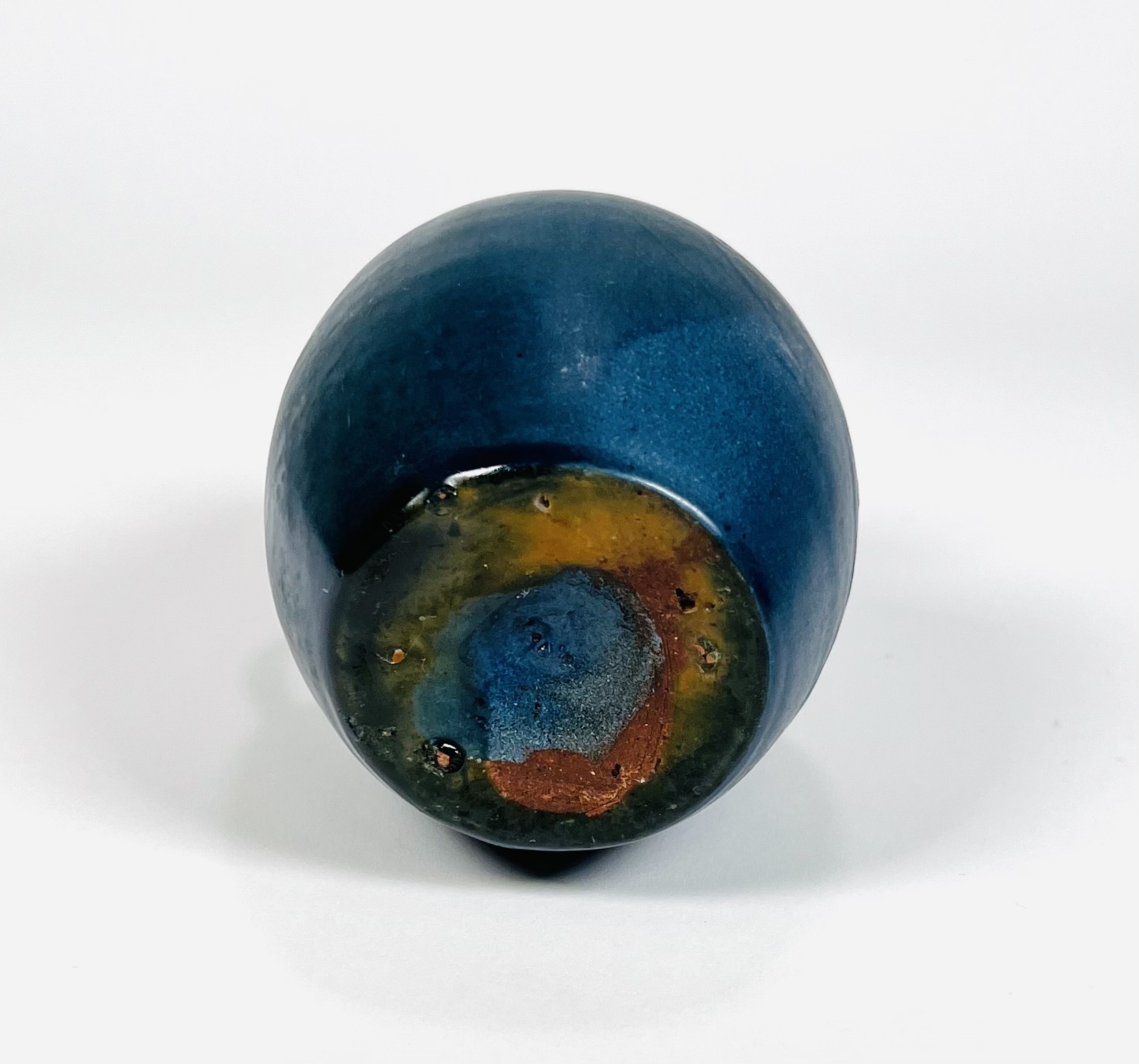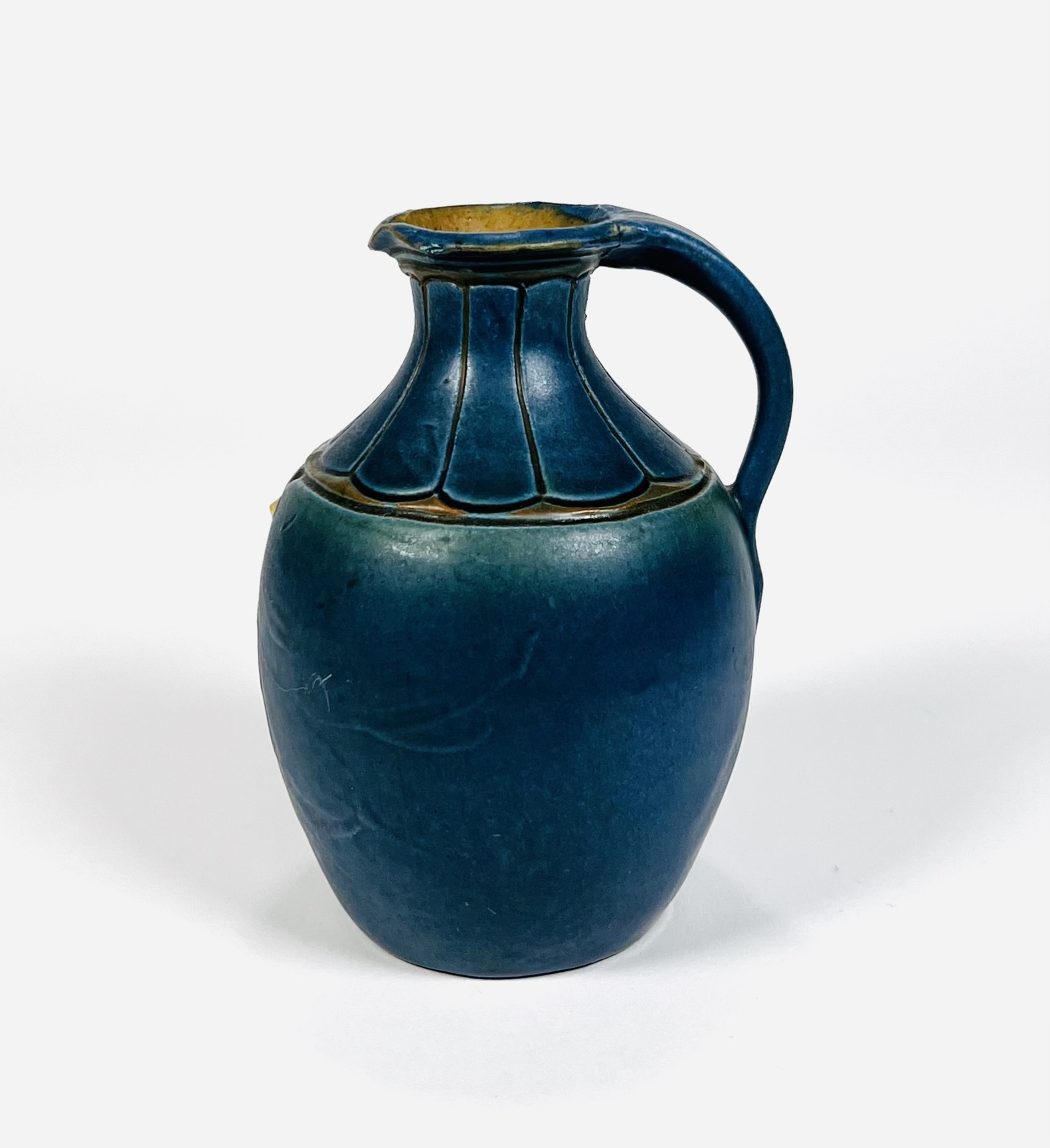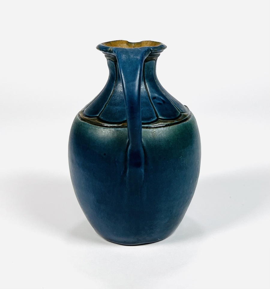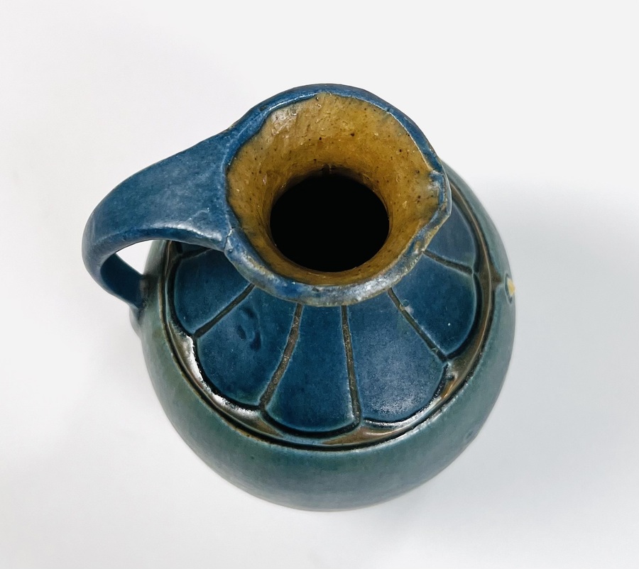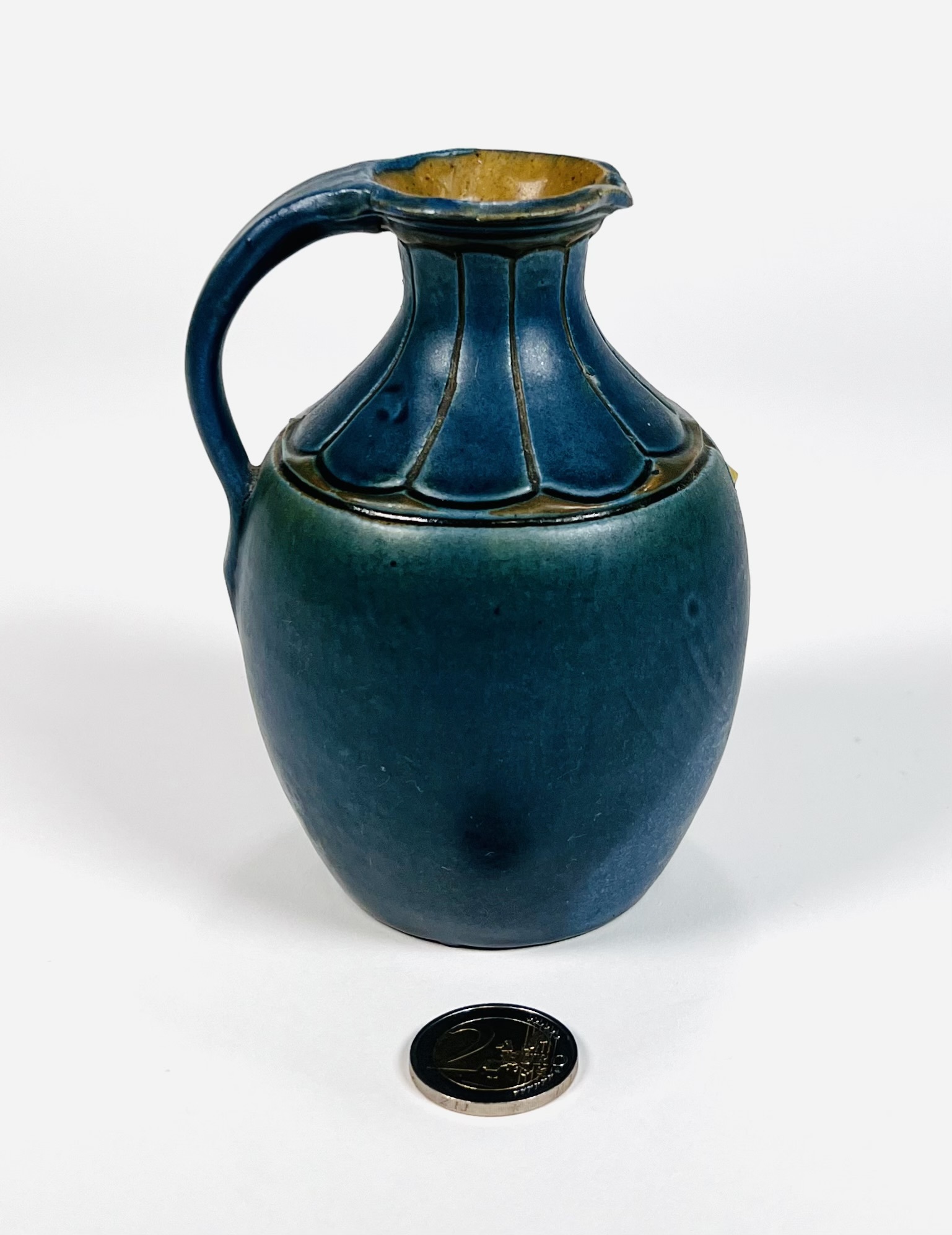 Blauw met groen kleureffect mat geglazuurde Jugendstil schenkkan met crèmekleurige stip, decoratie door Klaas Mobach. Ongesigneerd, Utrecht, omstreeks 1910-1915. |