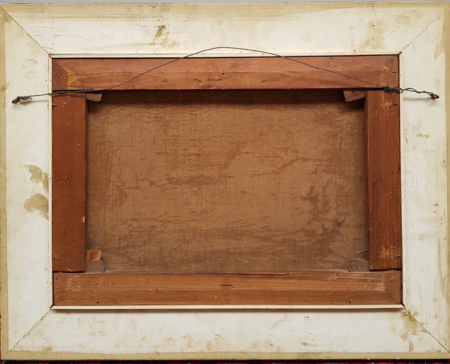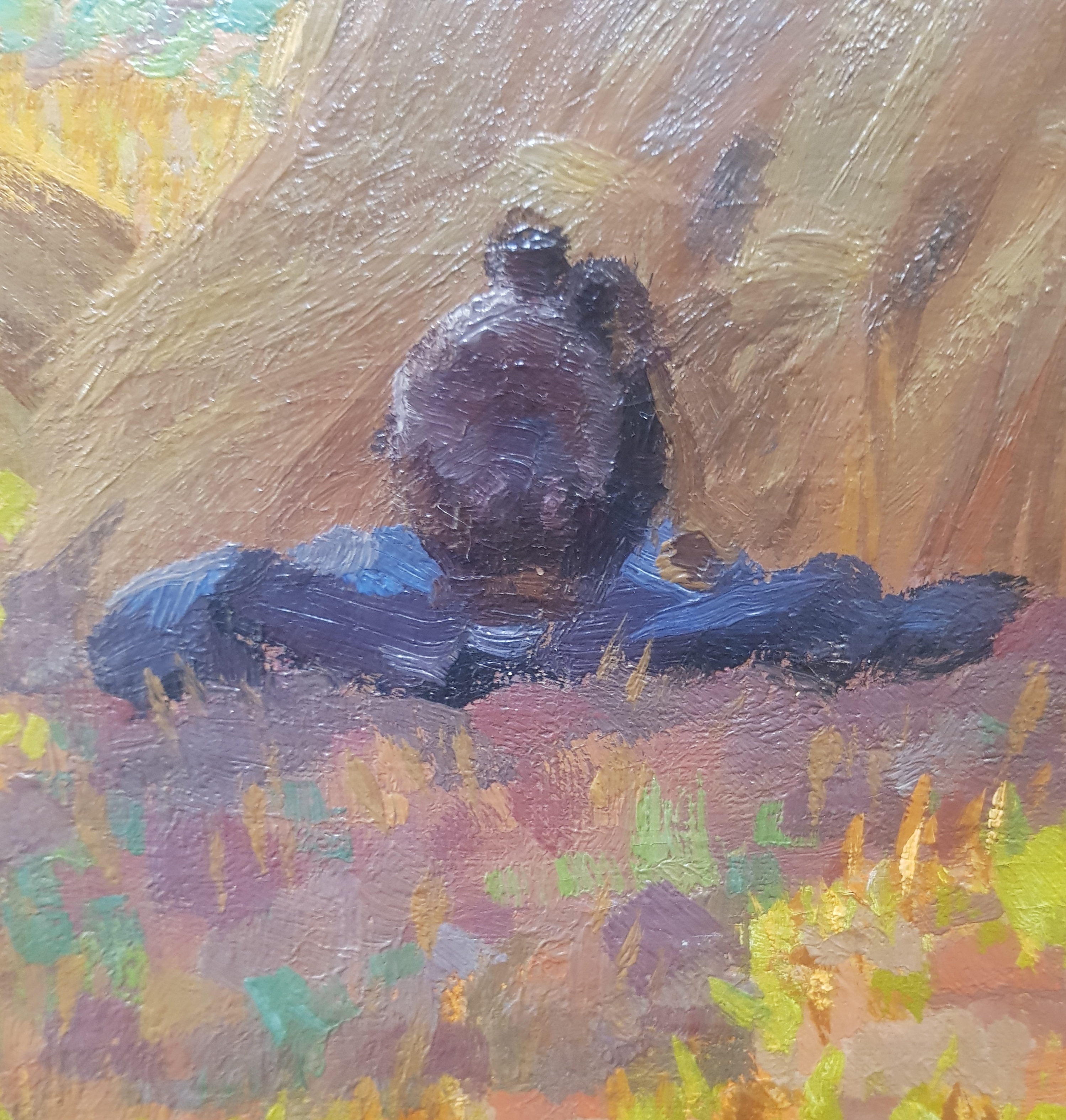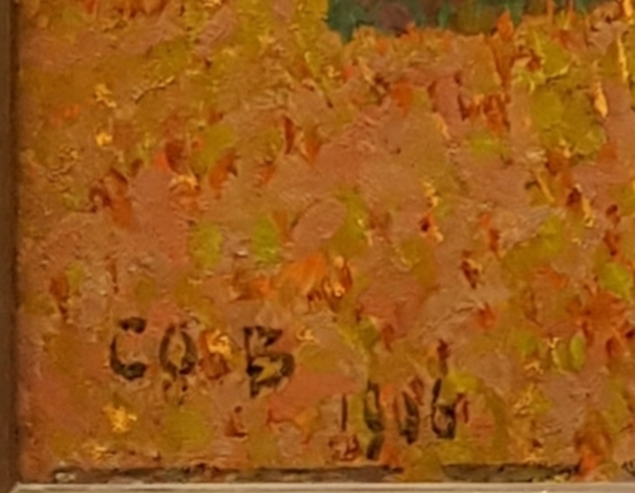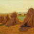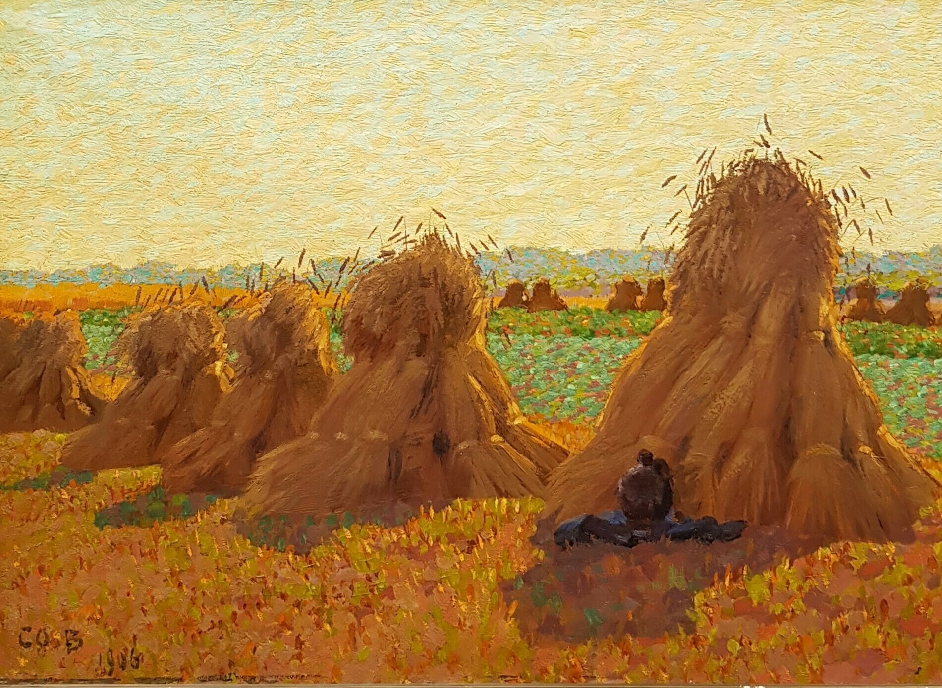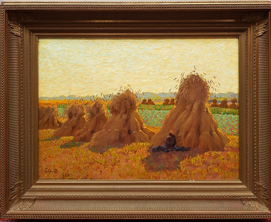Schilderij, landschap met korenschoven, in impressionistische pointillistische stijl door Co Breman (Zwolle 1865-1938 Laren). Olieverfschilderij op linnen, linksonder gesigneerd CO B en gedateerd 1906. |