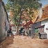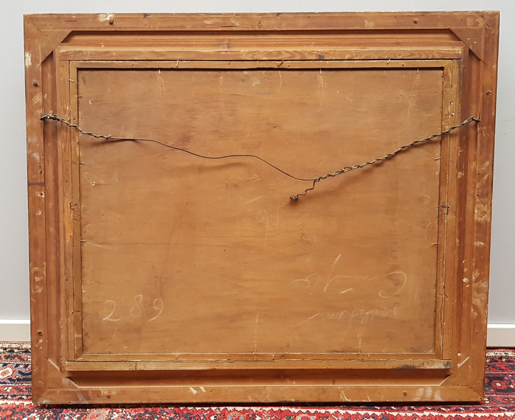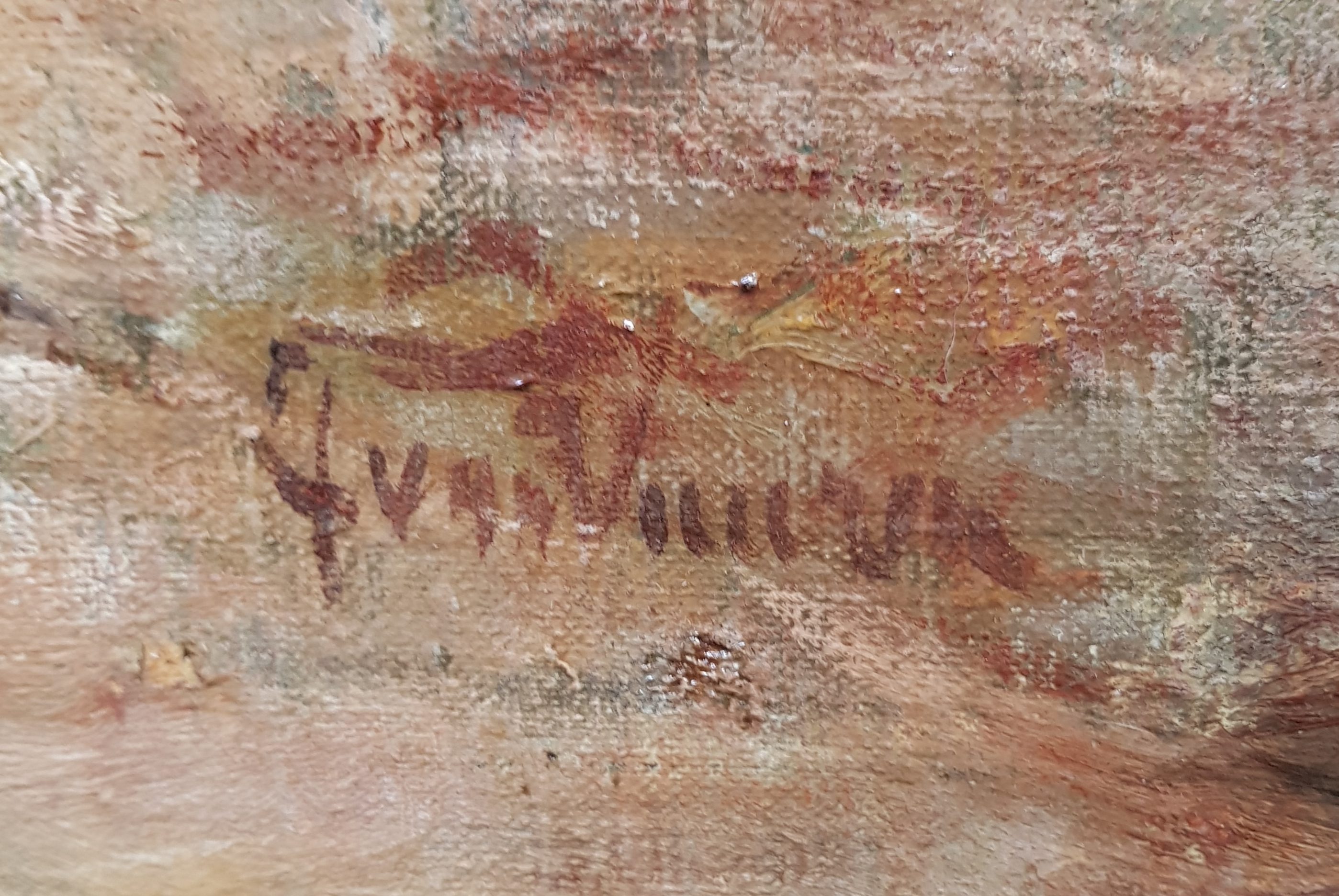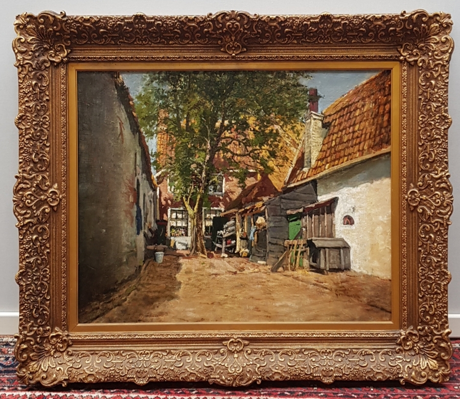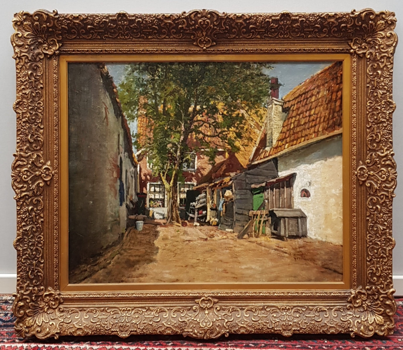 Schilderij van een binnenplaats met boom door Jan van Vuuren (1871-1941). Olieverfschilderij op board, rechtsonder gesigneerd, jaren 20/30. |