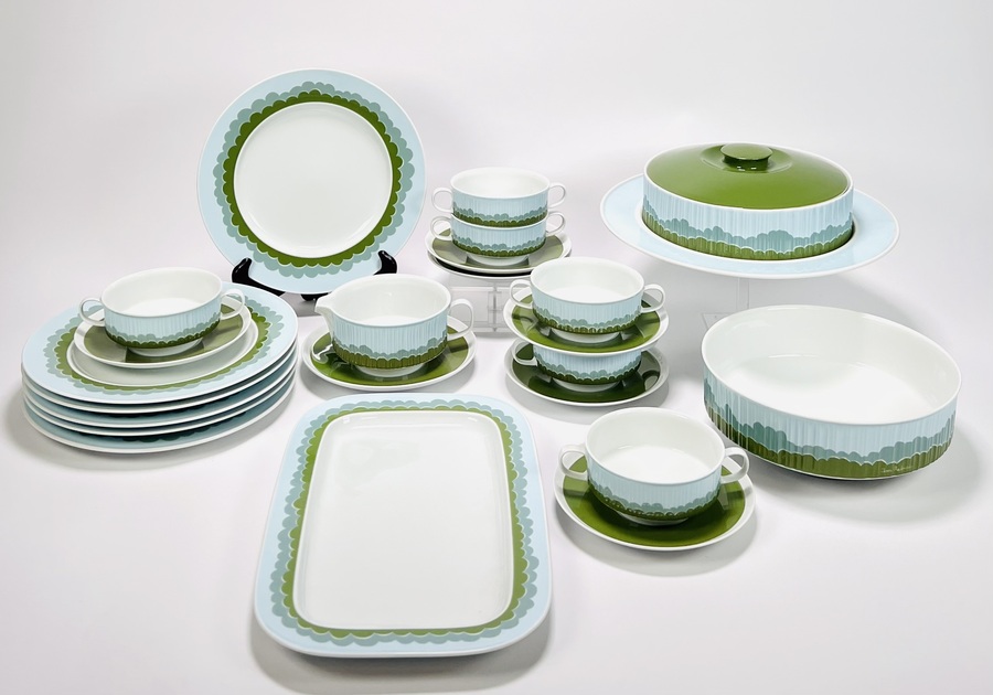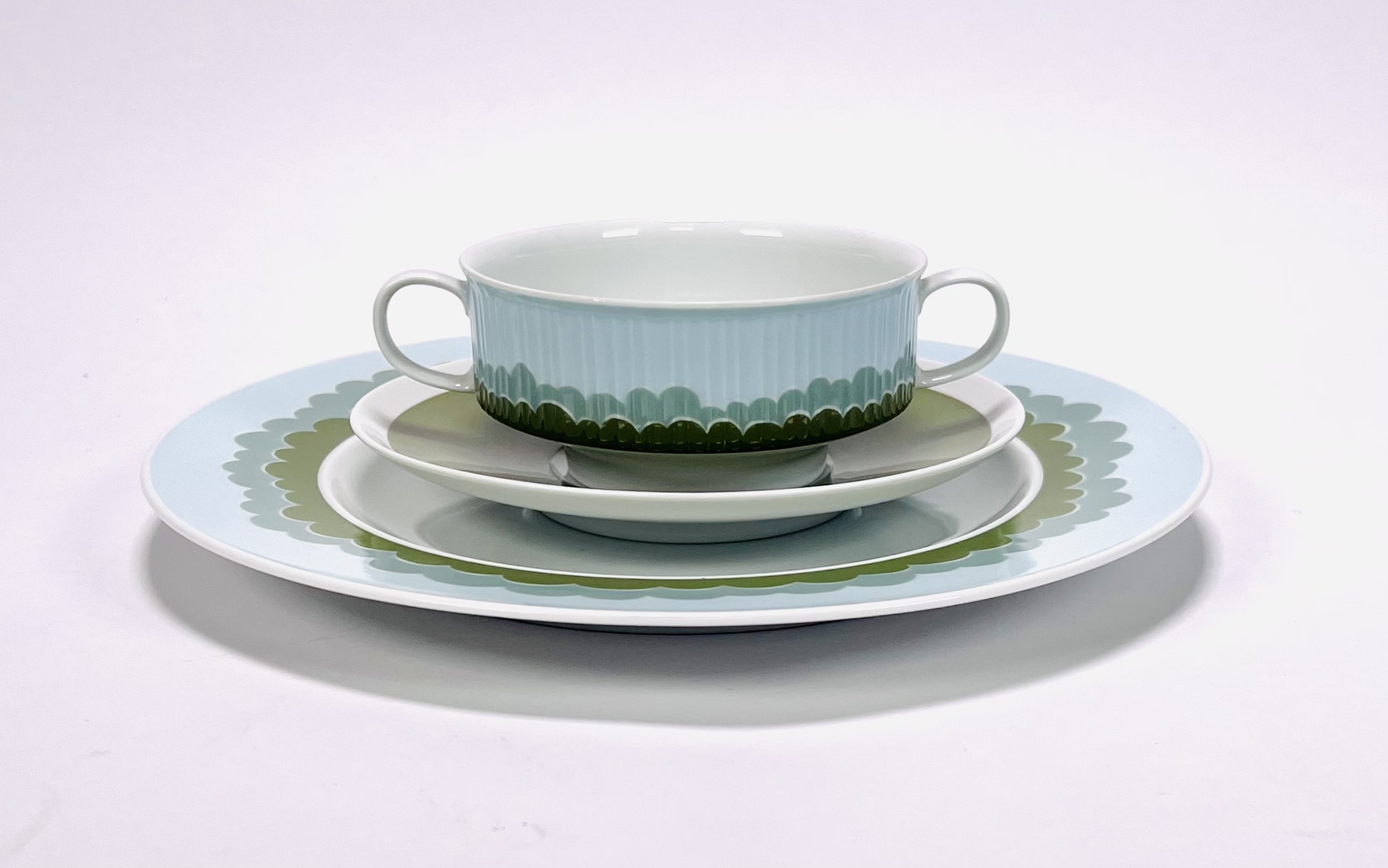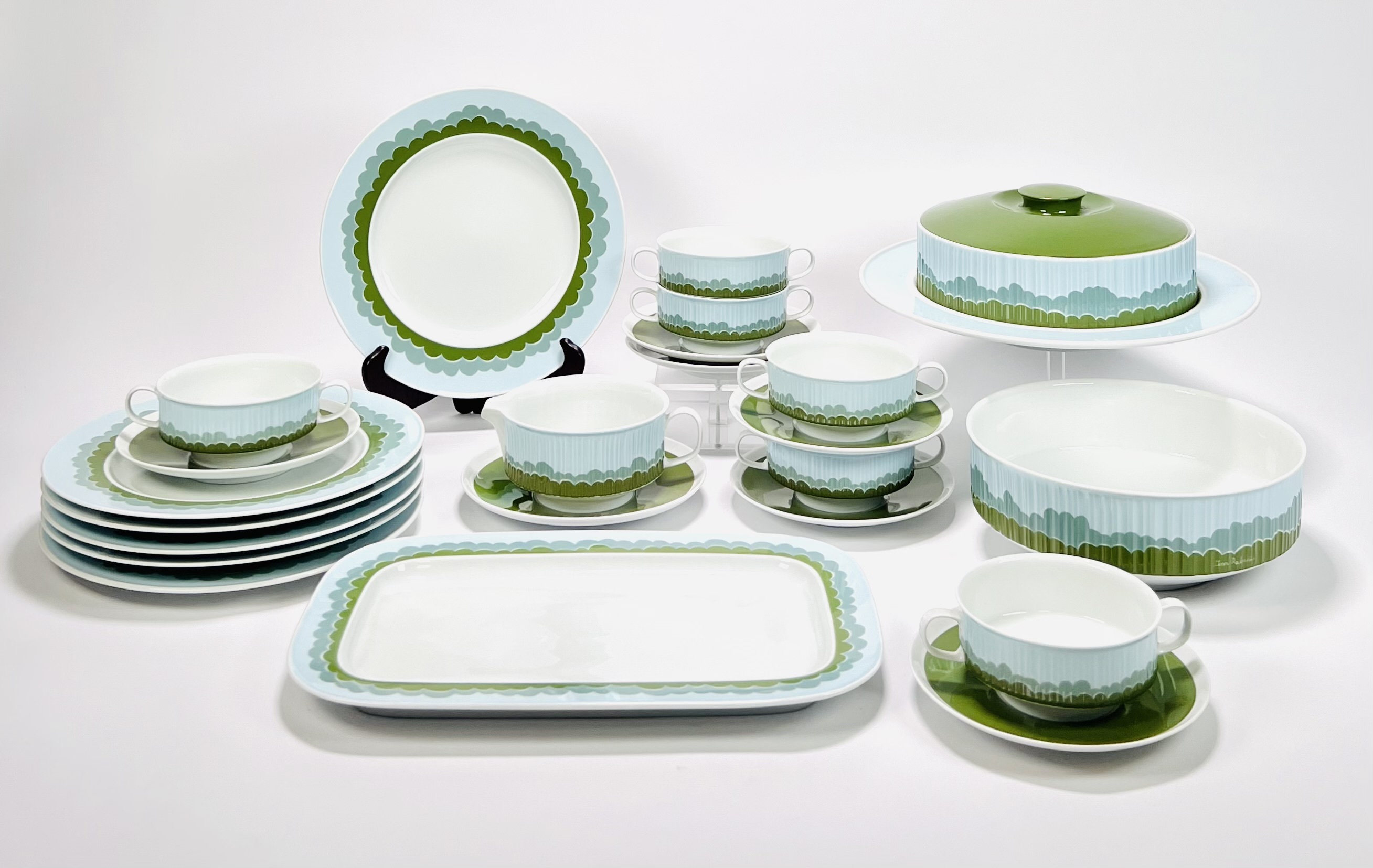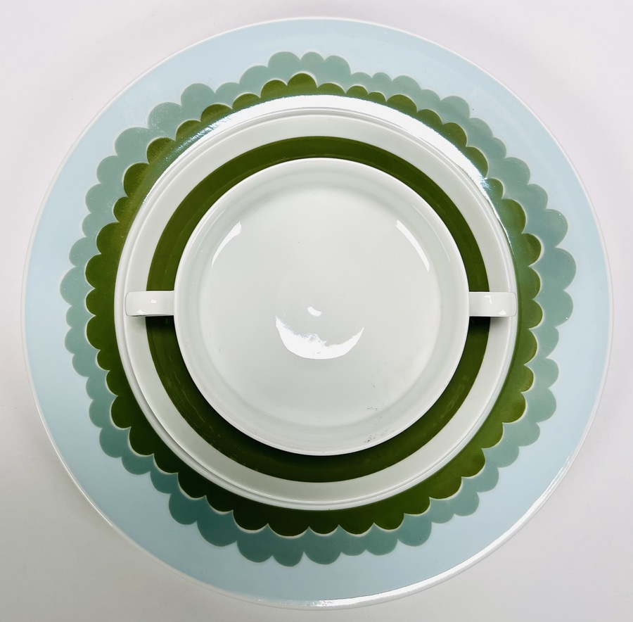 Porseleinen Rosenthal servies met gewolkt patroon uit de Kunstler Sammlung Serie, modelnaam Ljubica en ontworpen door Ivan Rabuzin. Uitgevoerd in de servies vorm Variation, ontworpen door Tapio Wirkkala. Duitsland, eind jaren 70. |