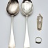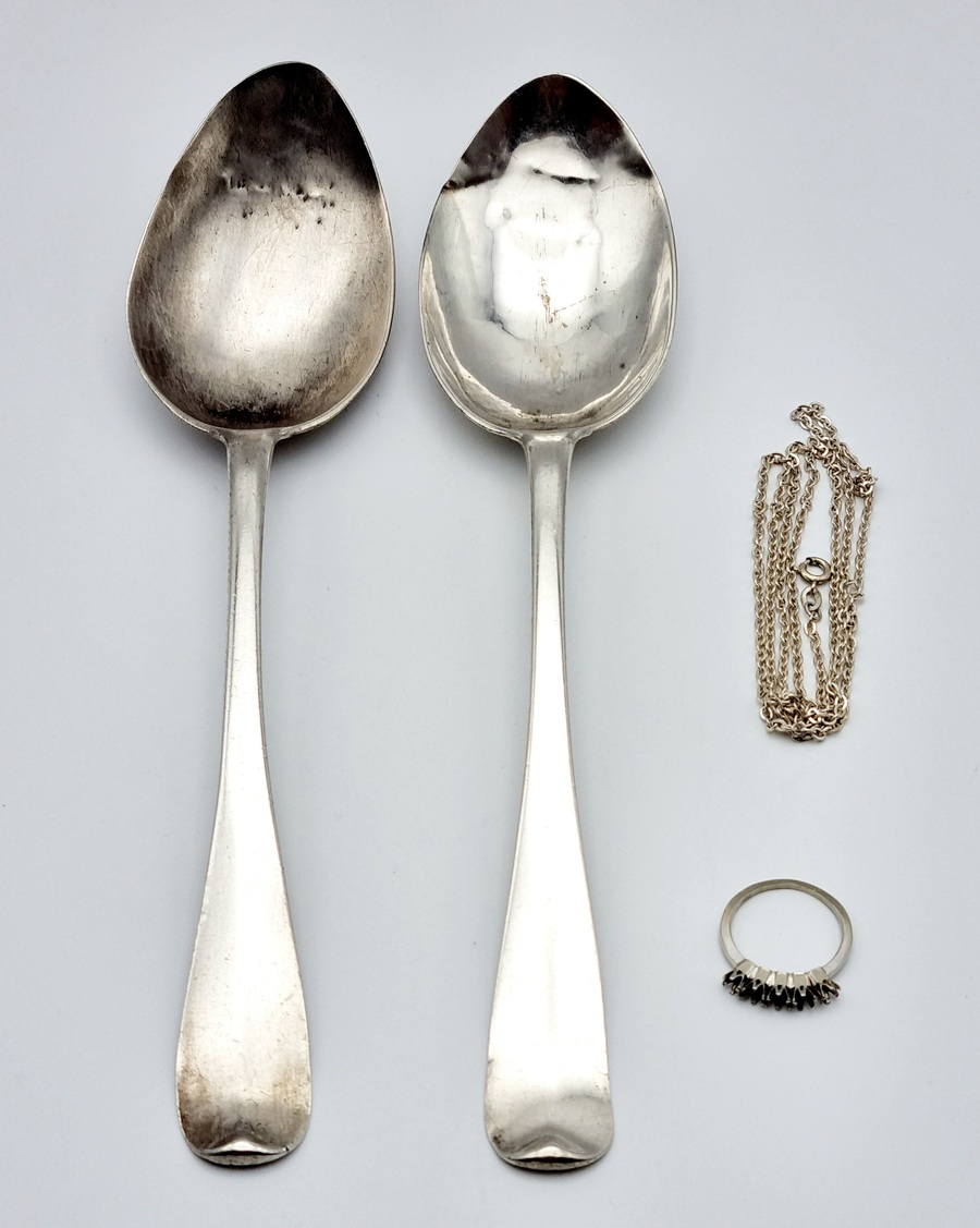 Twee zilveren lepels, tweede gehalte zilver gemerkt (lopende leeuw 2). Een ring, witgoud gemerkt eikenblad en een zilveren tweede gehalte ketting gemerkt ZII. |