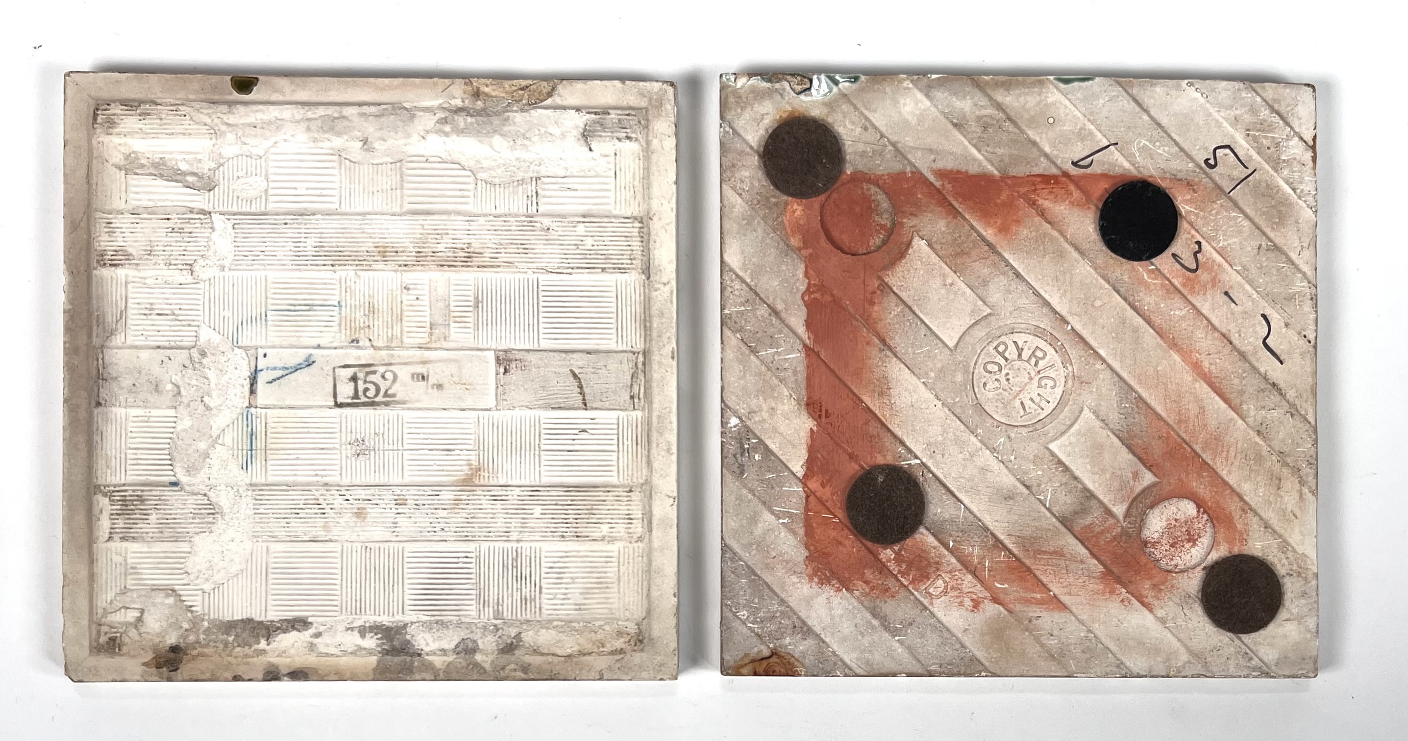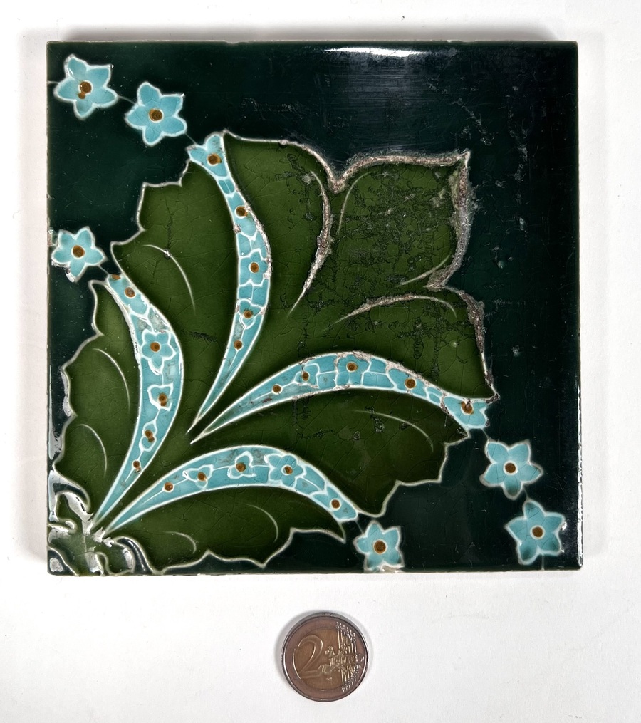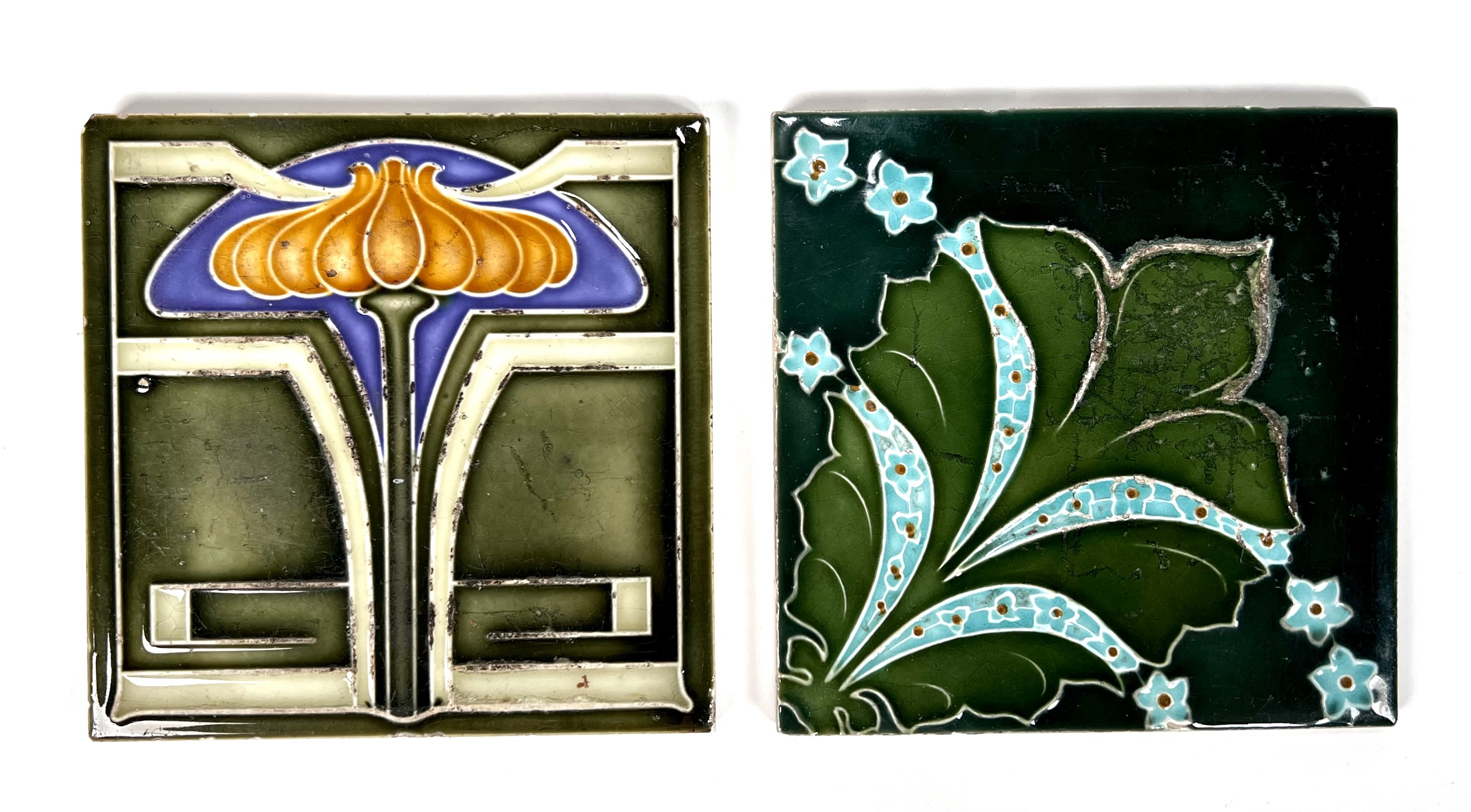 Twee keramieken Art Nouveau wandtegels, een groene tegel met gestileerde bloem van Duitse herkomst en een groene tegel met blad en florale elementen uit Engeland. Aan de achterzijde gemerkt met modelnummer en Copyright England. Eerste kwart 20e eeuw. |