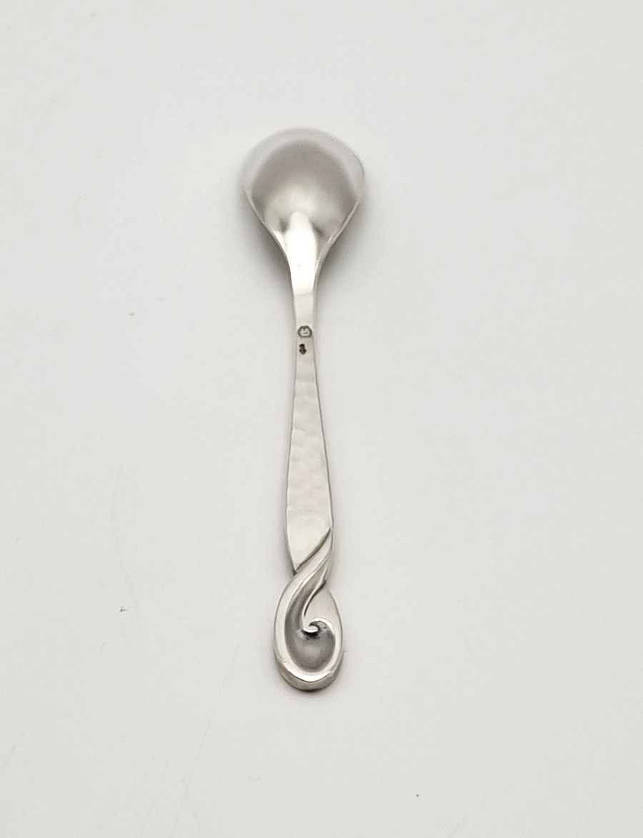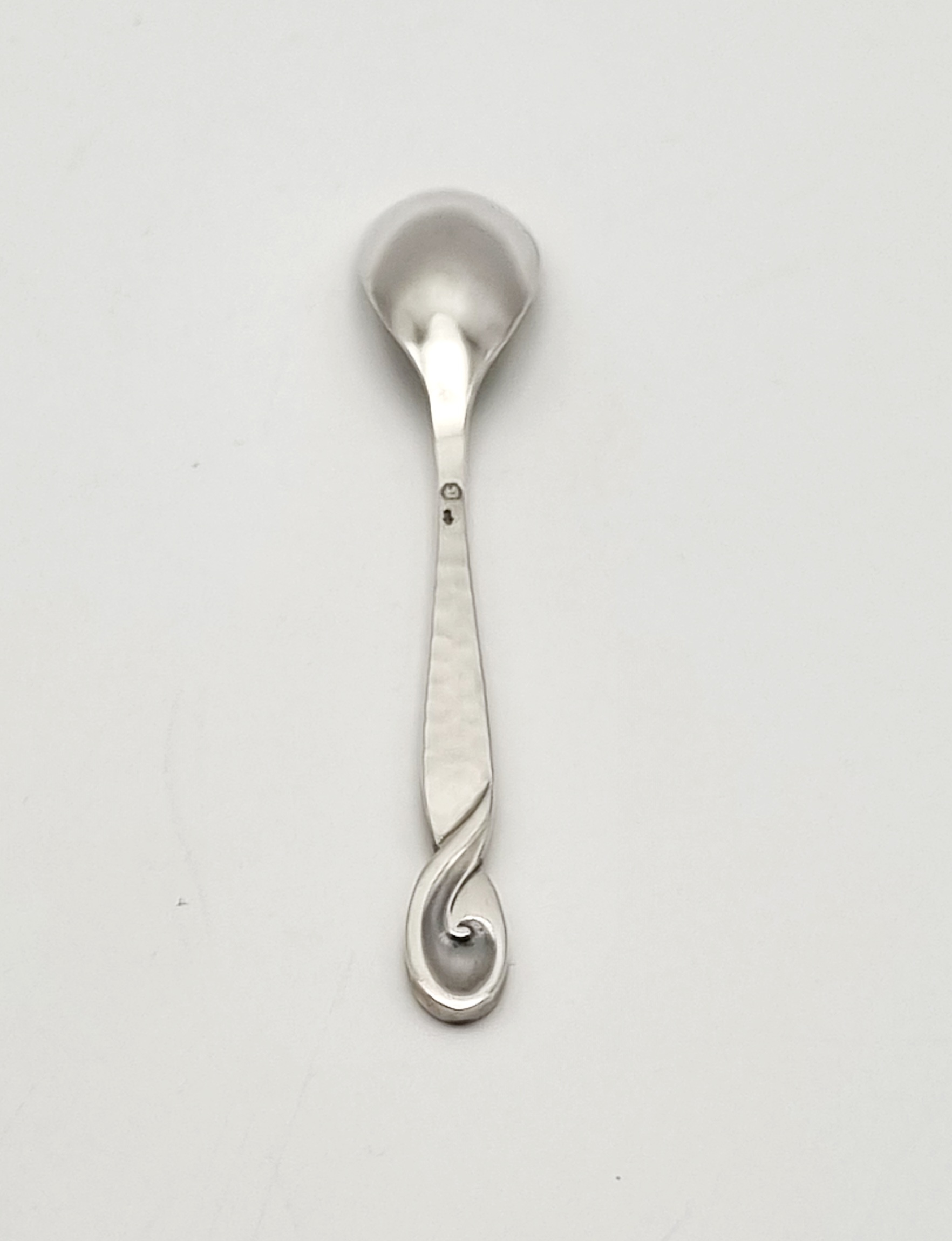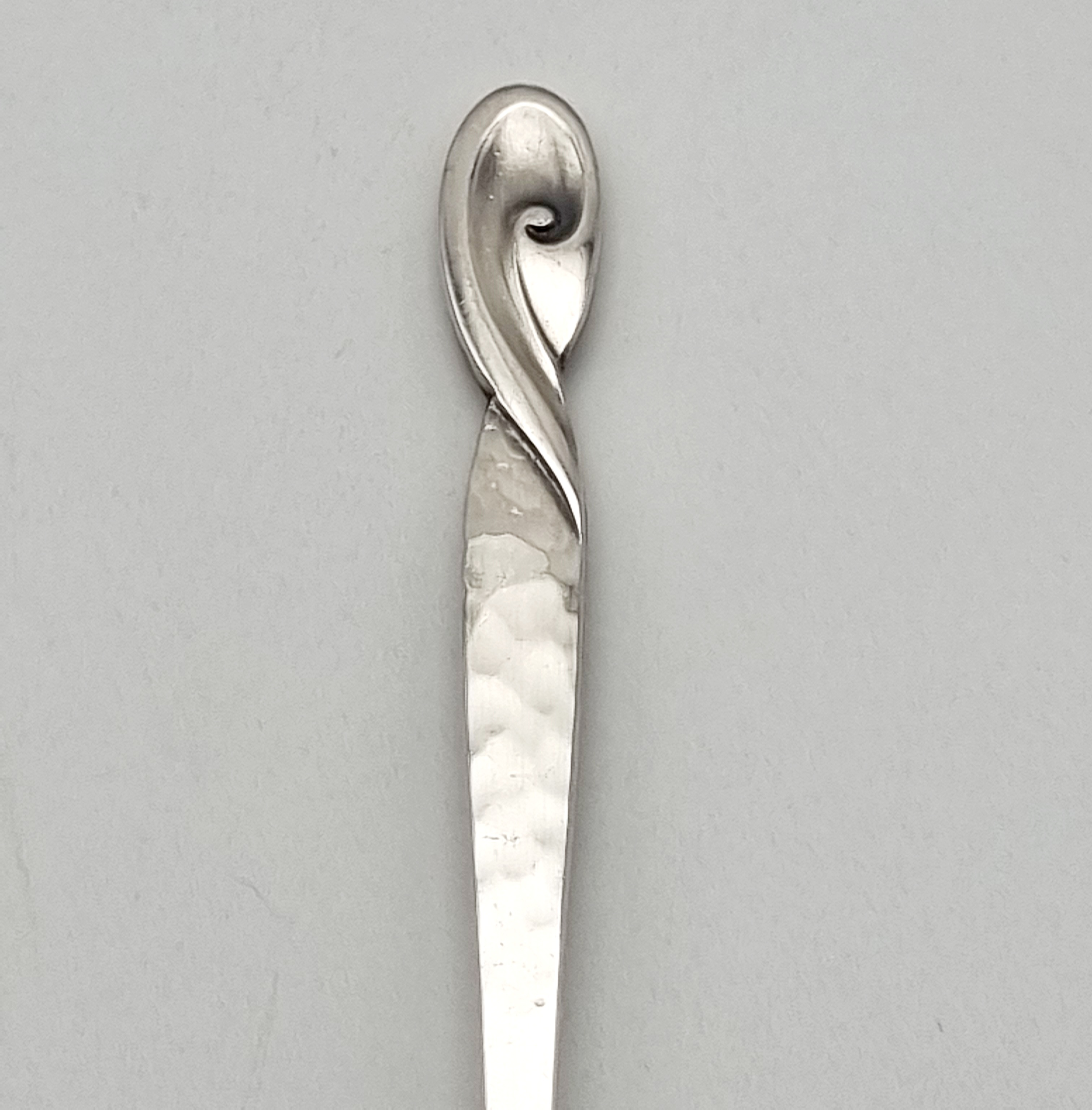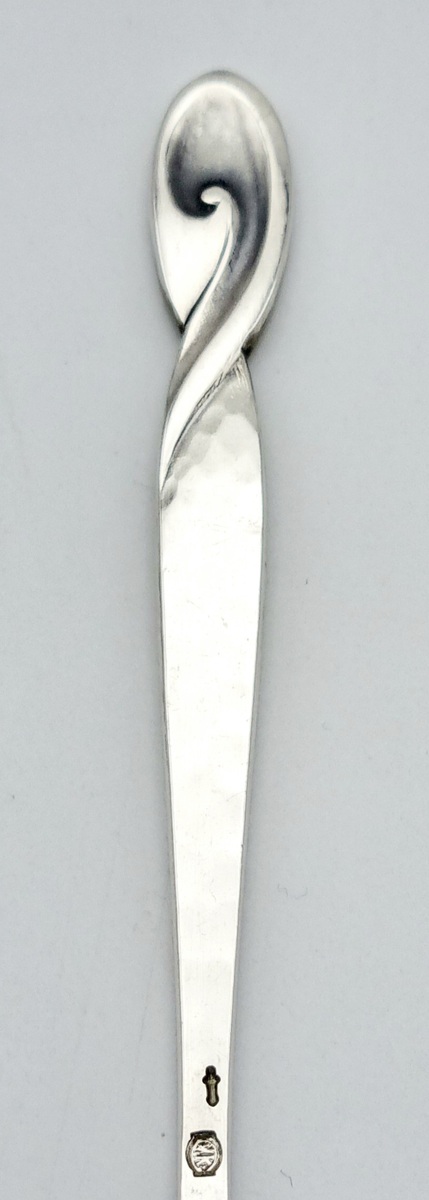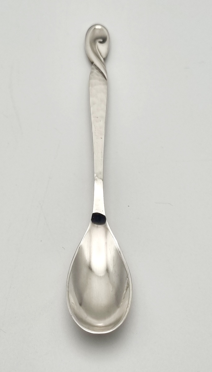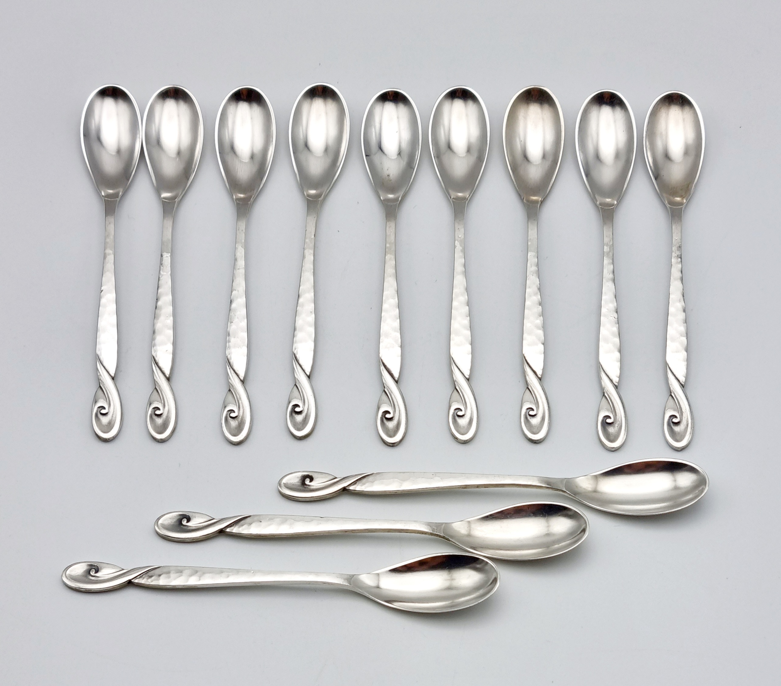 Twaalf zilveren theelepels met gehamerd oppervlakte en sierlijke krul door Gerritsen & Van Kempen, Voorschoten. Modelnummer 216, alle theelepels gemerkt met zwaardje en meesterteken GVK. Zeist, omstreeks 1935. |