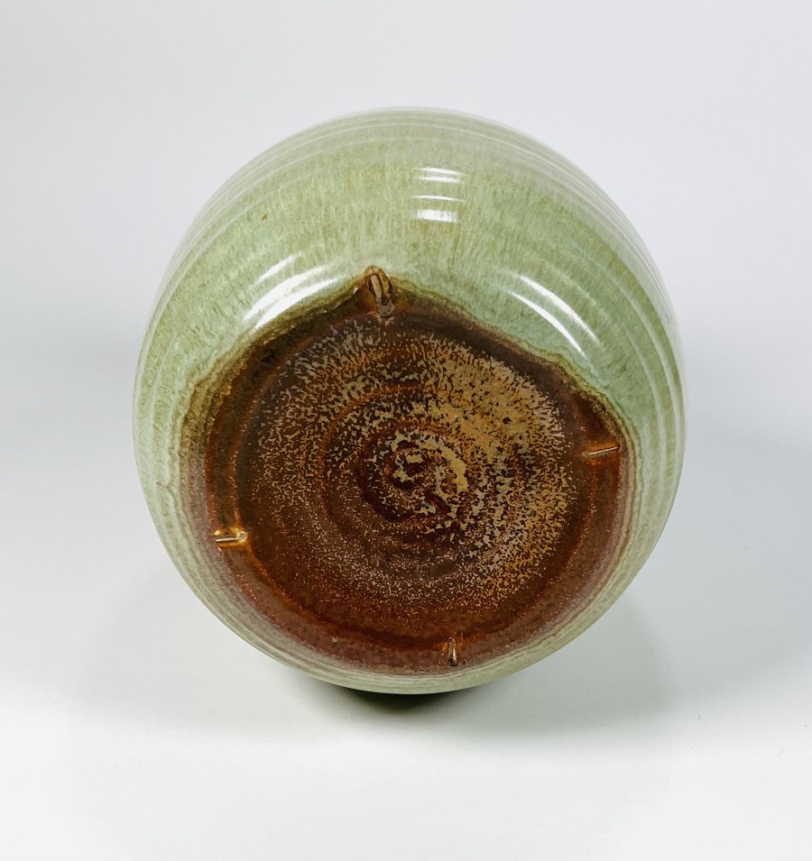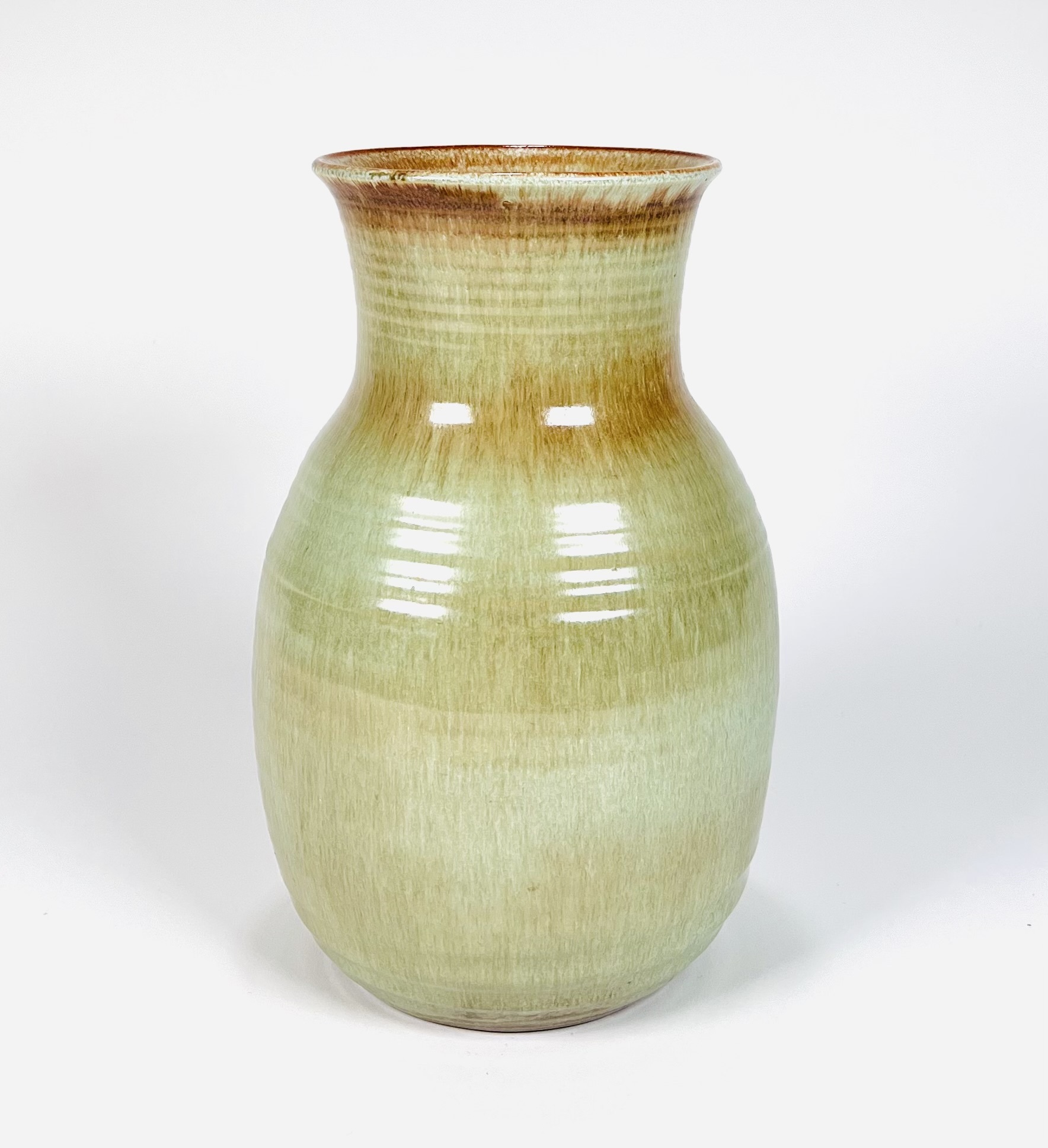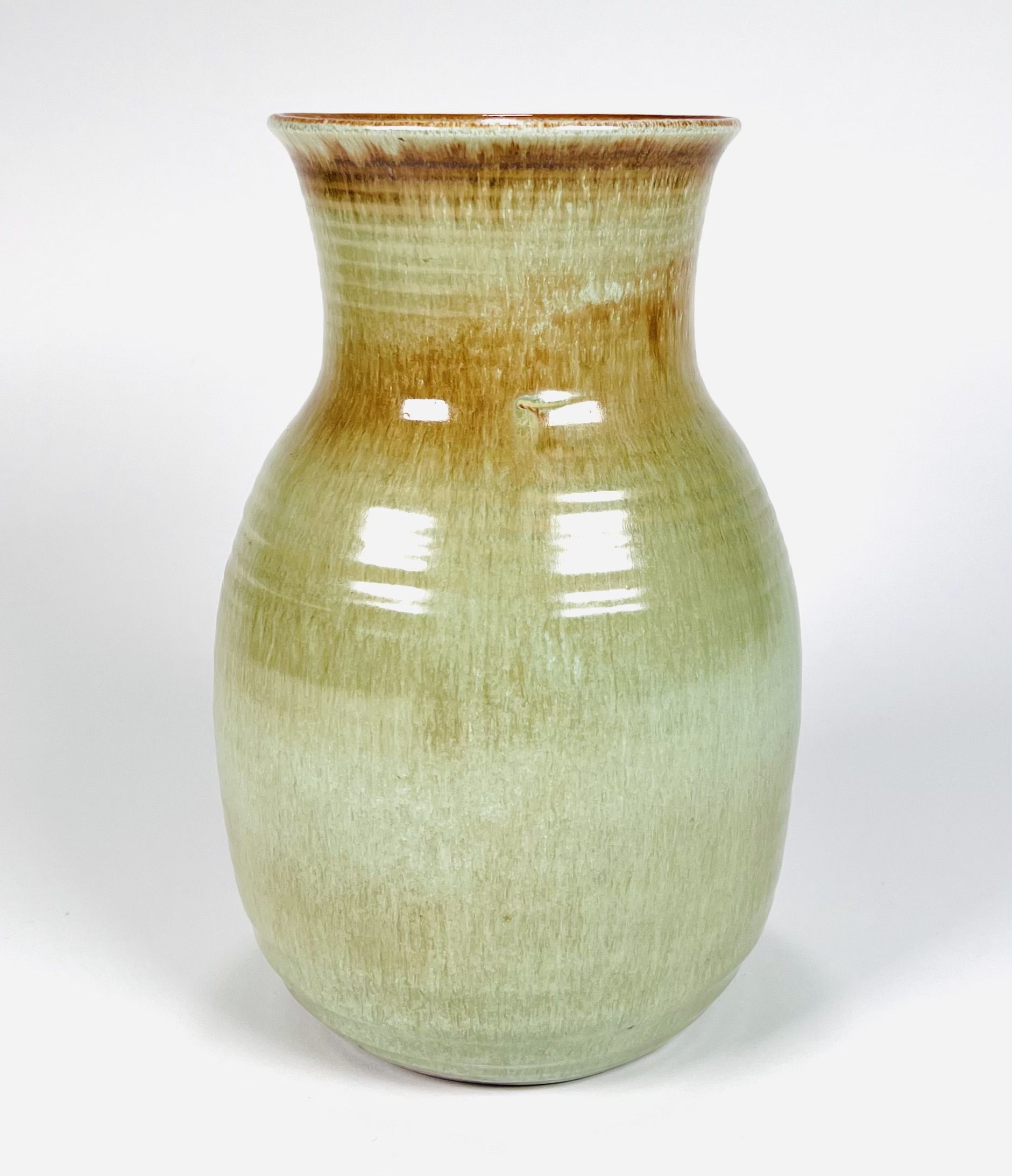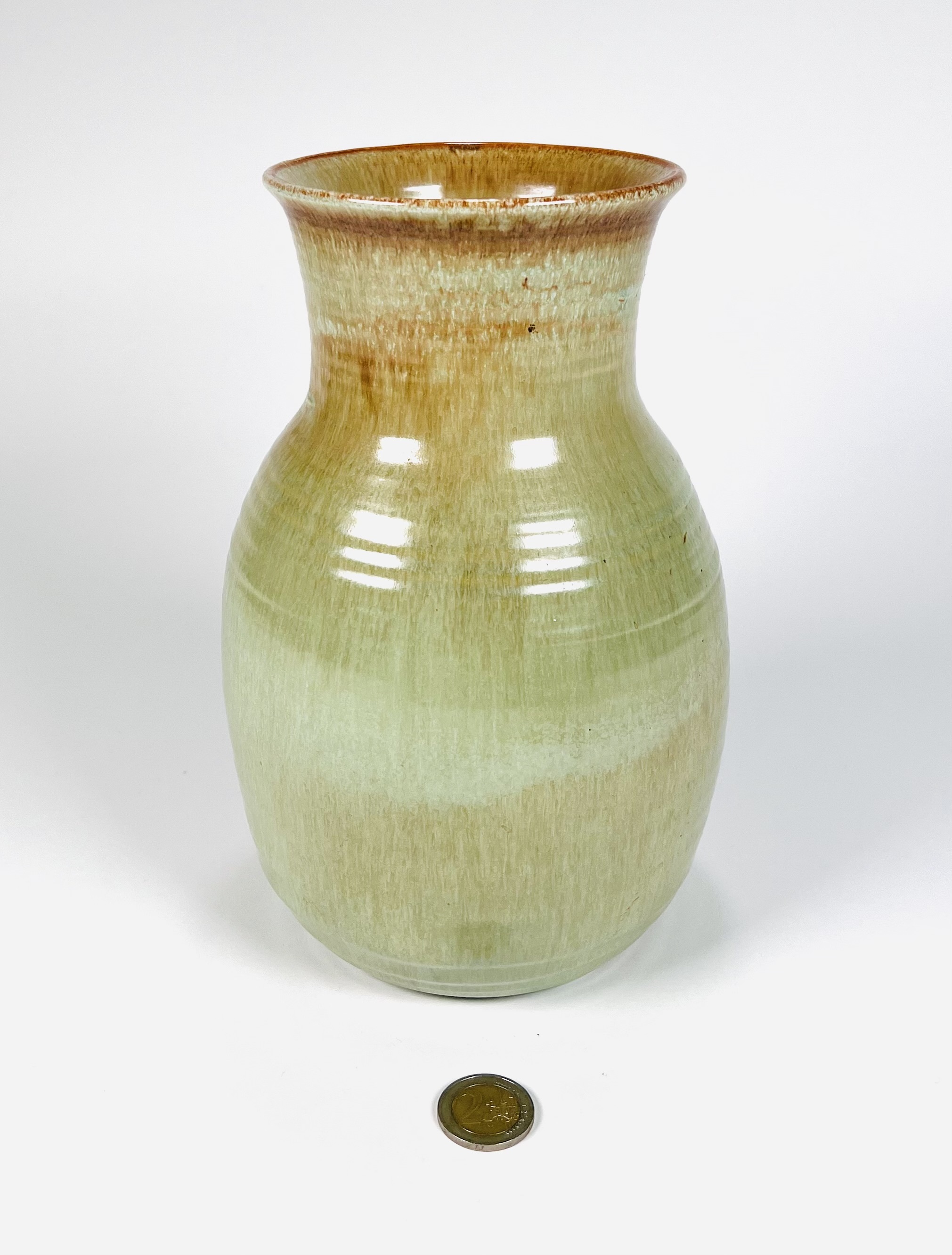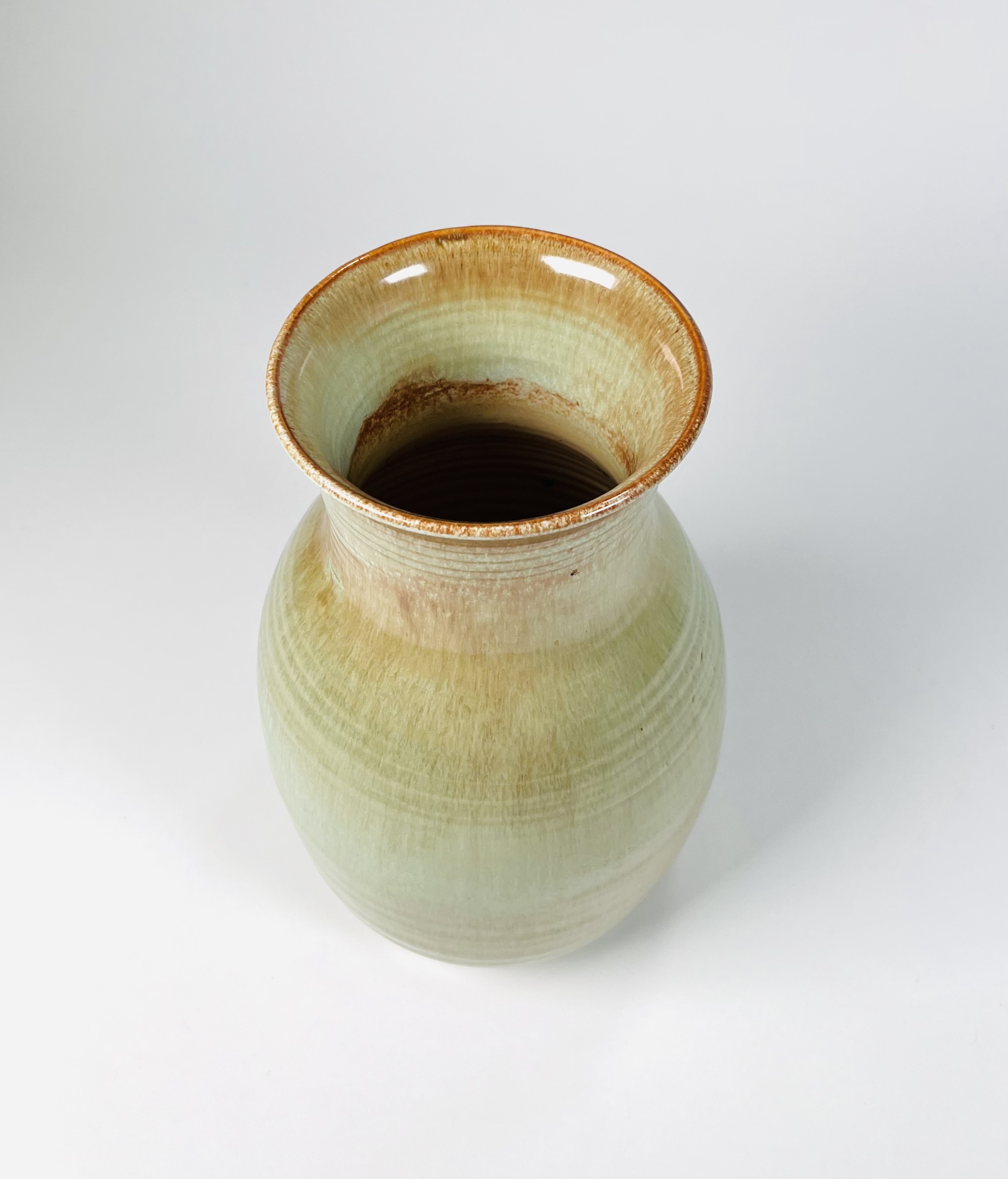 Keramieken vaas met horizontaal ribbelpatroon in lichtgroene kleurslag met lichtbruin kleureffect. Ontwerp Wim Visser en uitgevoerd door Sphinx te Maastricht, halverwege 20e eeuw. |