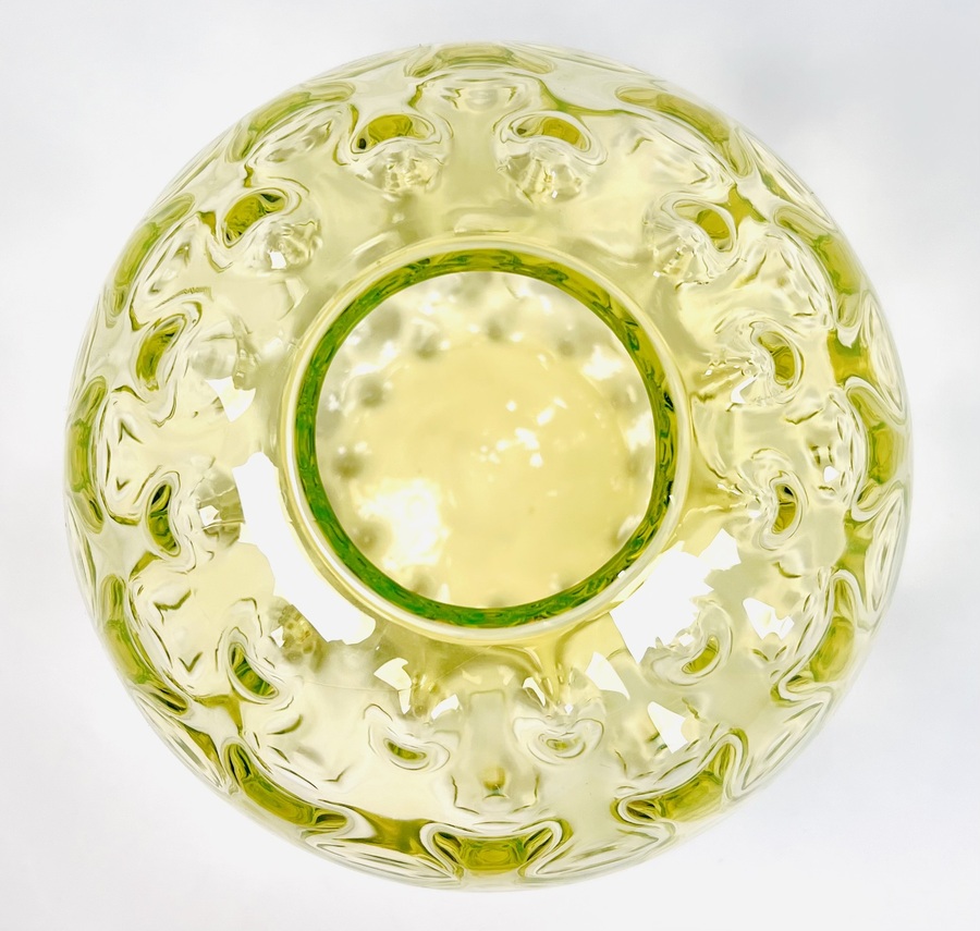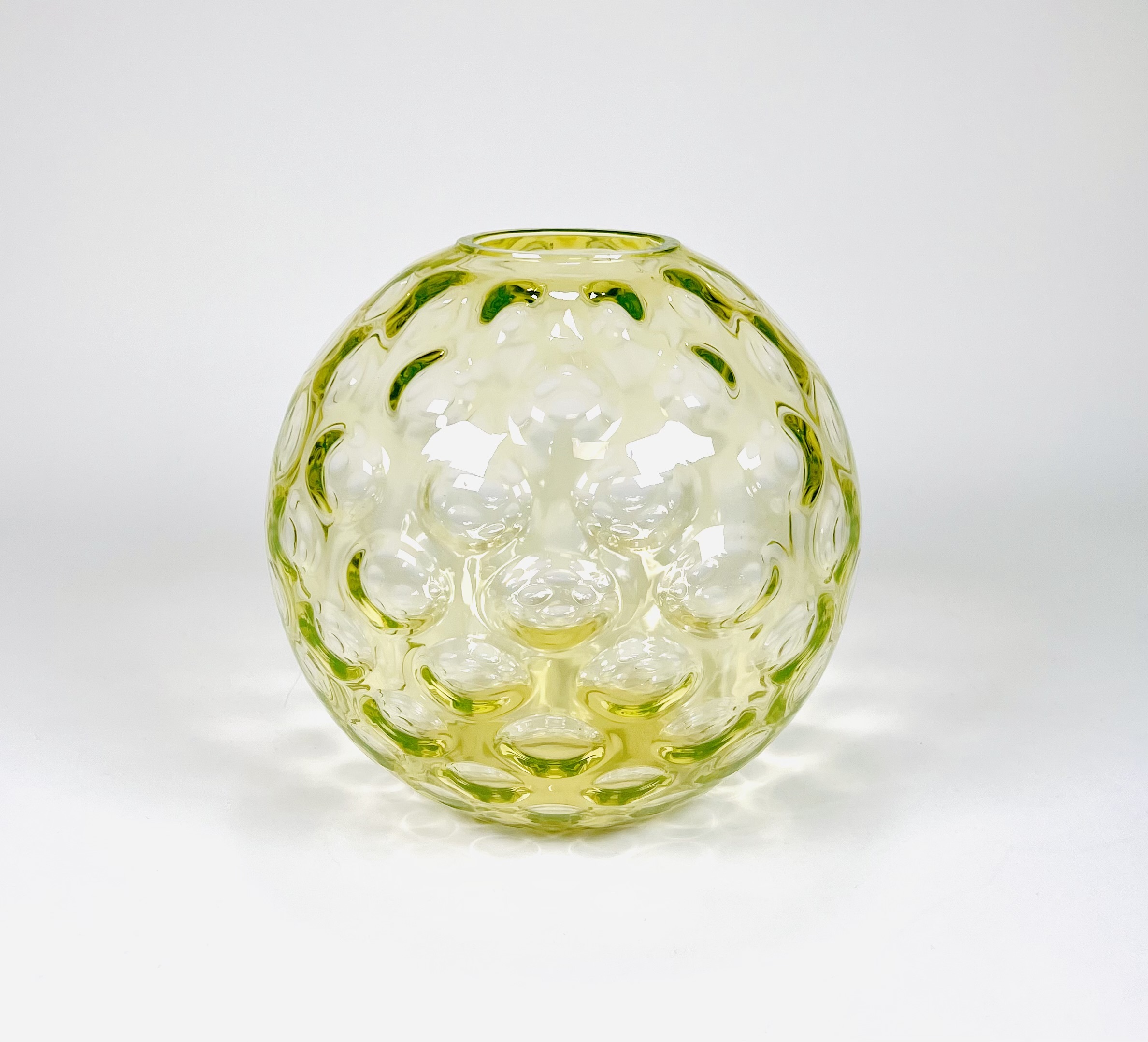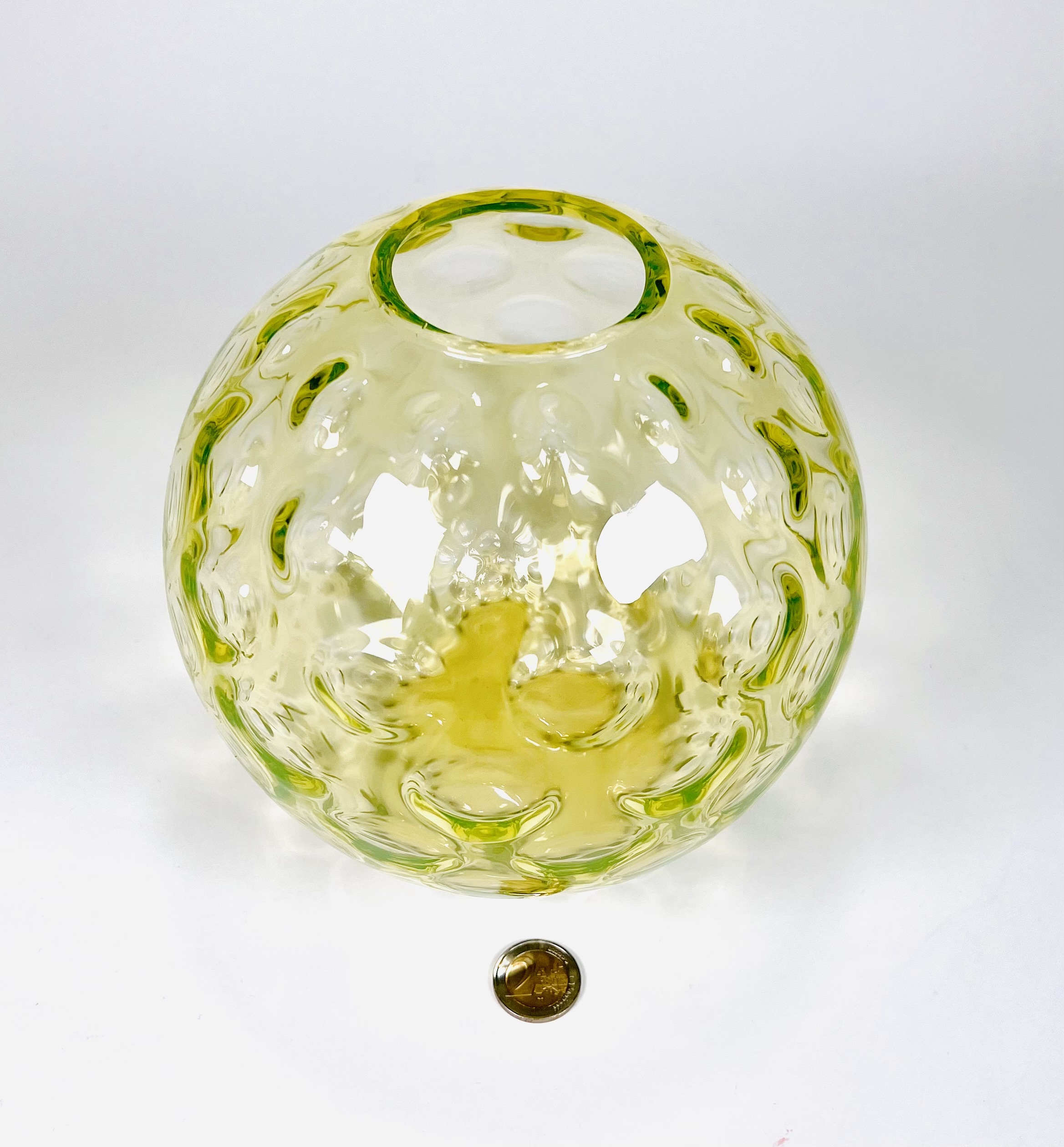 Ronde urianiumglazen bolvaas door Borske Sklo gedecoreerd met cirkel patronen, modelnaam Olives. Tsjechoslowakije, jaren 50/60. |