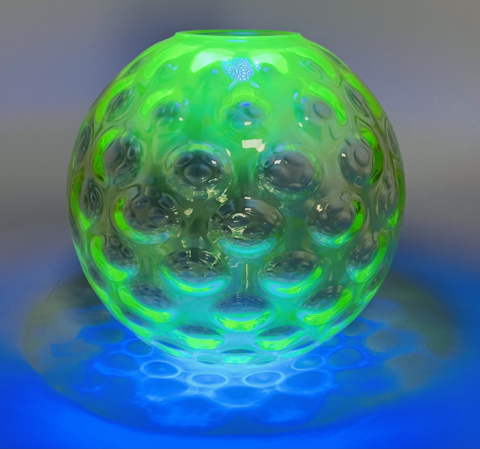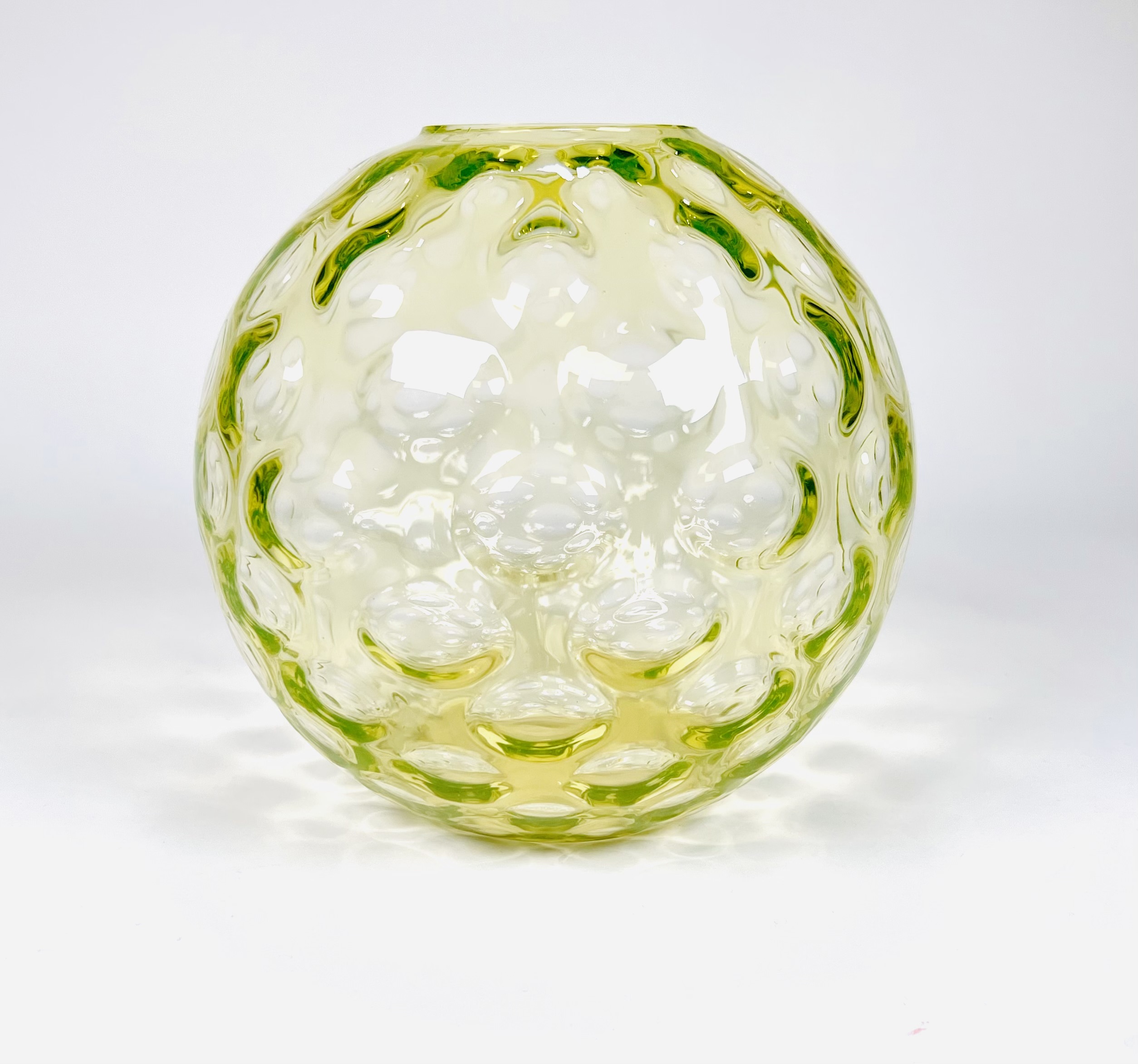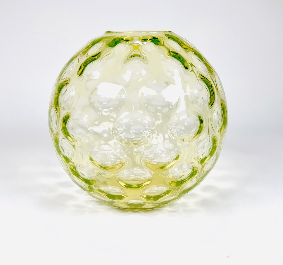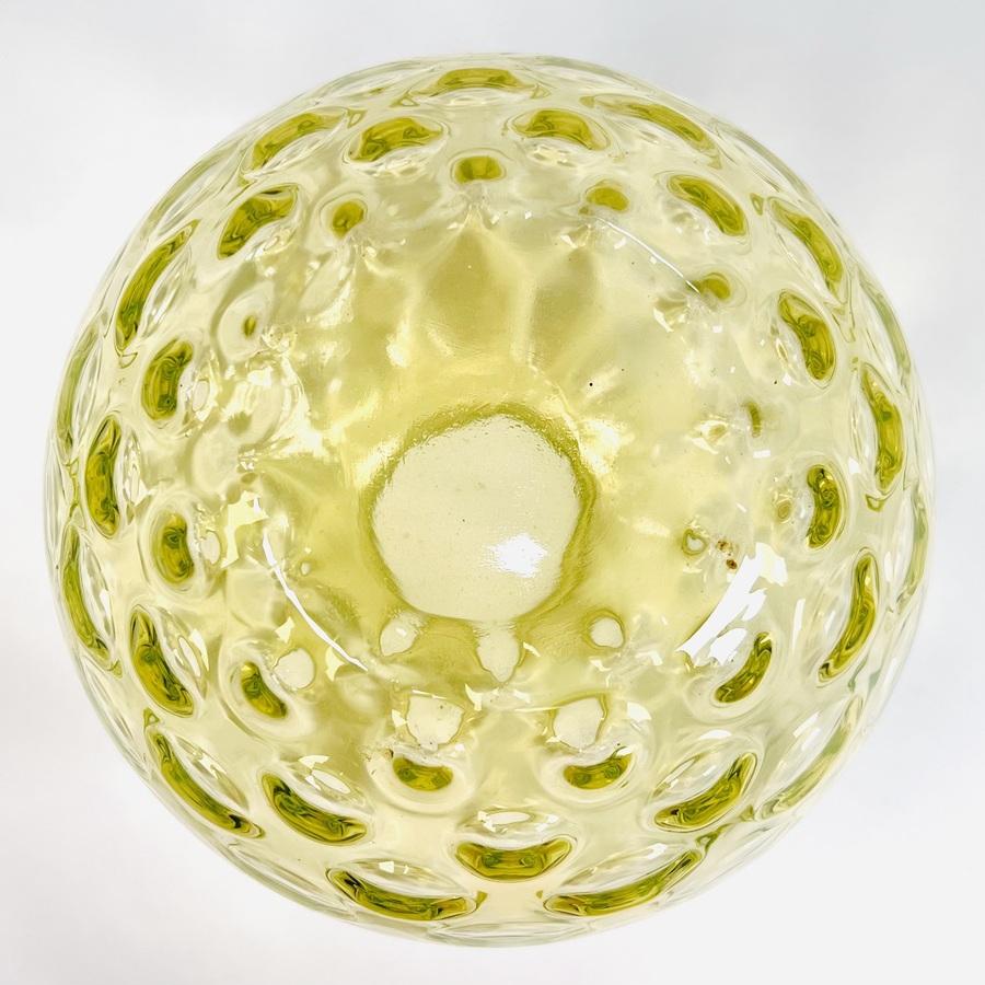 Ronde urianiumglazen bolvaas door Borske Sklo gedecoreerd met cirkel patronen, modelnaam Olives. Tsjechoslowakije, jaren 50/60. |