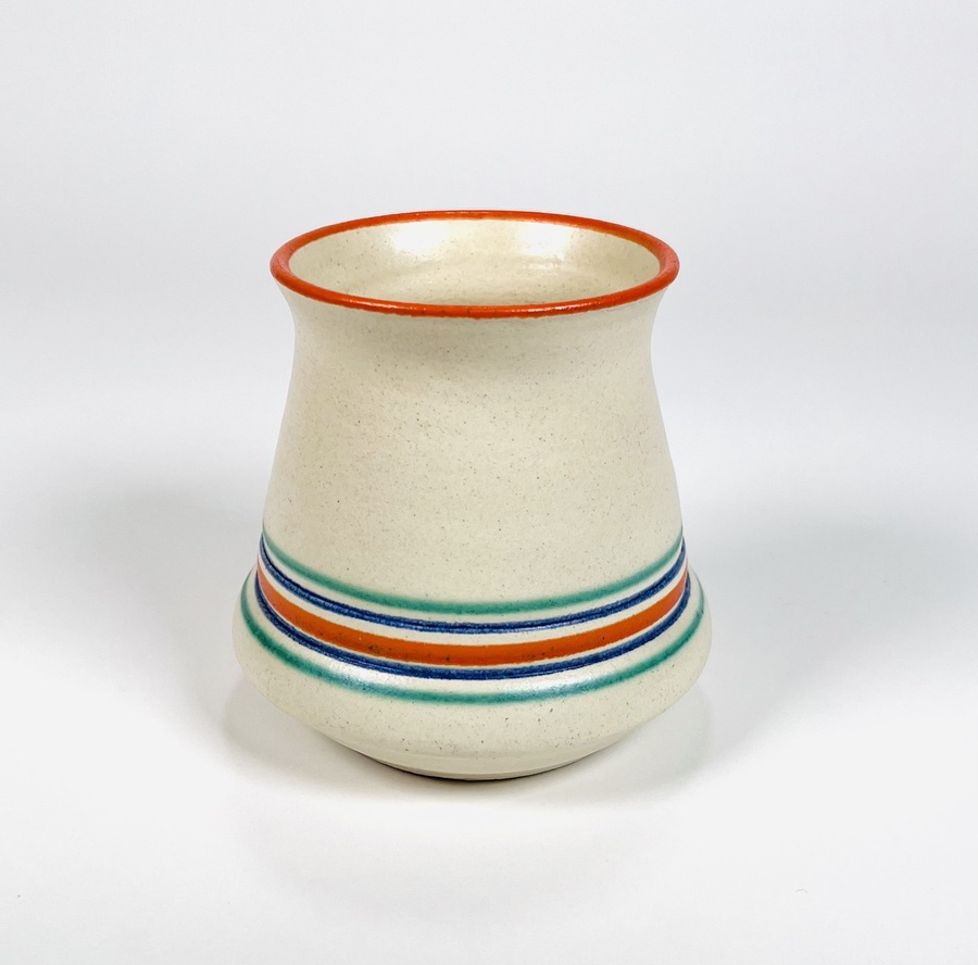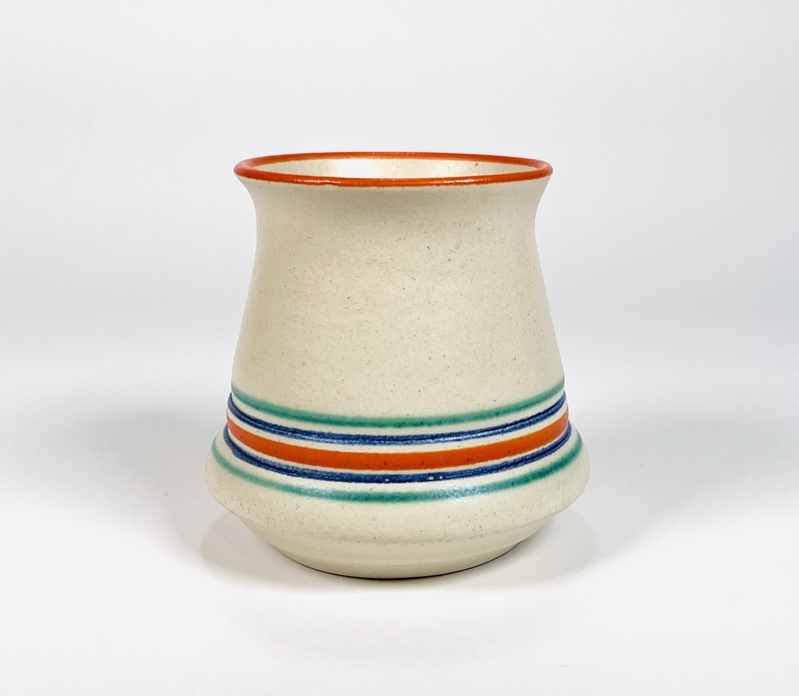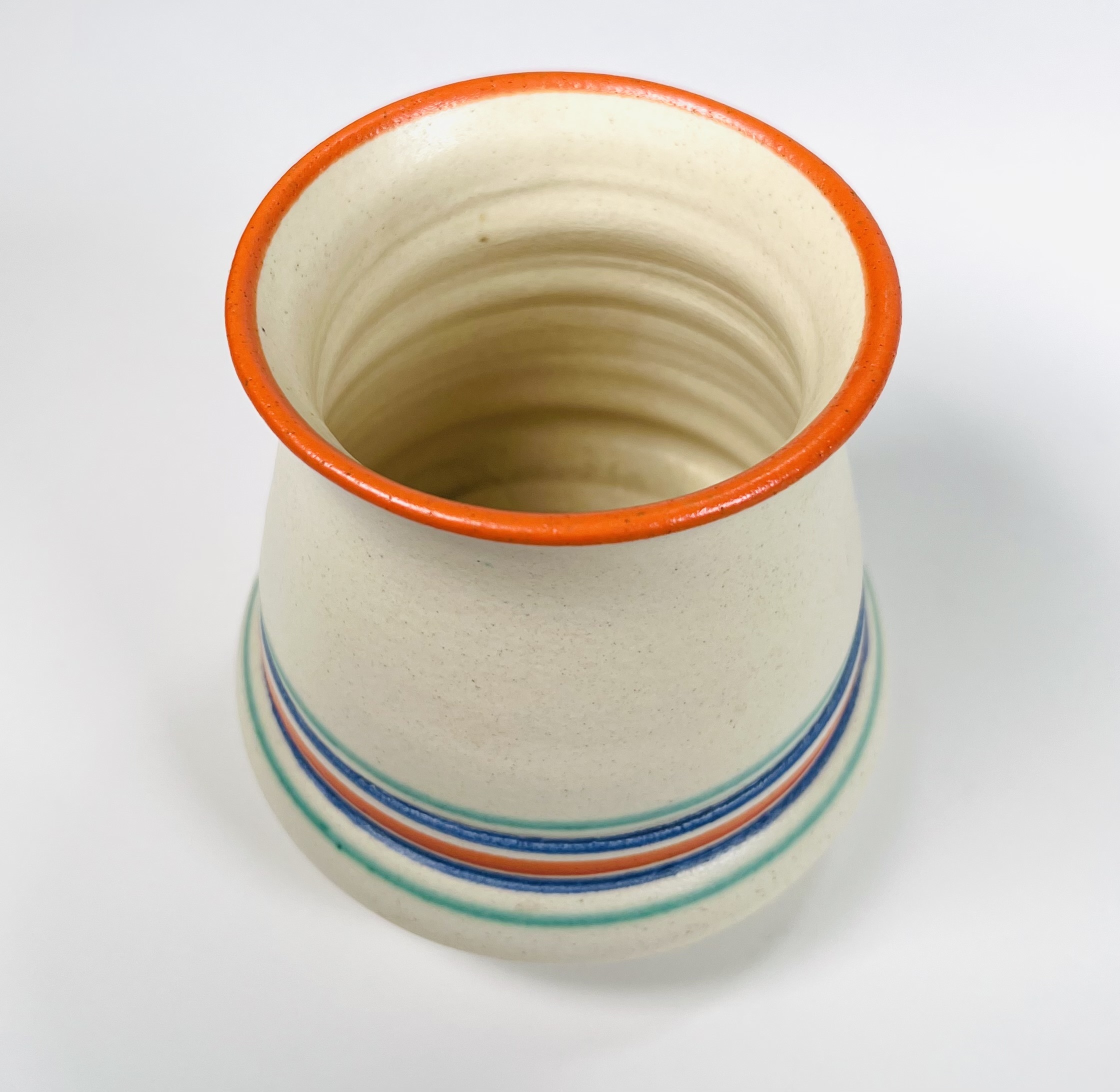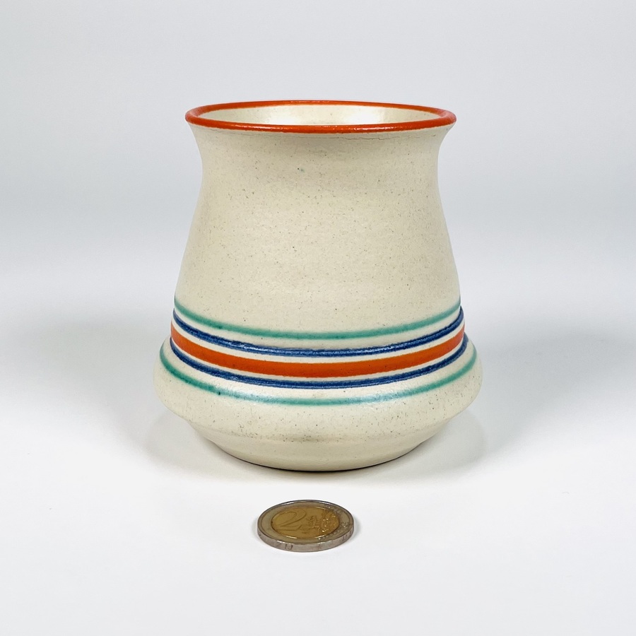 Keramieken vaas met horizontaal streeppatroon, ontwerp Koen Mertens voor Potterij De Zwing uit Noordwijk. Aan de onderzijde gemerkt Z in een driehoek en voorzien van modelnummer 526. Eind jaren 20. |