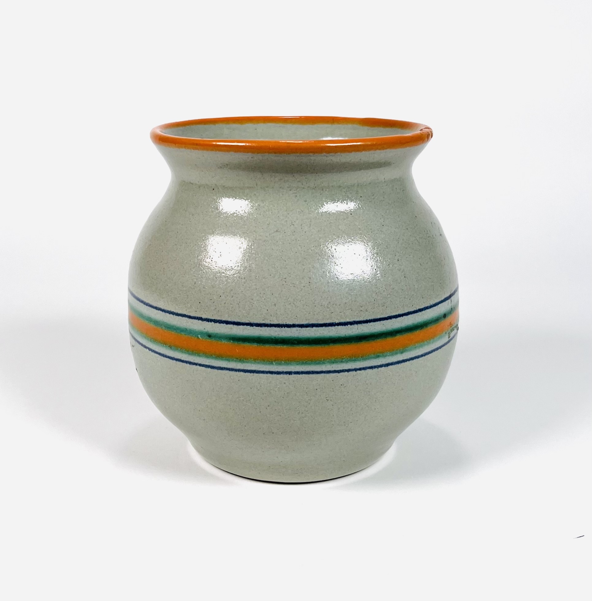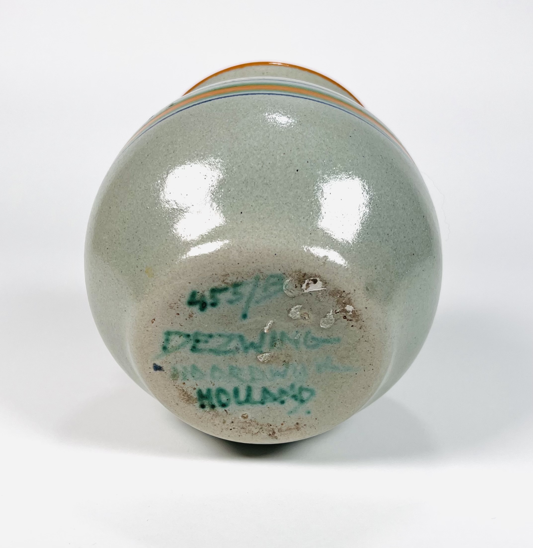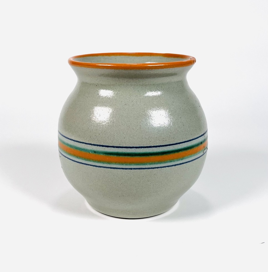 Aardewerken vaas met horizontaal streeppatroon, ontwerp Koen Mertens voor de Potterij De Zwing uit Noordwijk. Aan de onderzijde gemerkt De Zwing en voorzien van modelnummer 455/B. Eind jaren 20. |