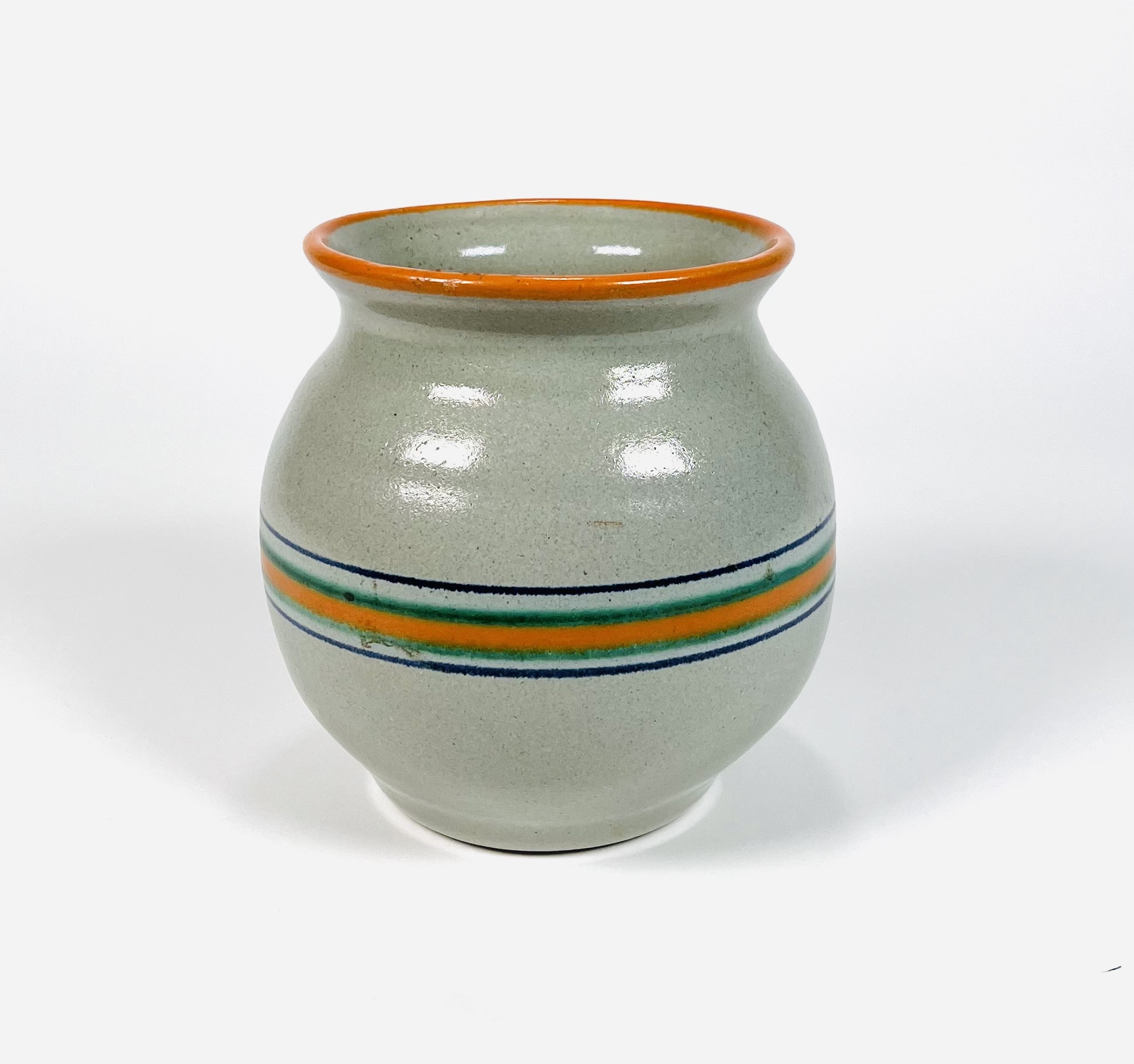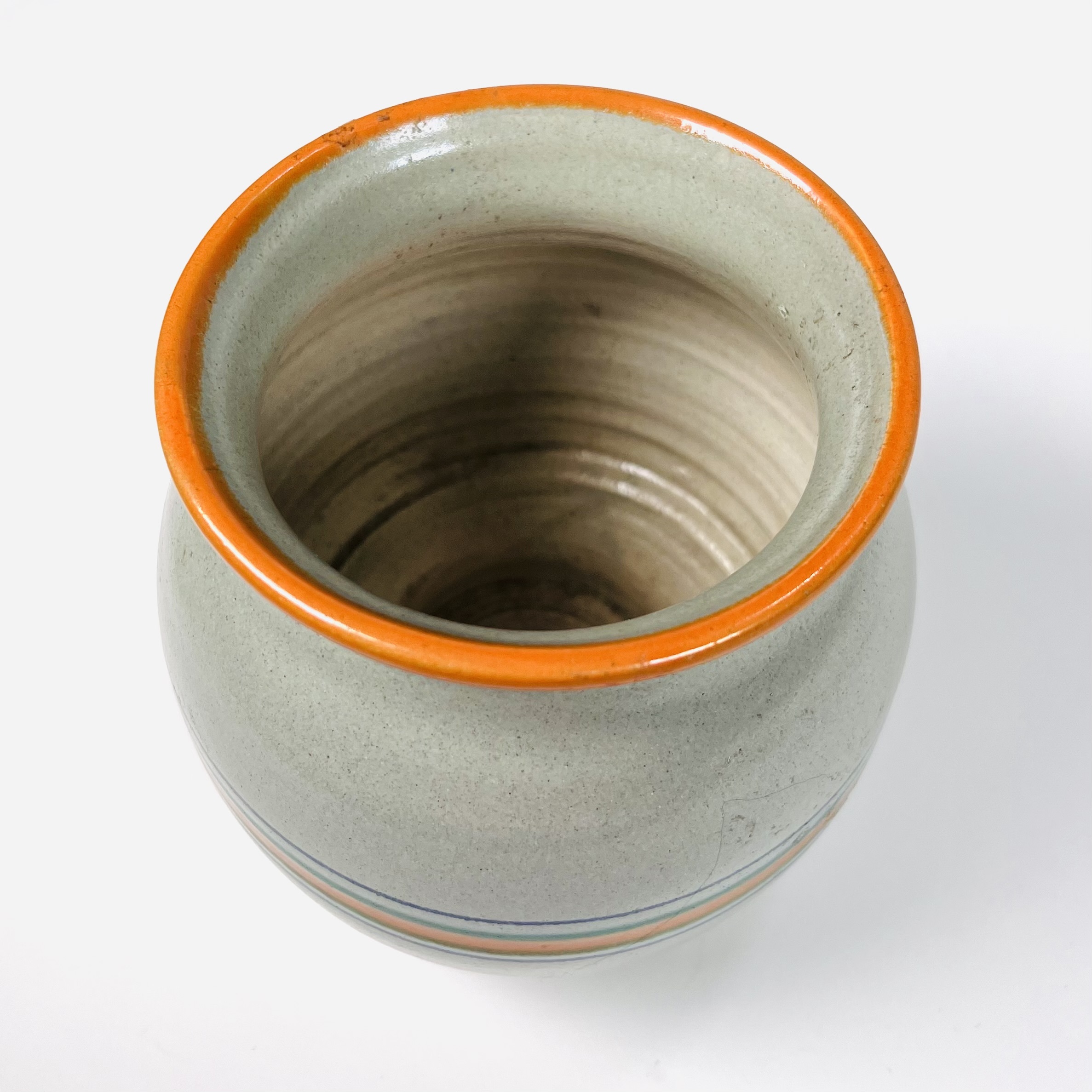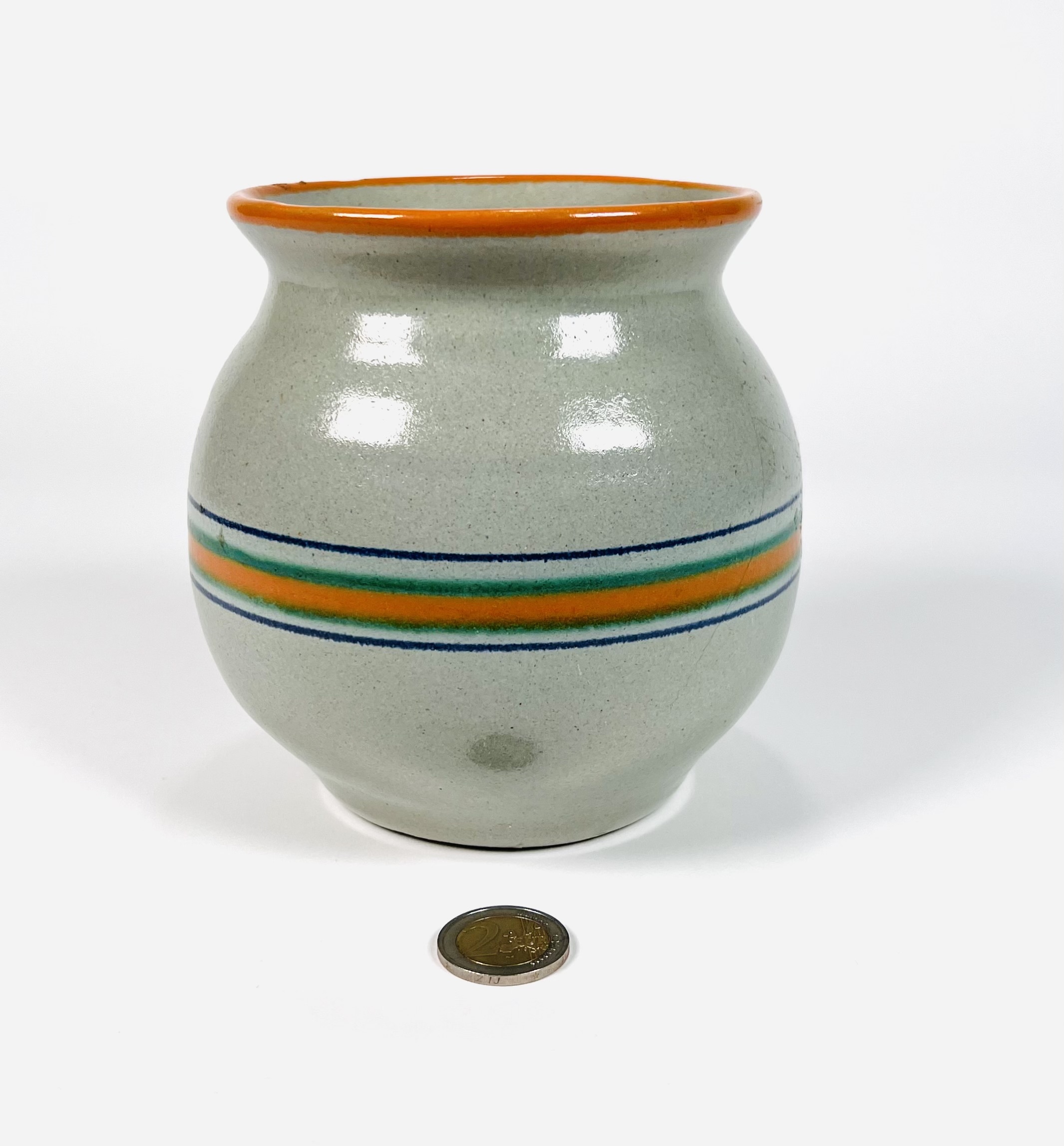 Aardewerken vaas met horizontaal streeppatroon, ontwerp Koen Mertens voor de Potterij De Zwing uit Noordwijk. Aan de onderzijde gemerkt De Zwing en voorzien van modelnummer 455/B. Eind jaren 20. |