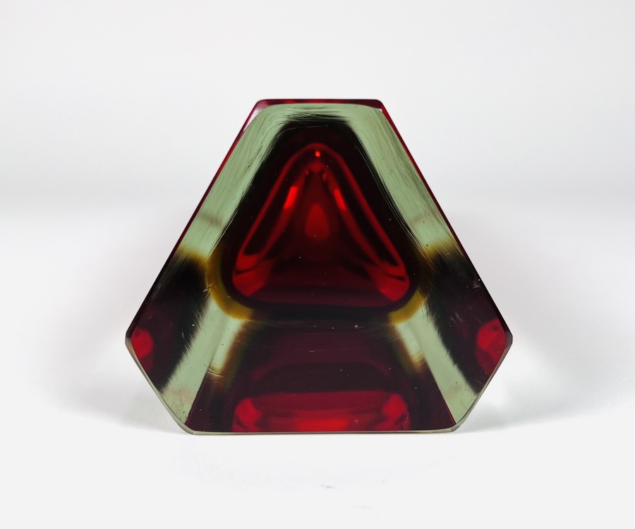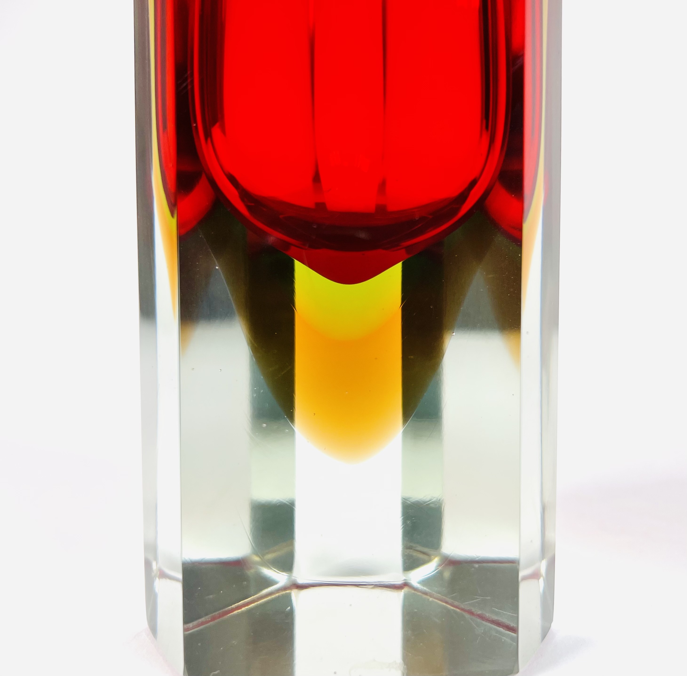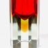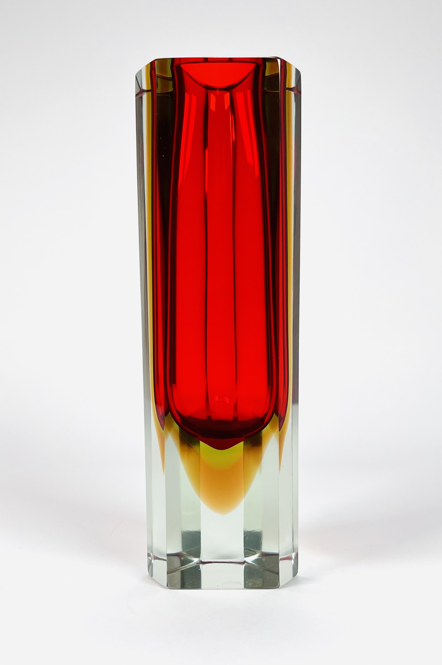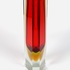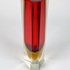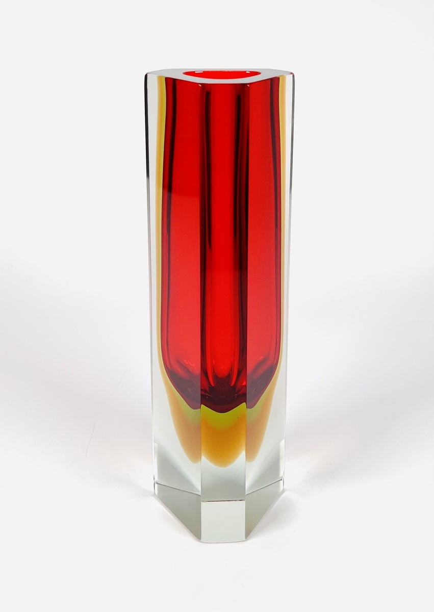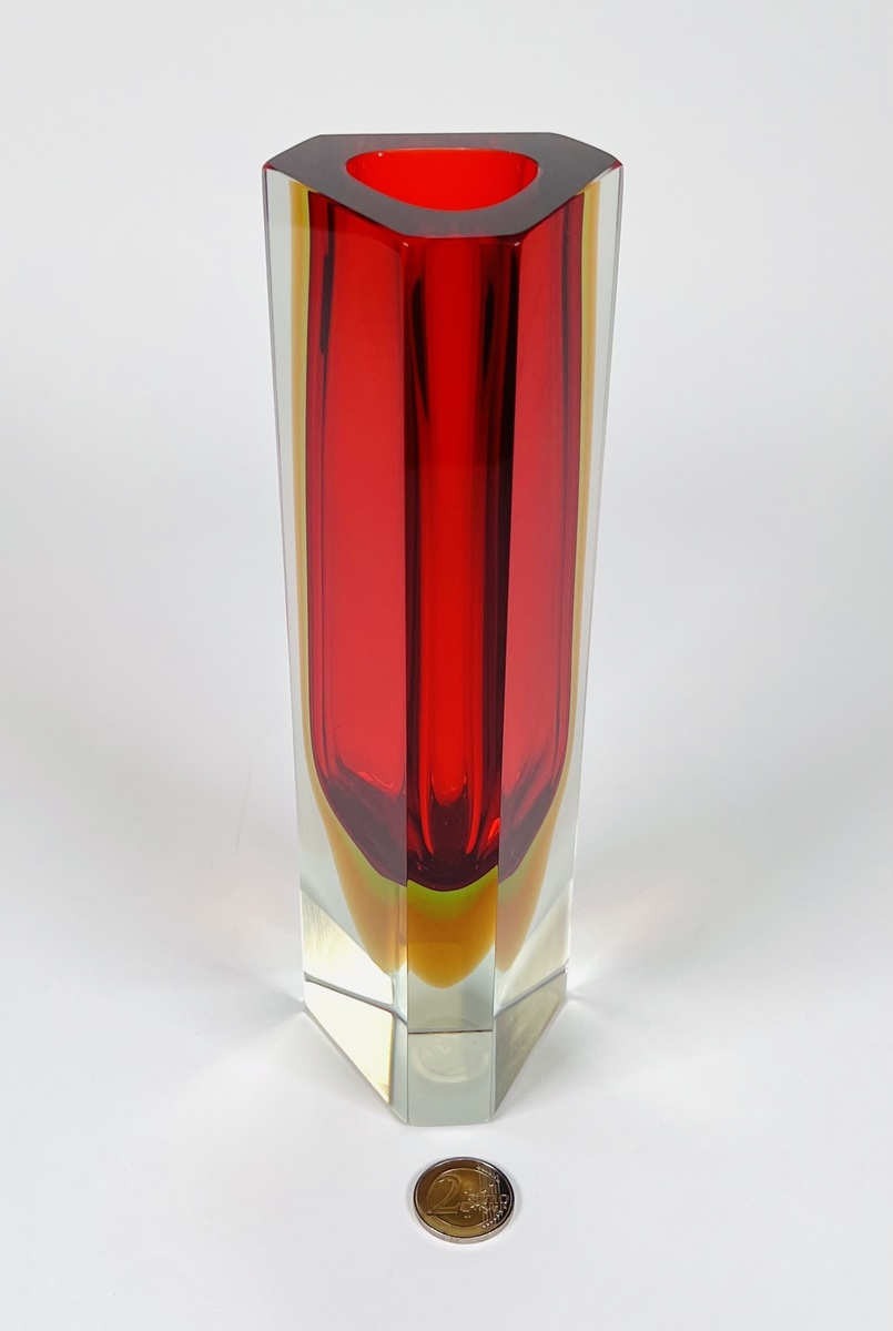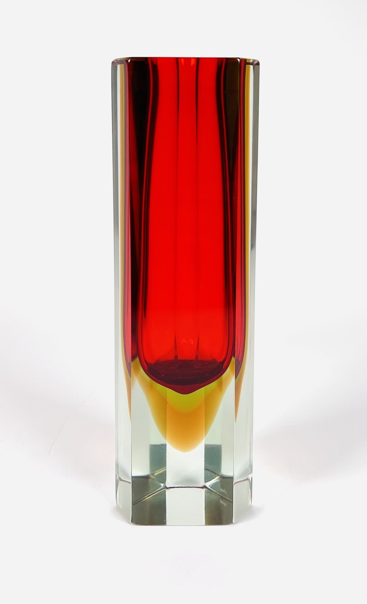 Rode zeskantige kristallen Murano vaas in Sommerso techniek met onderin een groene- en cognackleurige laag. Toegeschreven aan Luigi Mandruzzato, Venetië, jaren 60. |