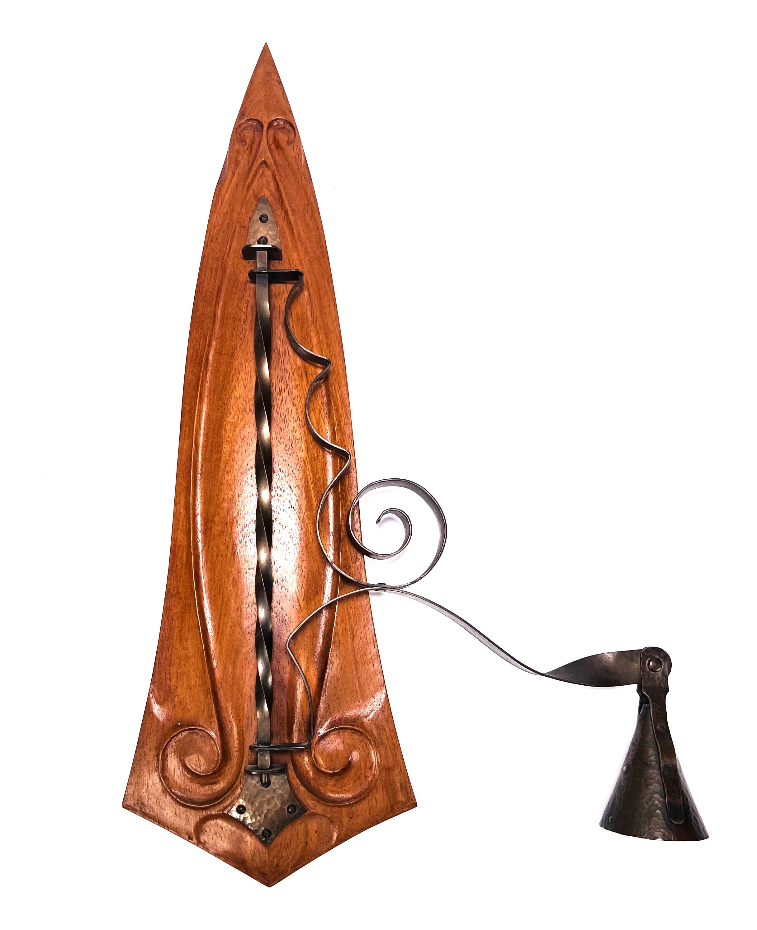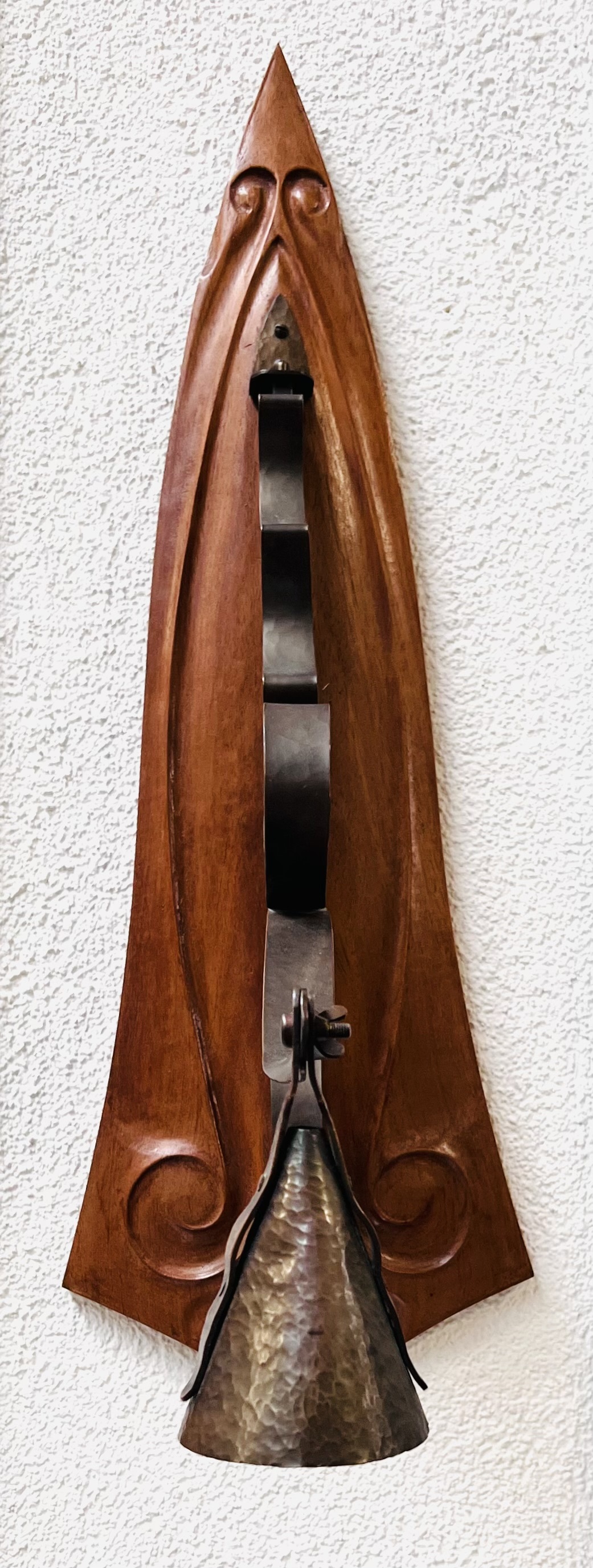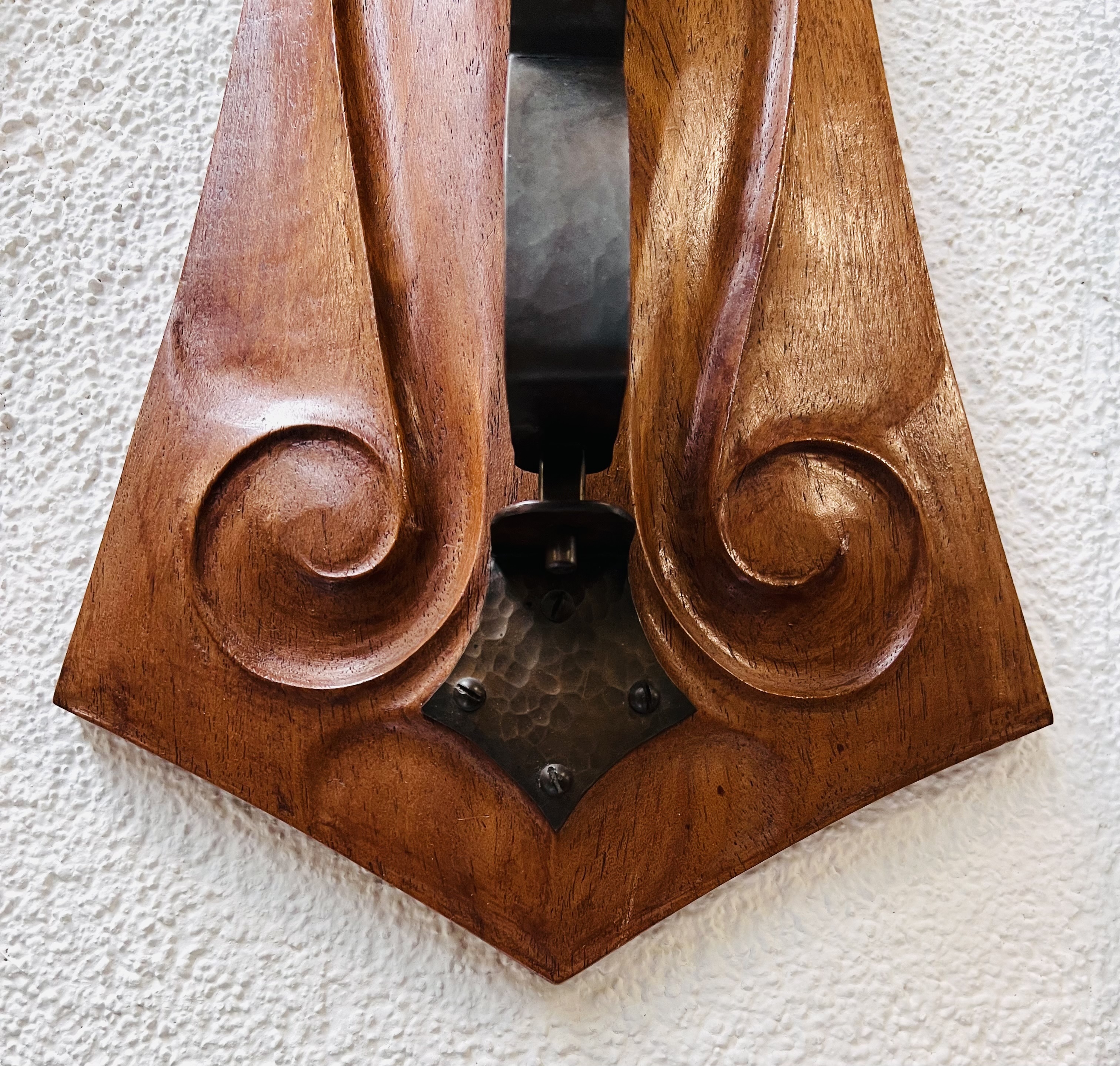 Notenhouten Amsterdamse School wandlamp met gehamerd koperen bevestiging en fitting houder. Jaren 20/30. |