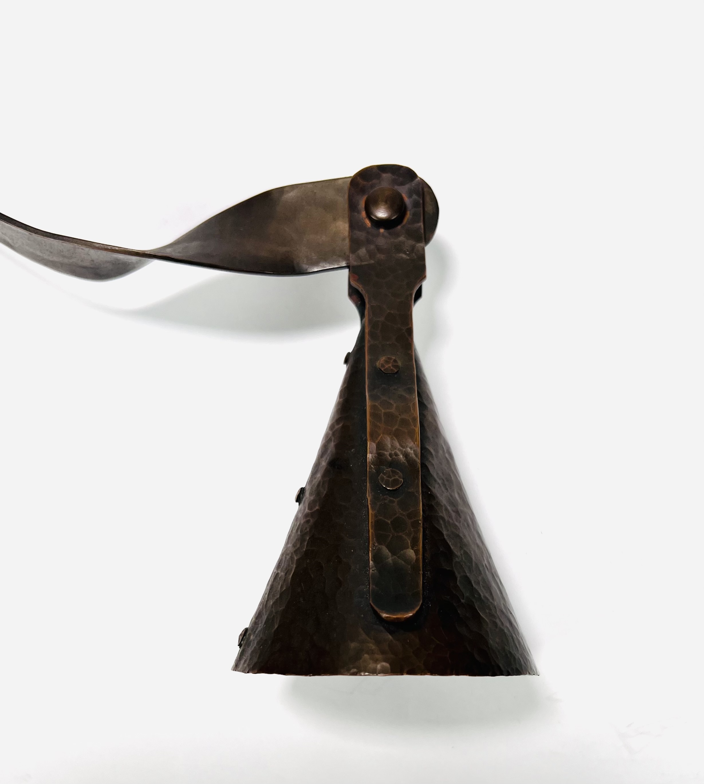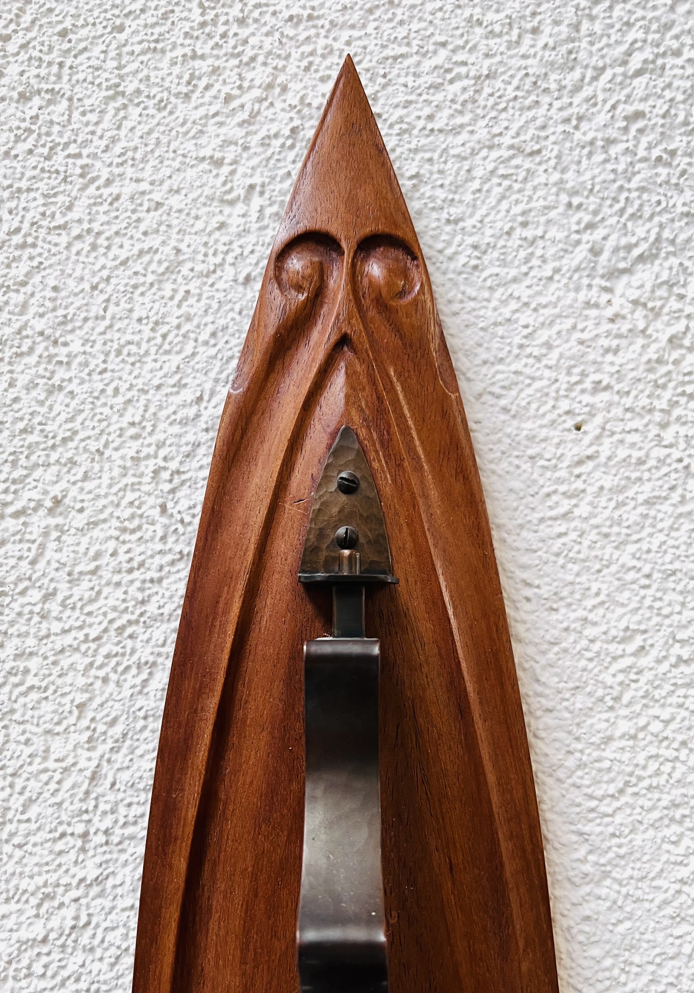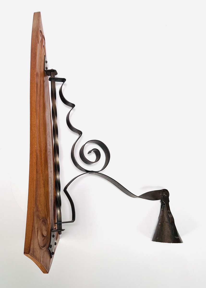 Notenhouten Amsterdamse School wandlamp met gehamerd koperen bevestiging en fitting houder. Jaren 20/30. |