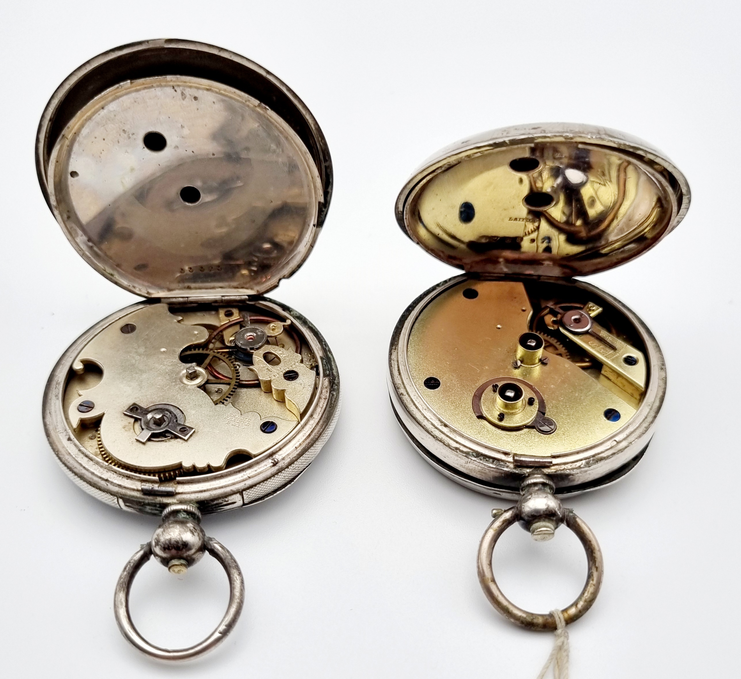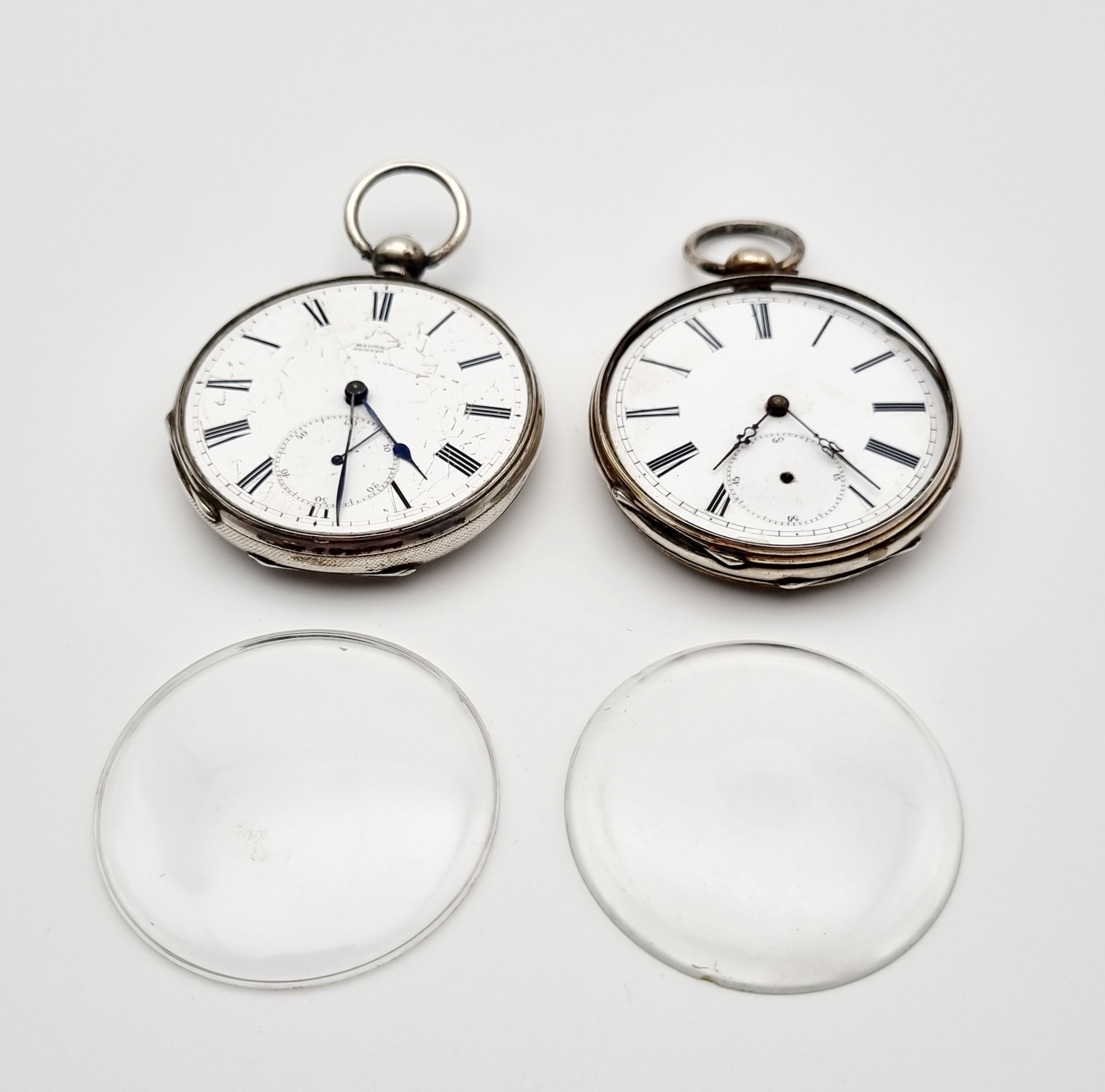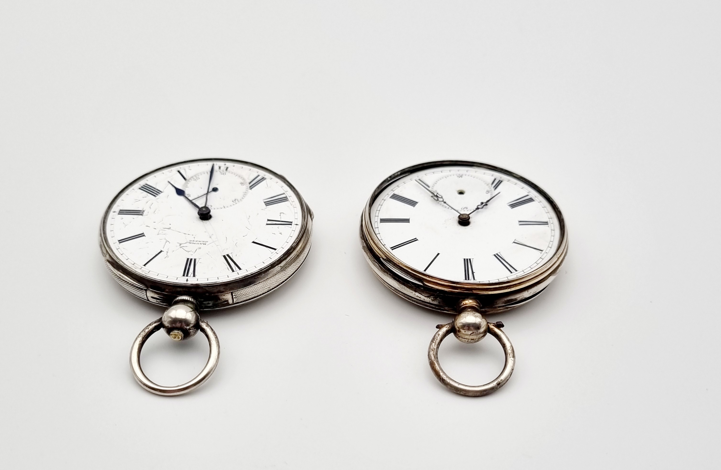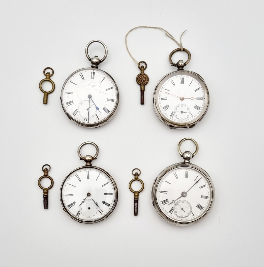 Vier zakhorloges bestaande uit een verzilverde Baume, Genève. een Sterling zilveren Engels zakhorloge en twee overige verzilverde zakhorloges. Omstreeks 1900. |