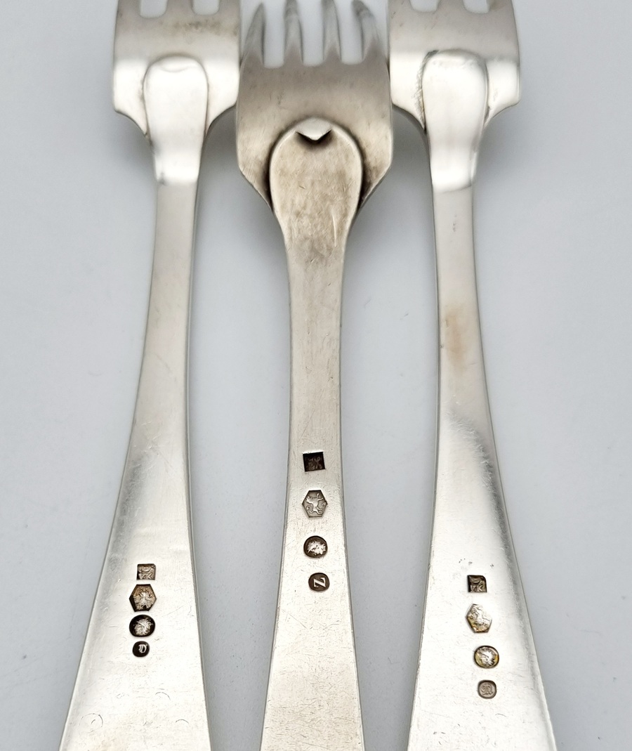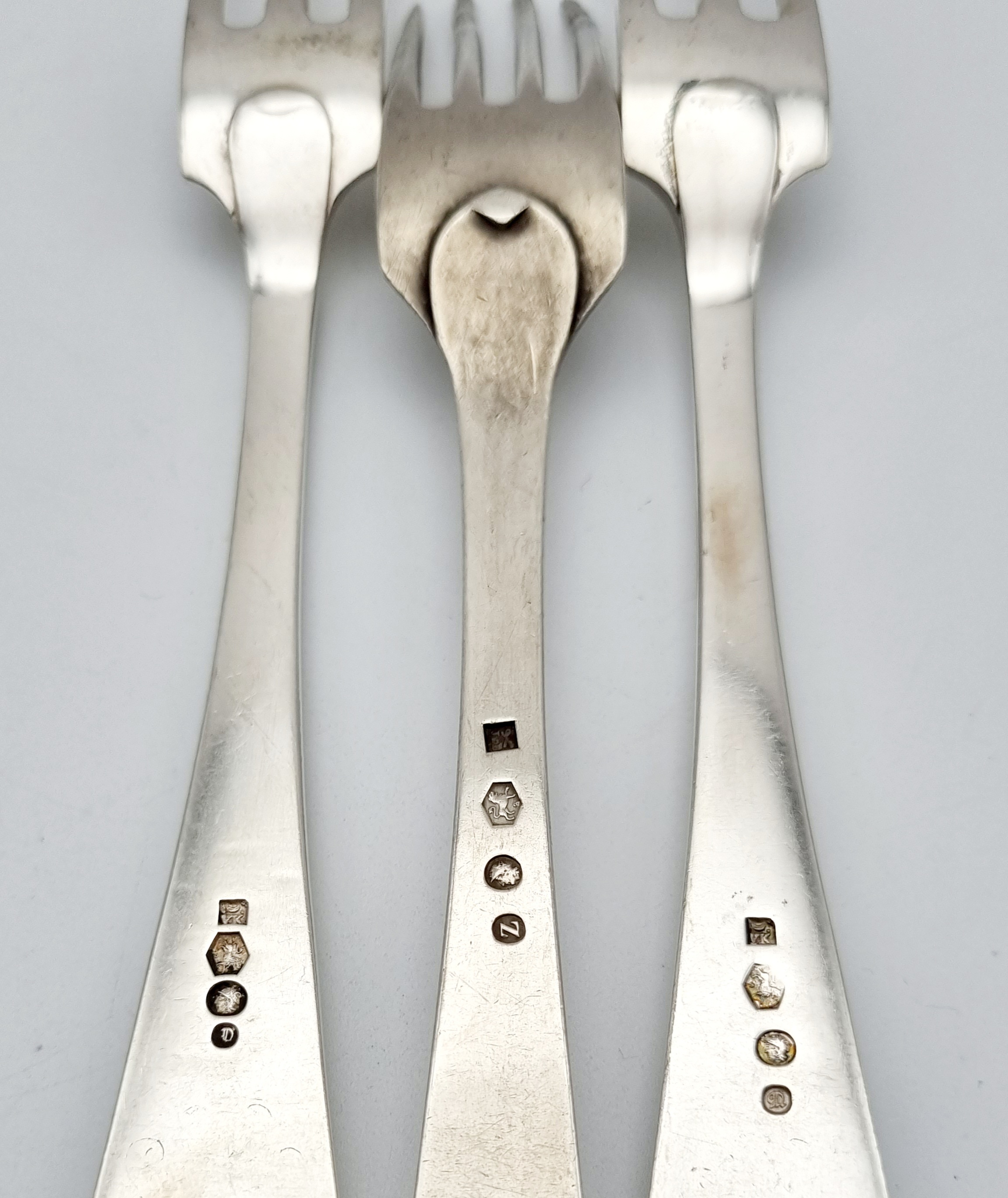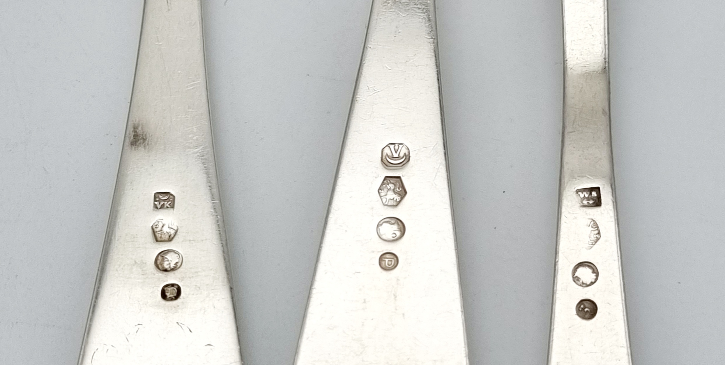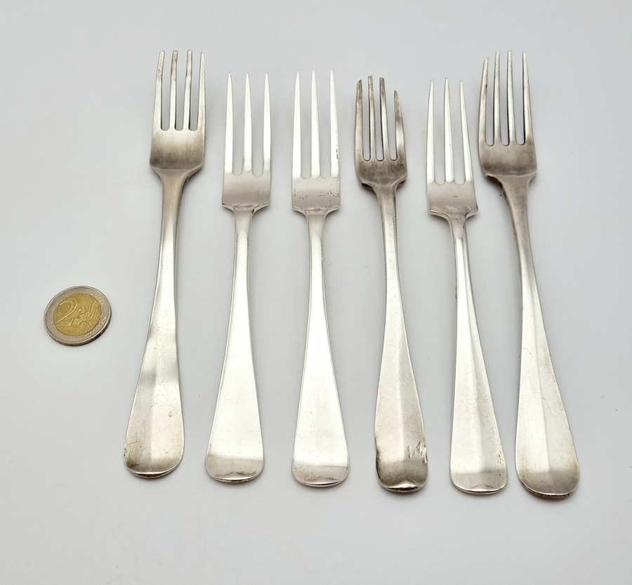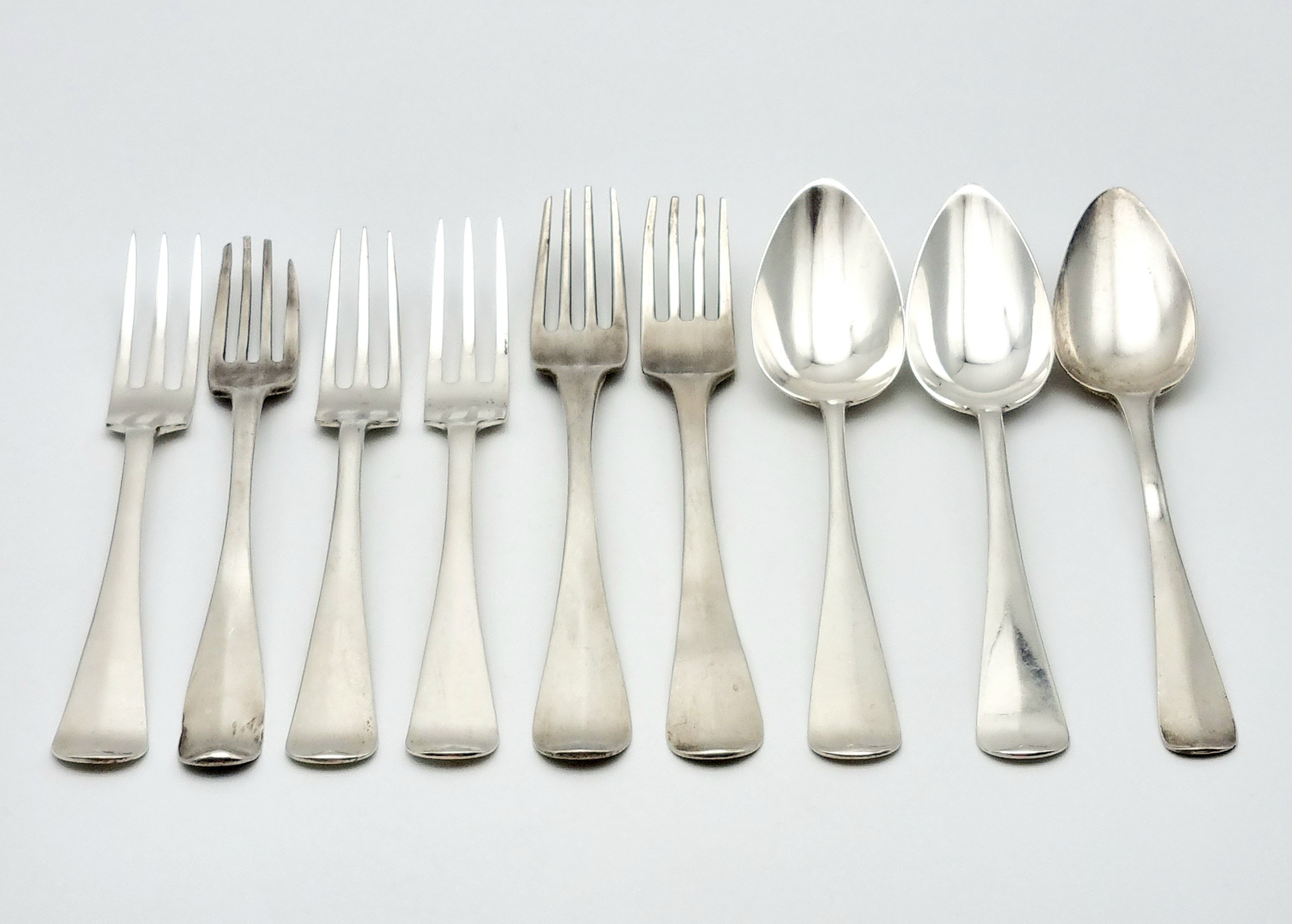 Lot zilveren Haags Lofje bestek bestaande uit drie lepels en zes vorken. Gemerkt lopende leeuw 2, meesterteken Van Kempen, minervakop en diverse jaarletters. |