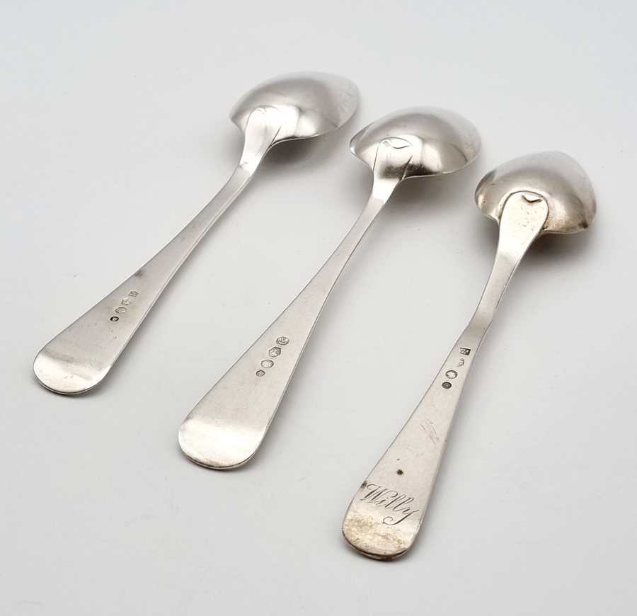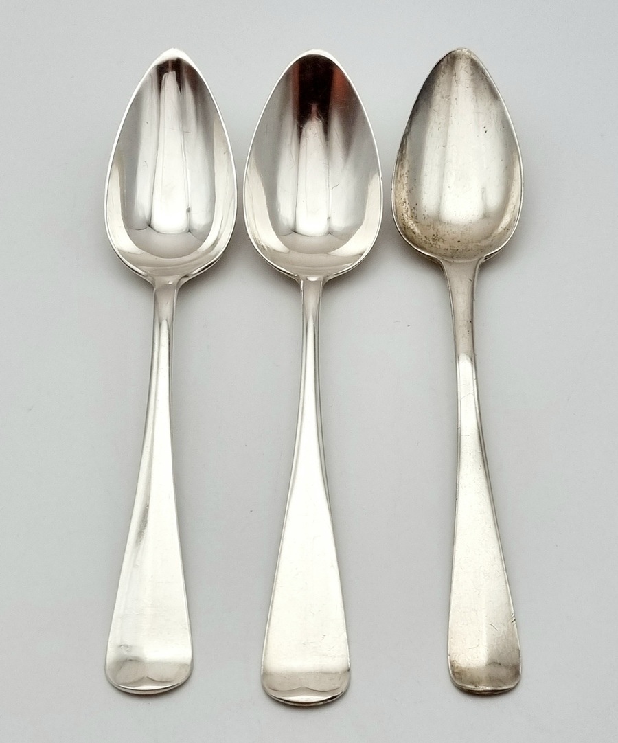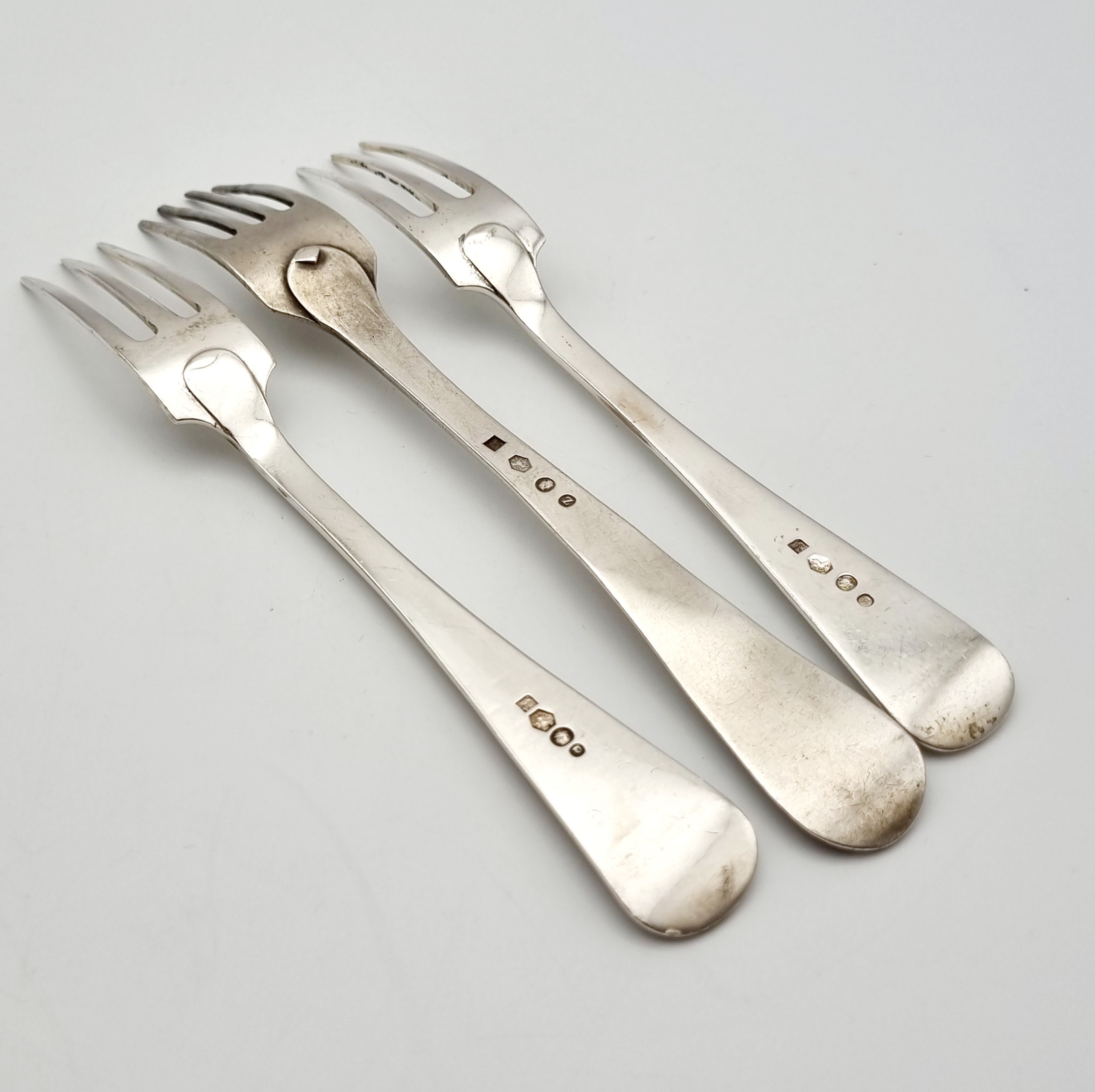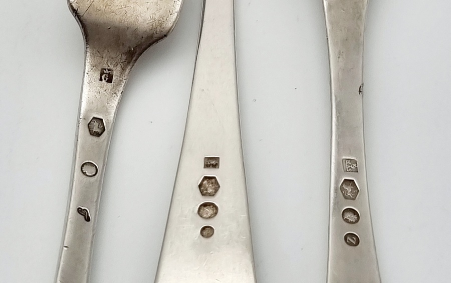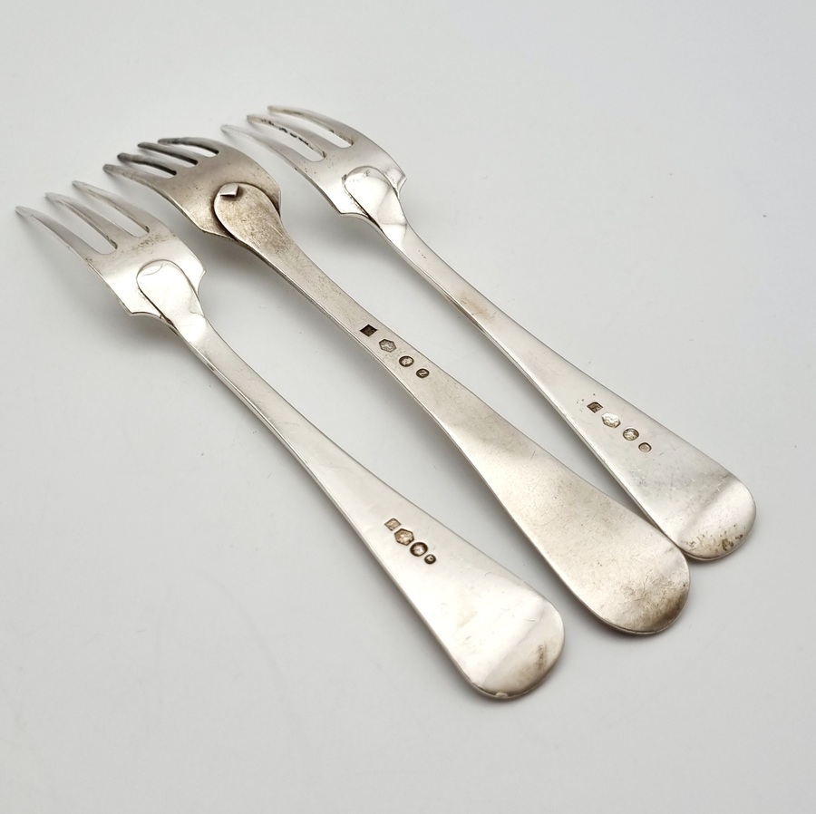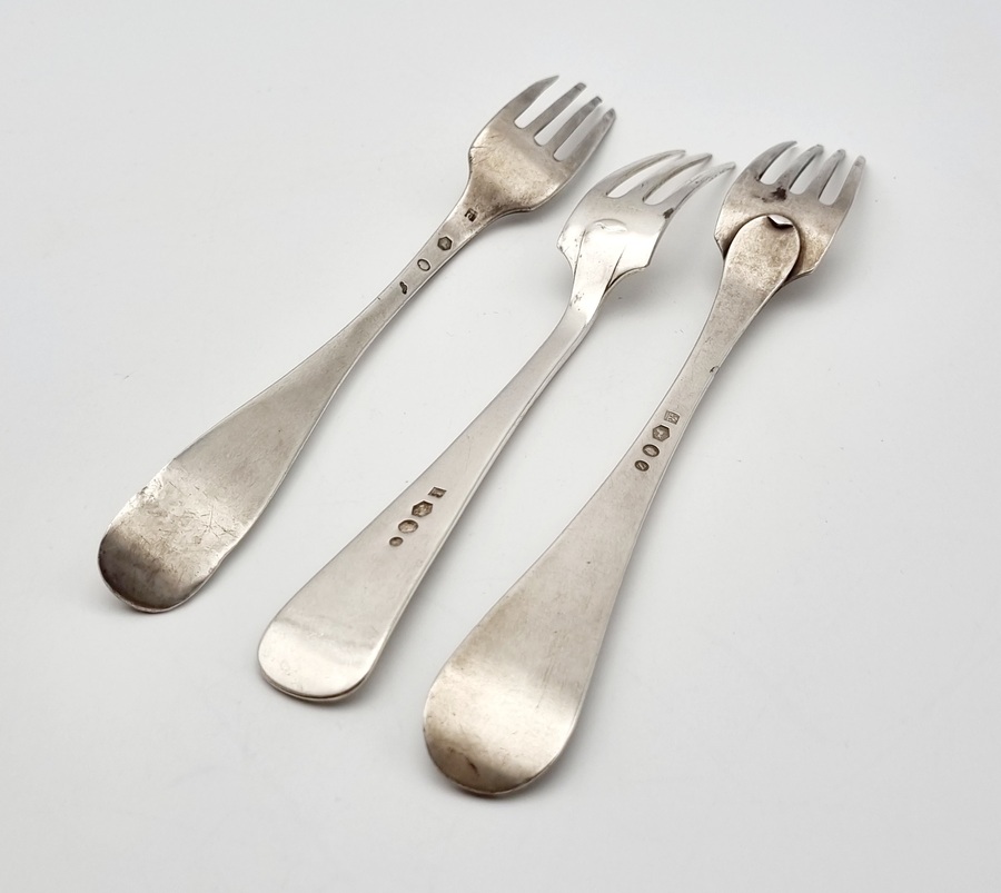 Lot zilveren Haags Lofje bestek bestaande uit drie lepels en zes vorken. Gemerkt lopende leeuw 2, meesterteken Van Kempen, minervakop en diverse jaarletters. |