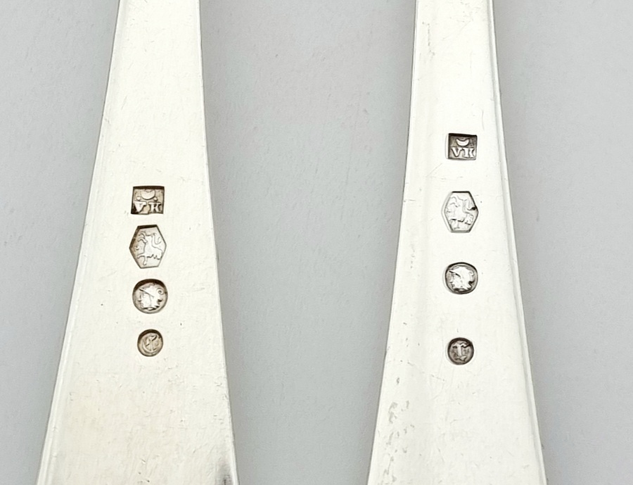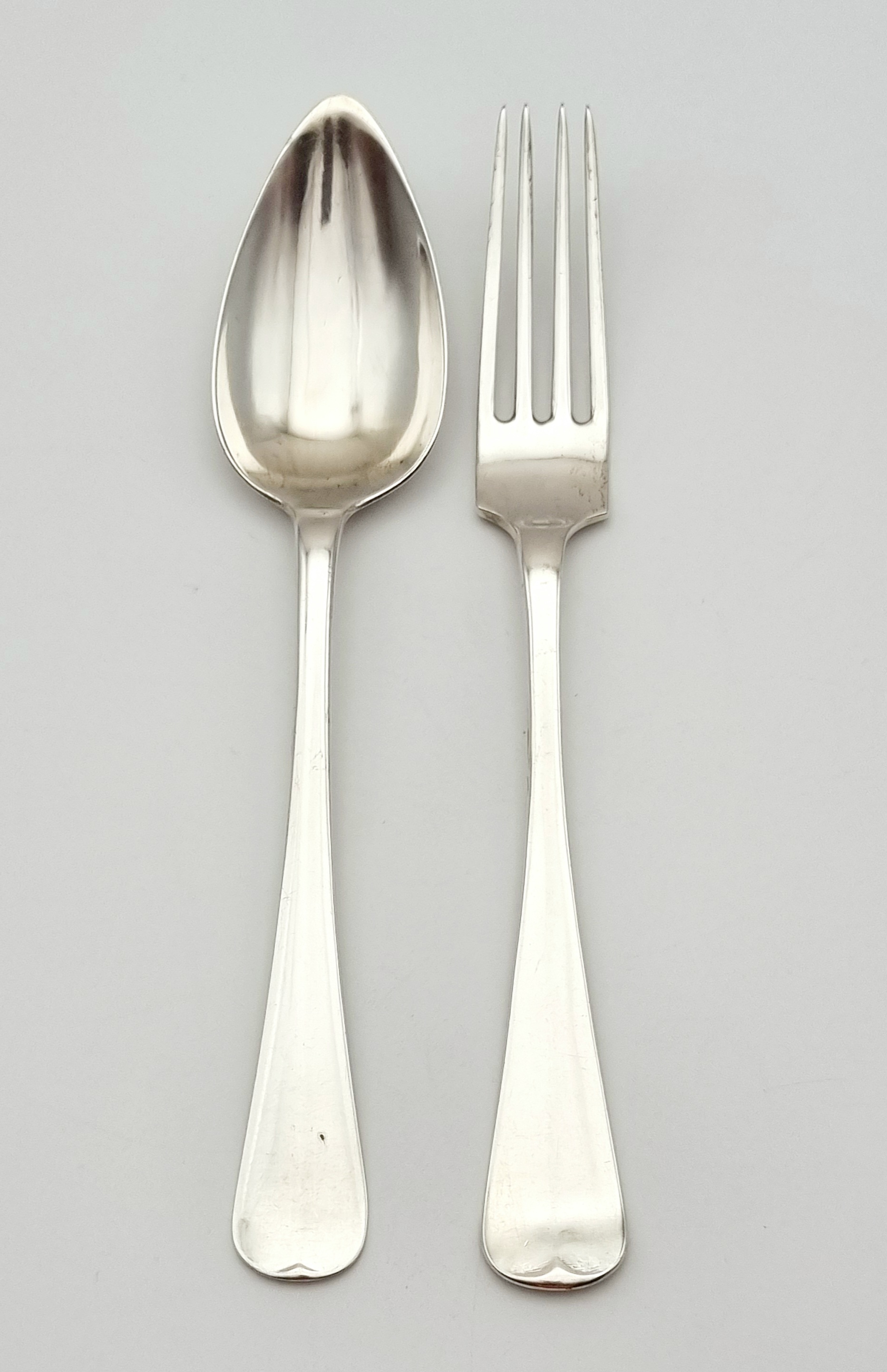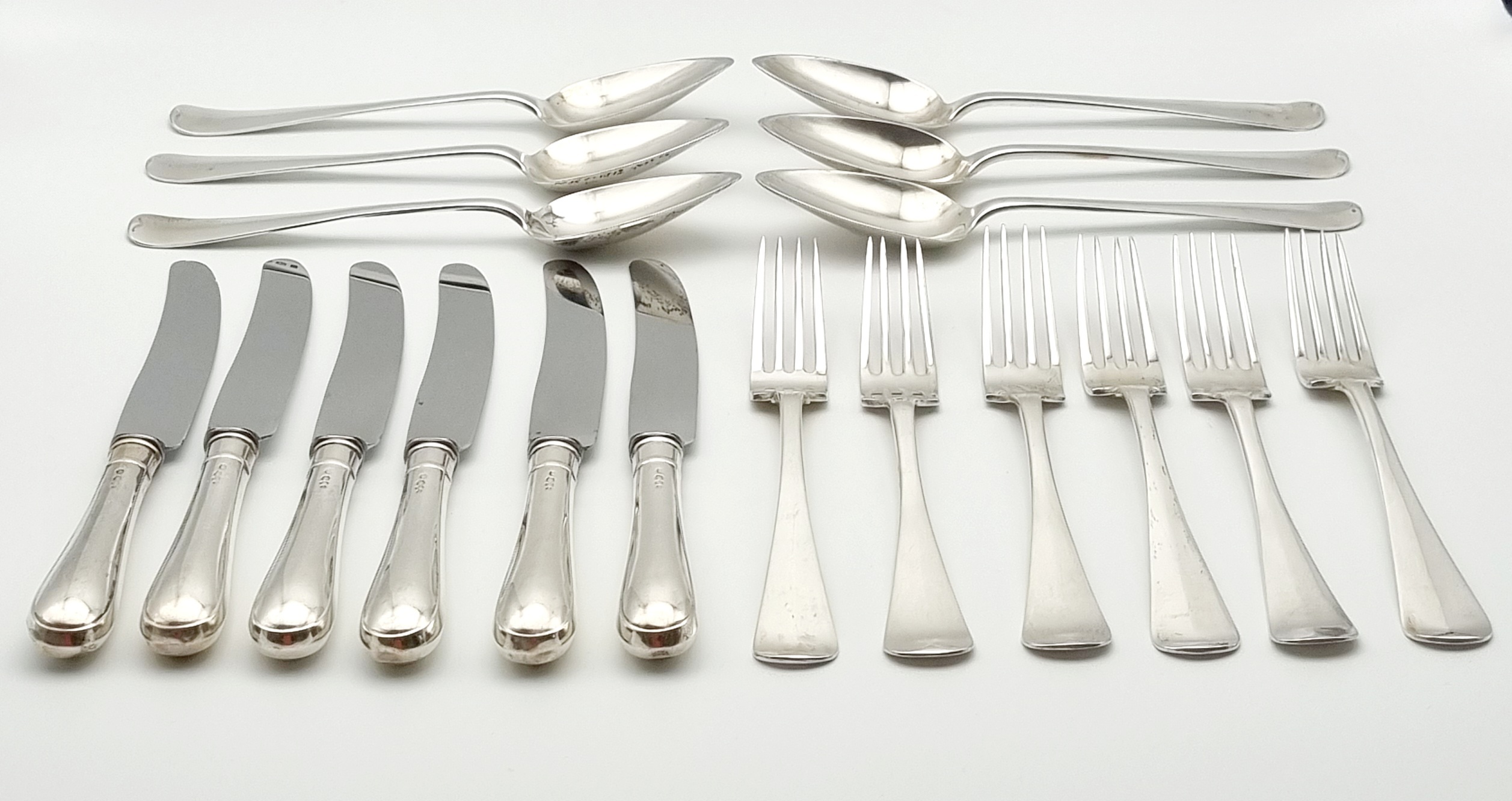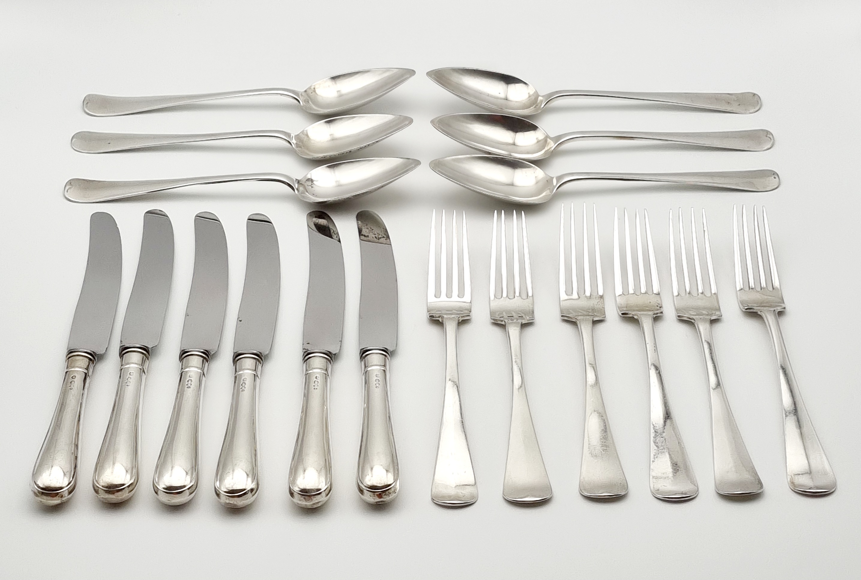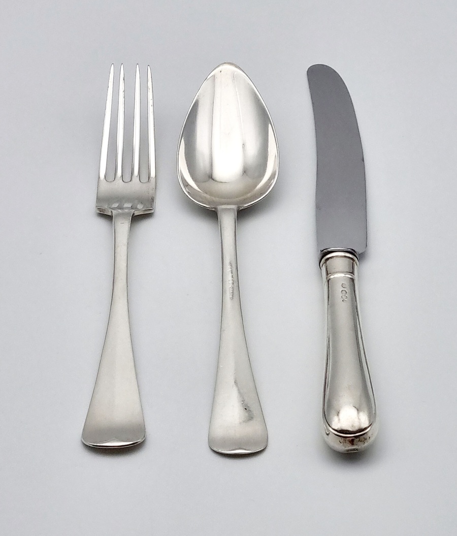 Zespersoons zilveren Haags Lofje dinerbestek, achttiendelig Nederlands zilver. Bestaande uit vorken, lepels en messen en gemerkt met lopende leeuw 2, verschillende meesterkeuren, minervakop en jaarletters. |