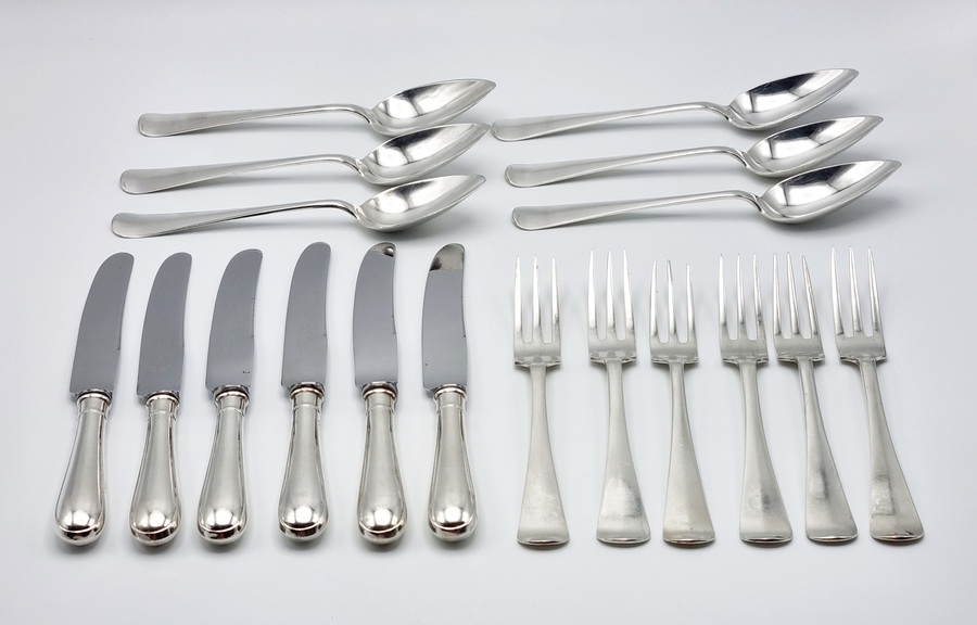 Zespersoons zilveren Haags Lofje ontbijtbestek van Van Kempen, Voorschoten. Achttiendelig Nederlands zilver, set bestaande uit vorken, lepels en messen. Gemerkt met lopende leeuw 2, meesterkeur Van Kempen, minervakop en jaarletters. |