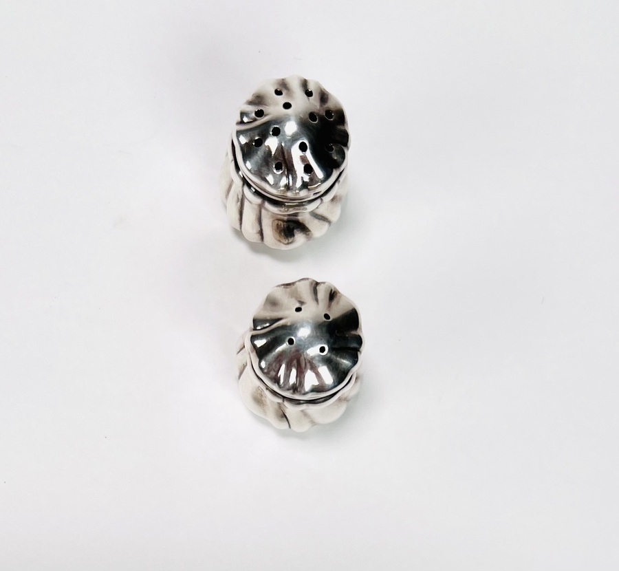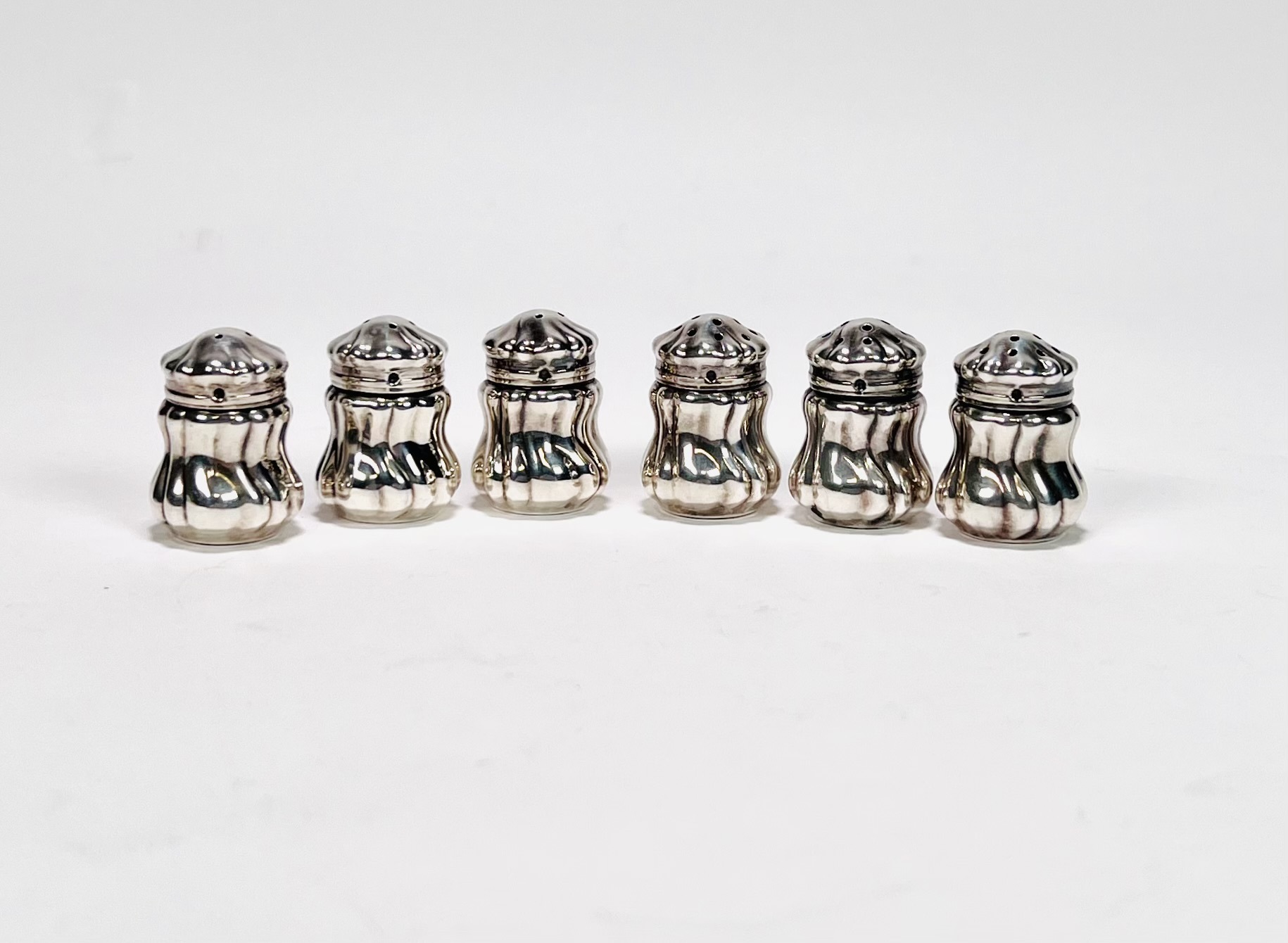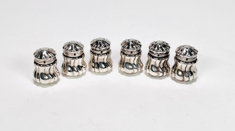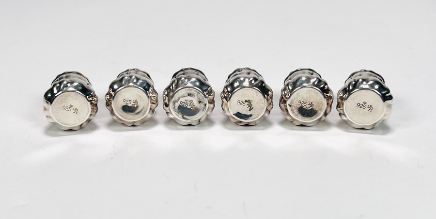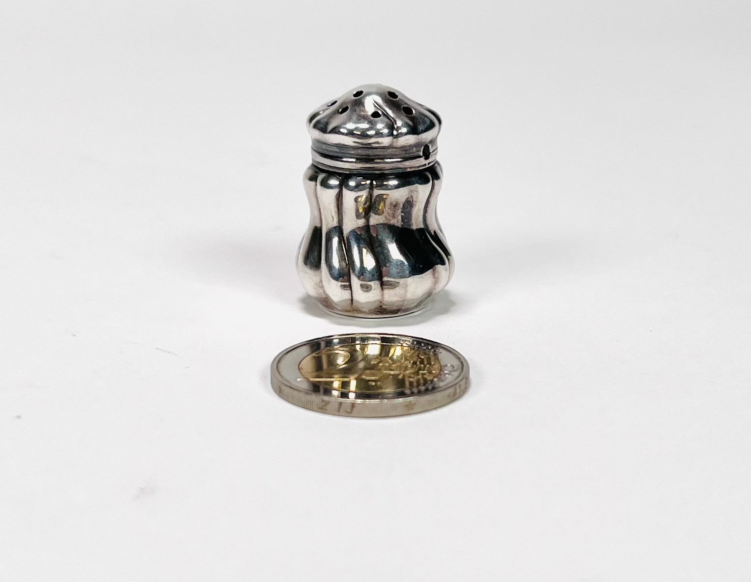 Drie Sterling miniatuur zilveren peper- en zoutstellen, aan de onderzijde gemerkt 925 Sterling. |