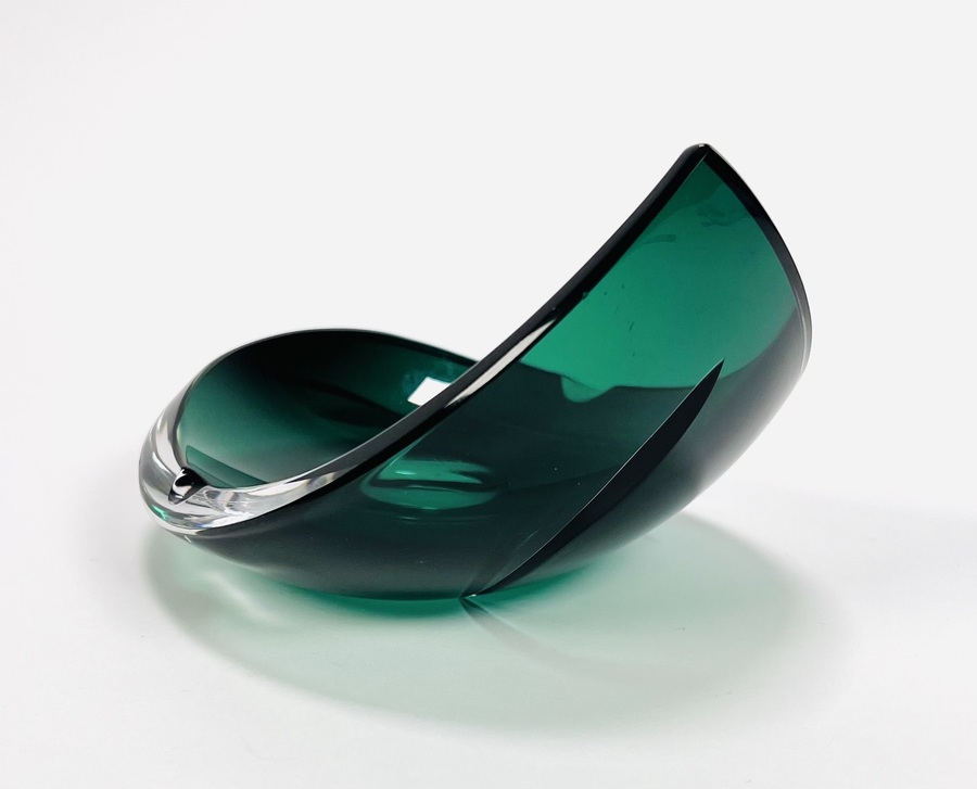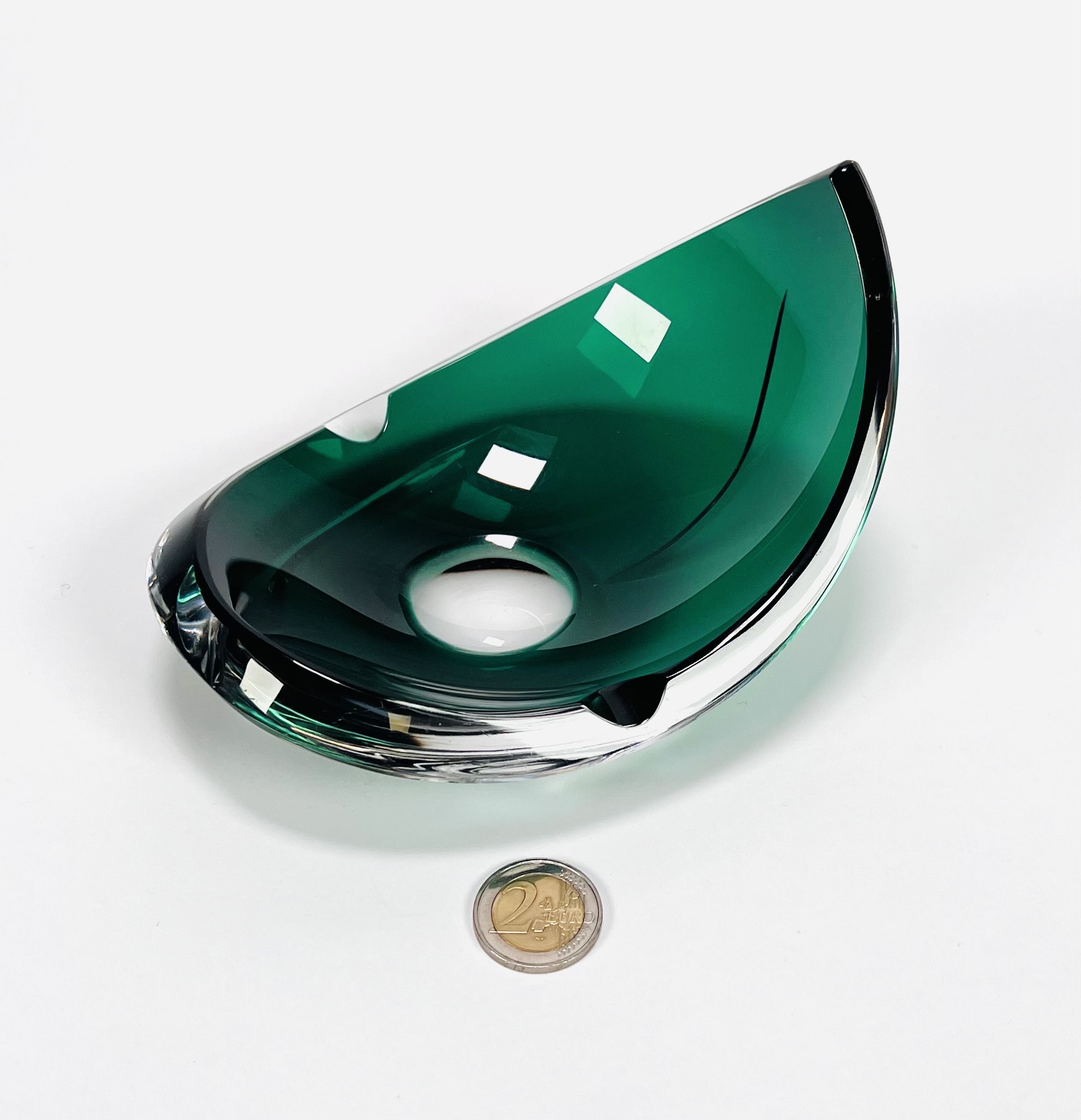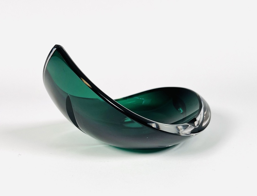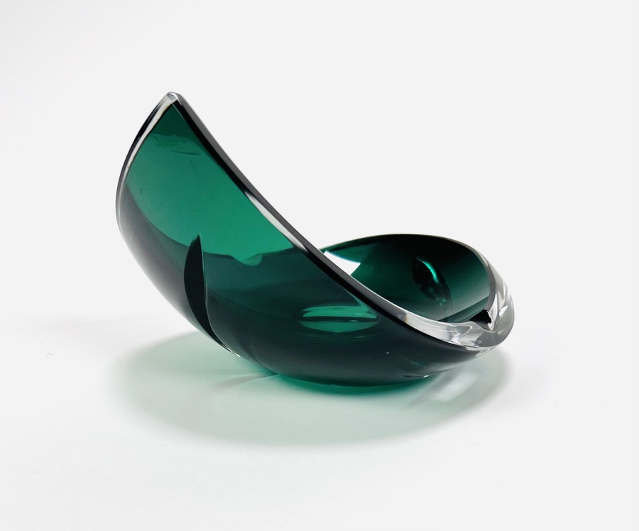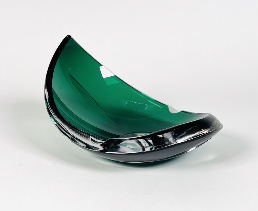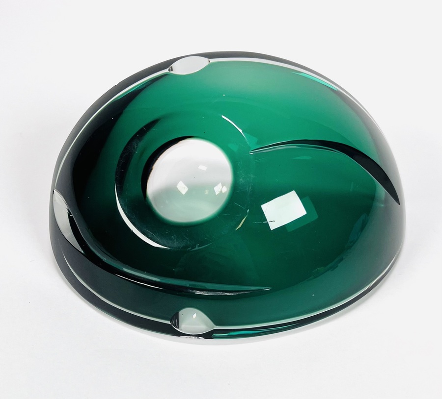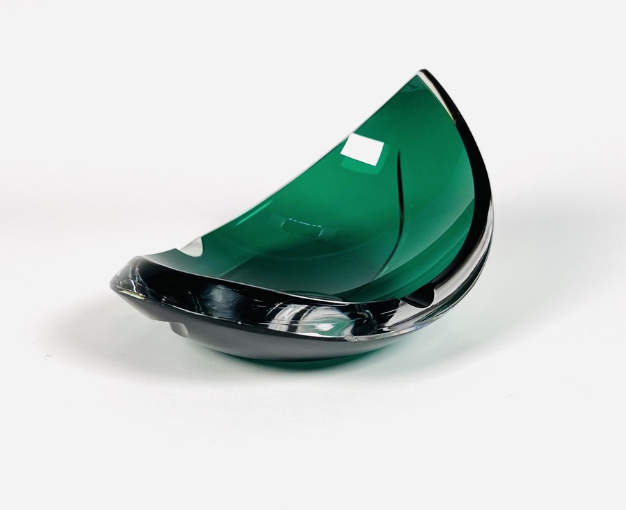 Smaragdgroene kristallen asbak met geslepen patroon door Val Saint Lambert. België, jaren 70. |