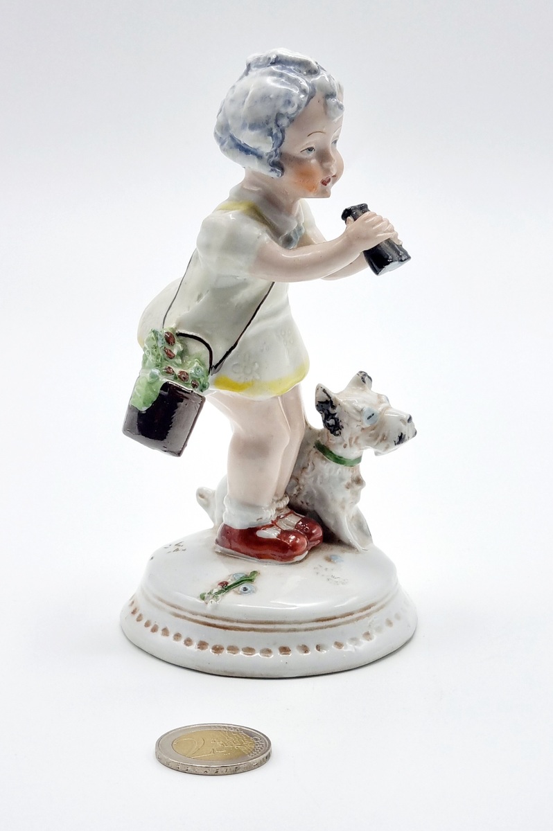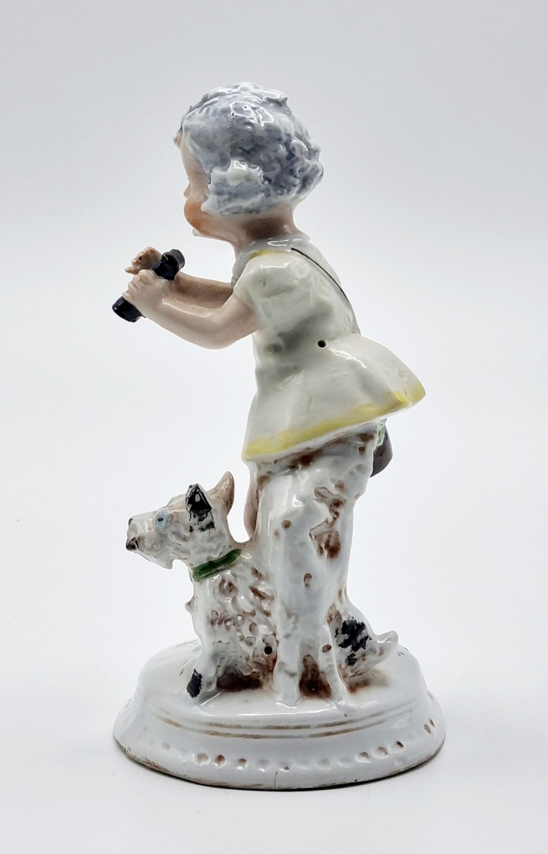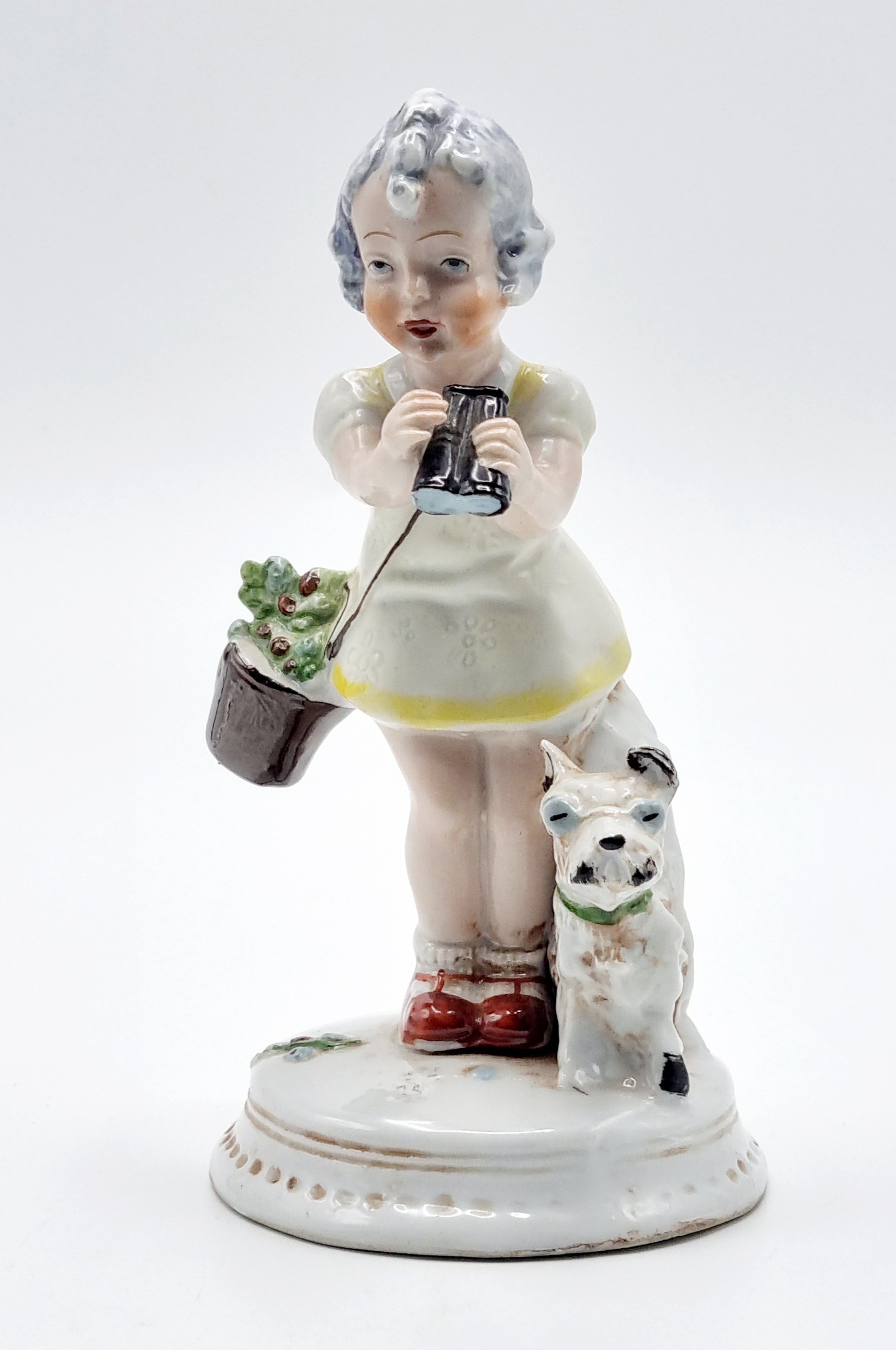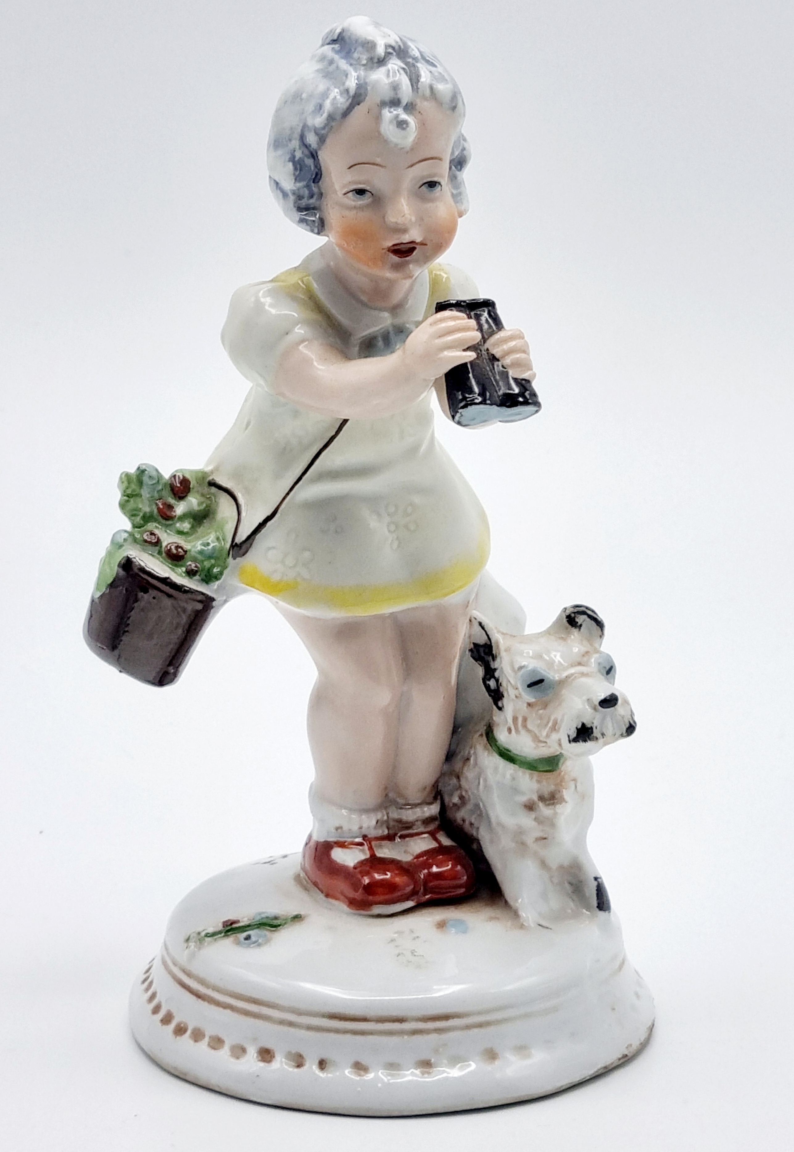 Porseleinen polychroom beschilderd beeld van een meisje met verrekijker en hond, door Wagner & Apel, Lippelsdorf. Aan de onderzijde gemerkt met modelnummer 21310, Germany, rood logo en 1859. Duitsland, eerste helft 20e eeuw. |