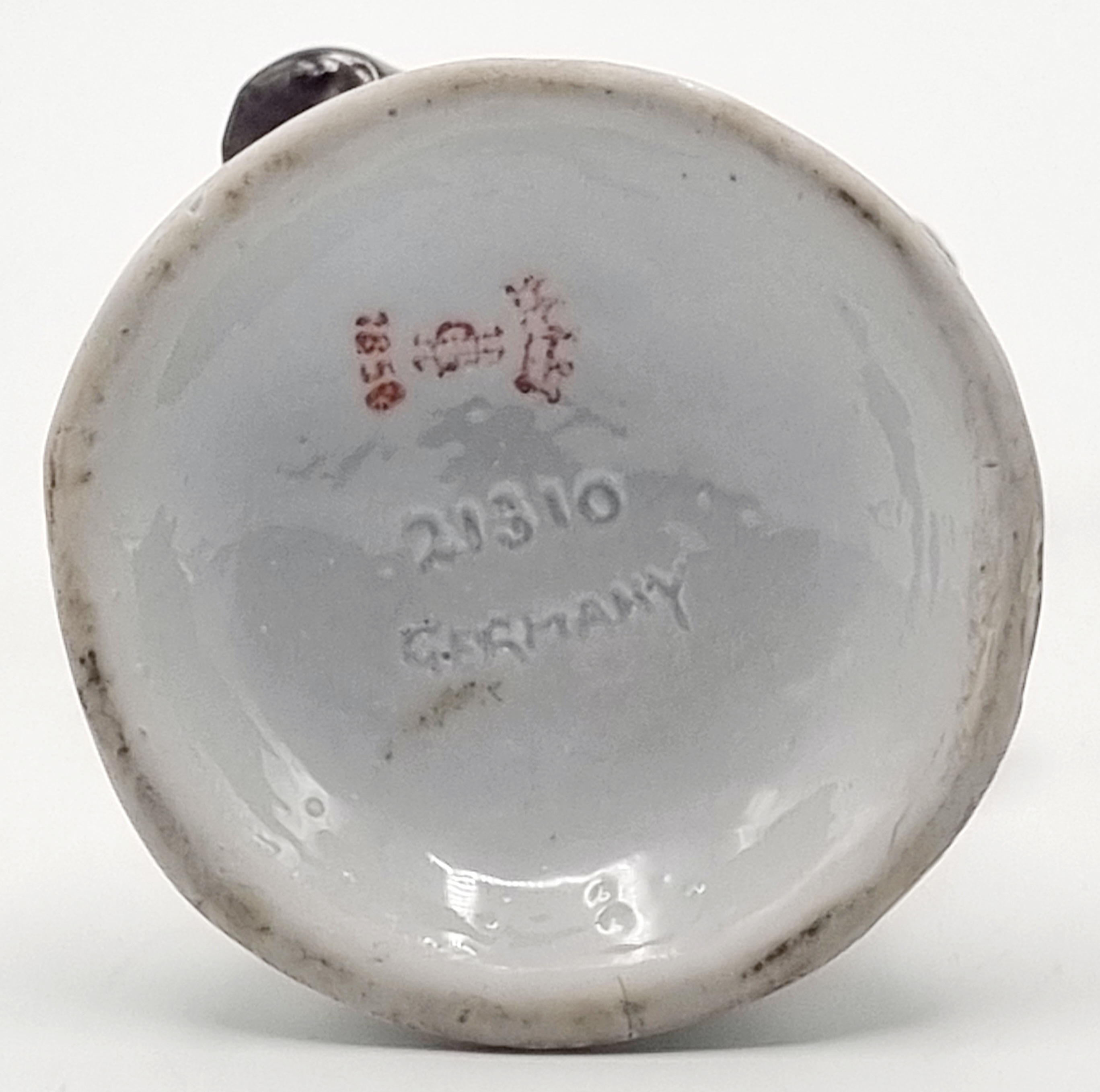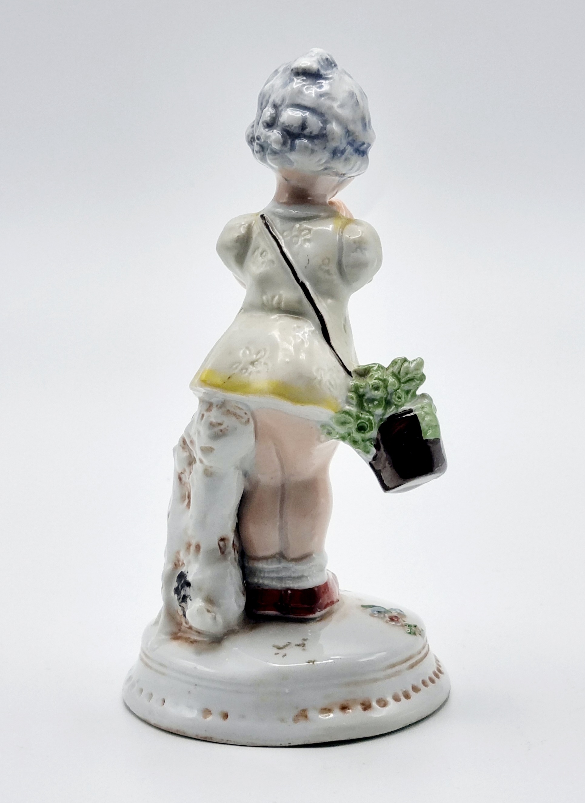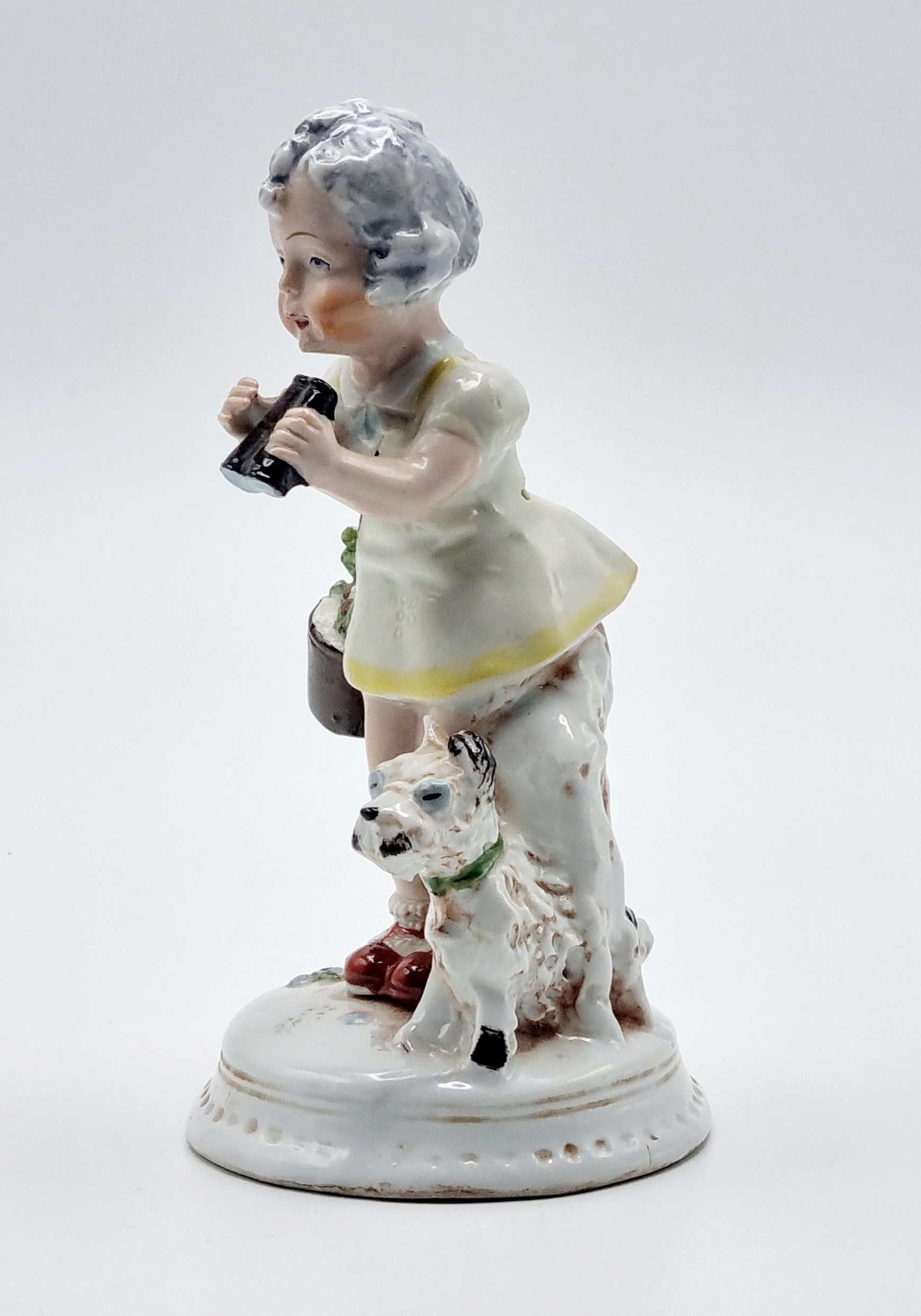 Porseleinen polychroom beschilderd beeld van een meisje met verrekijker en hond, door Wagner & Apel, Lippelsdorf. Aan de onderzijde gemerkt met modelnummer 21310, Germany, rood logo en 1859. Duitsland, eerste helft 20e eeuw. |