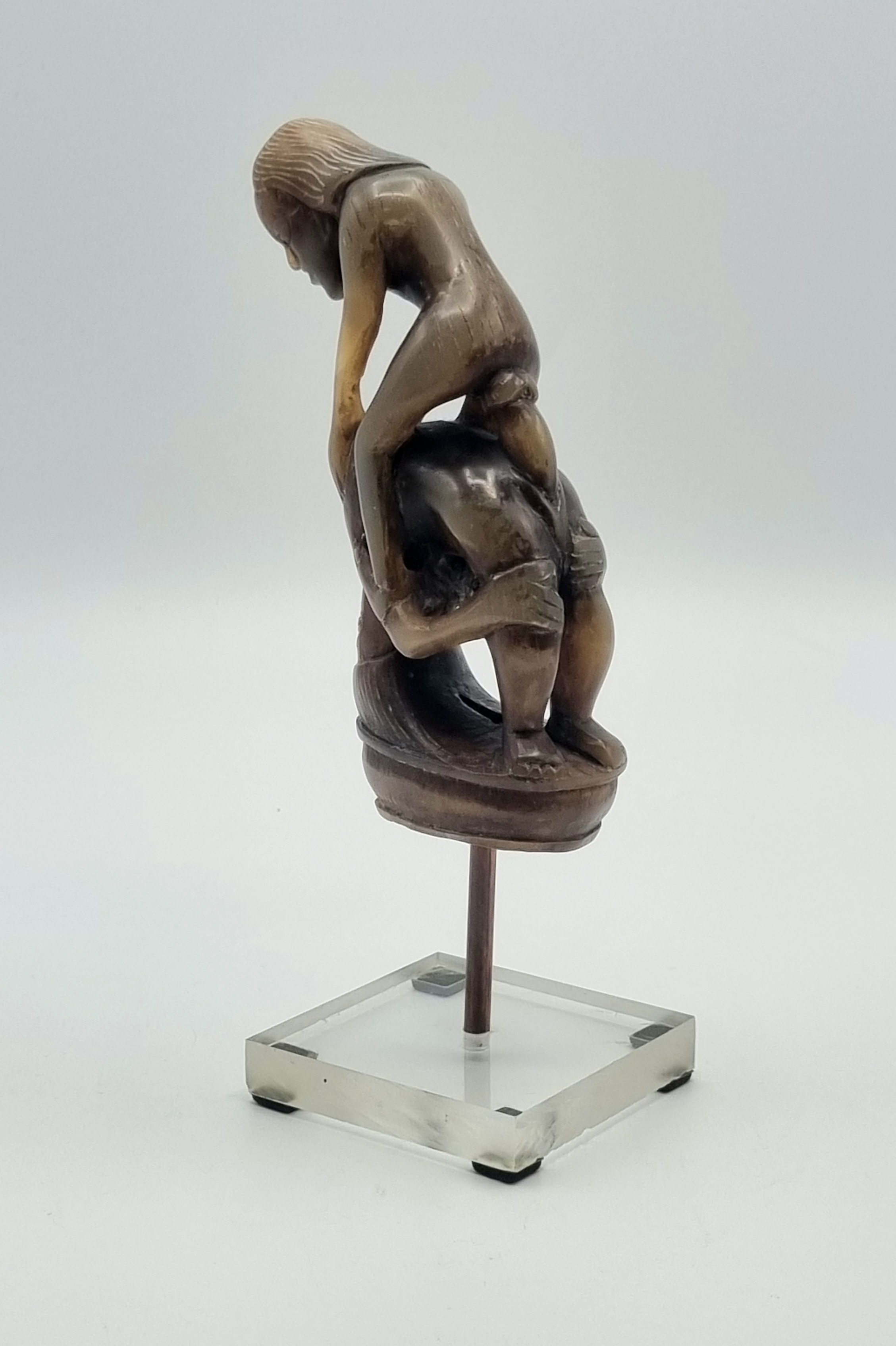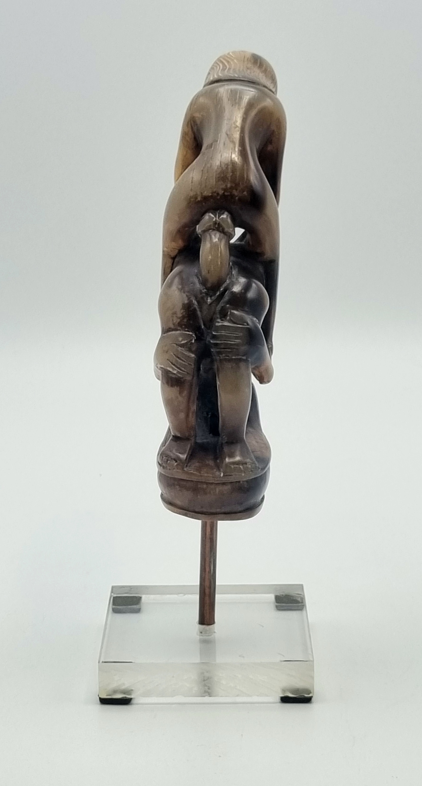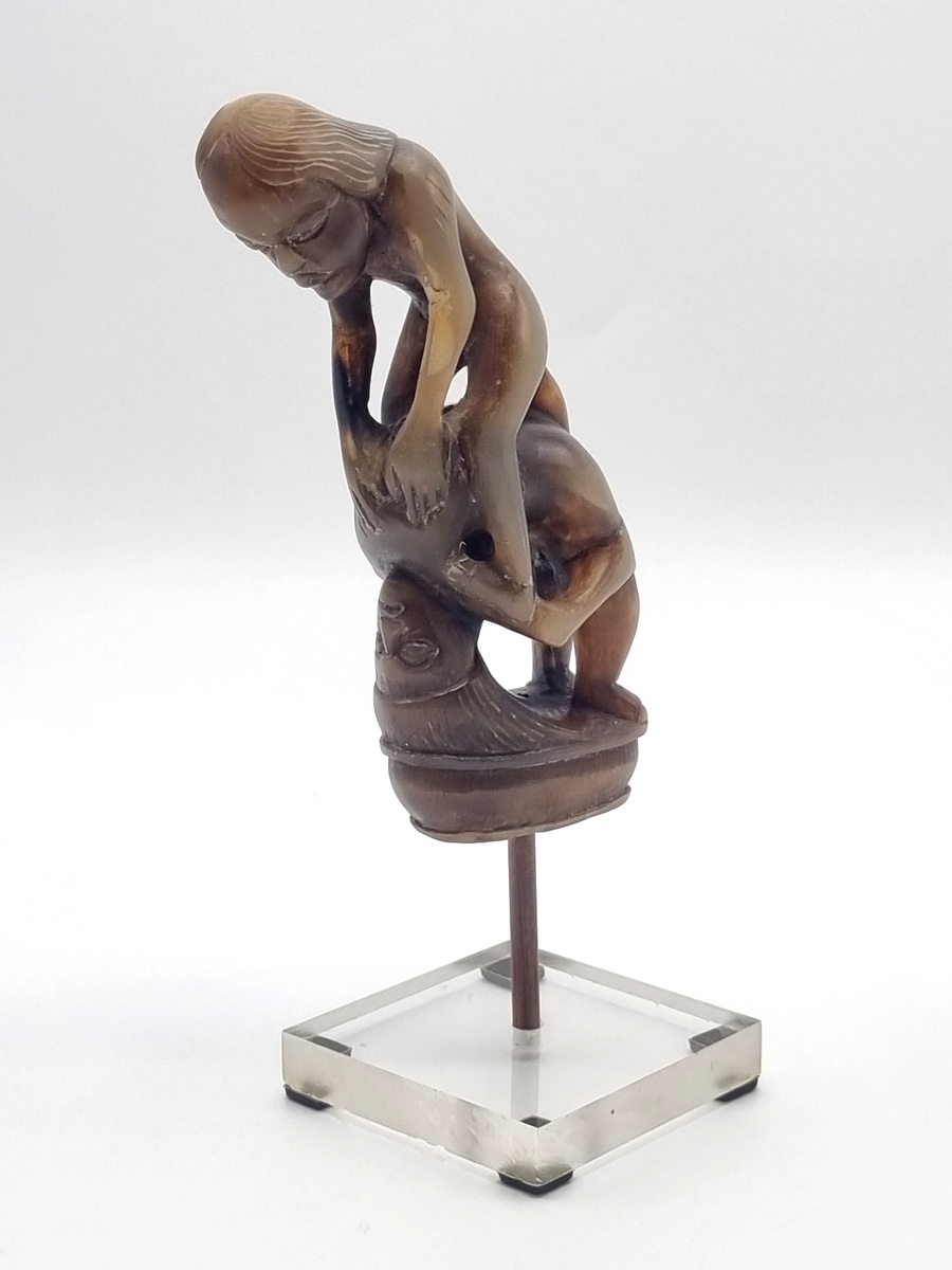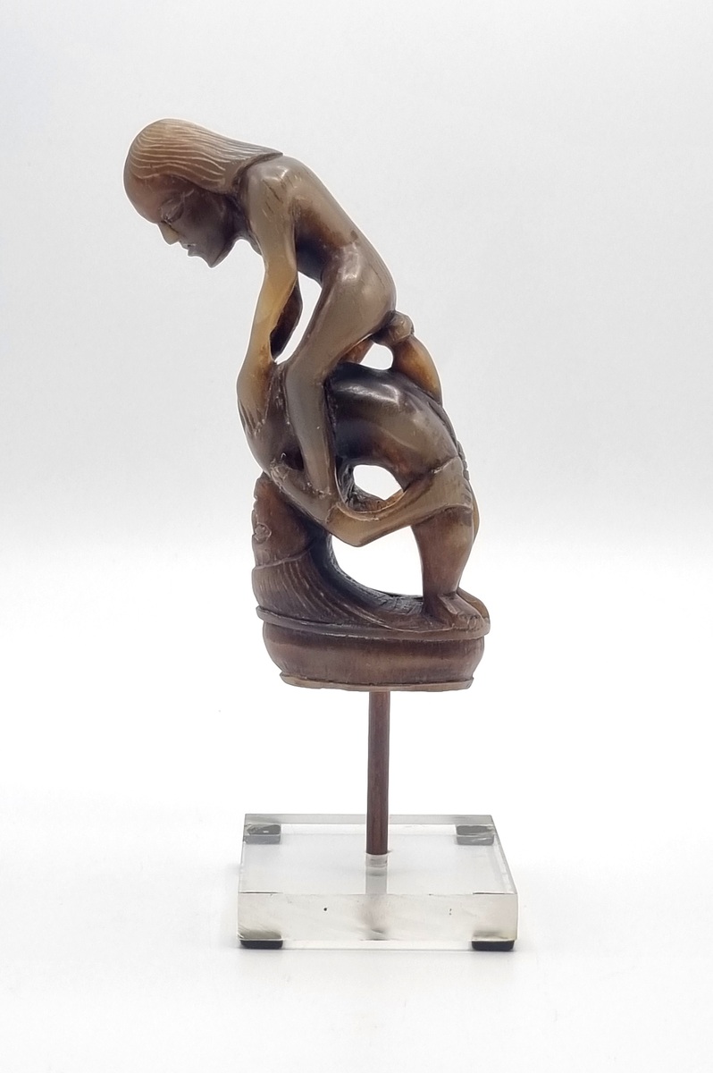 Hoornen beeldje met erotische voorstelling, oorspronkelijke een heft behorend bij een mes. Indonesië, begin 20e eeuw. |