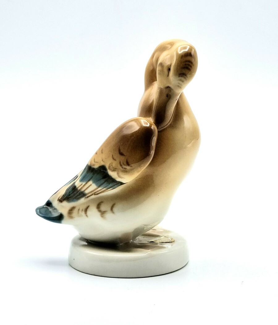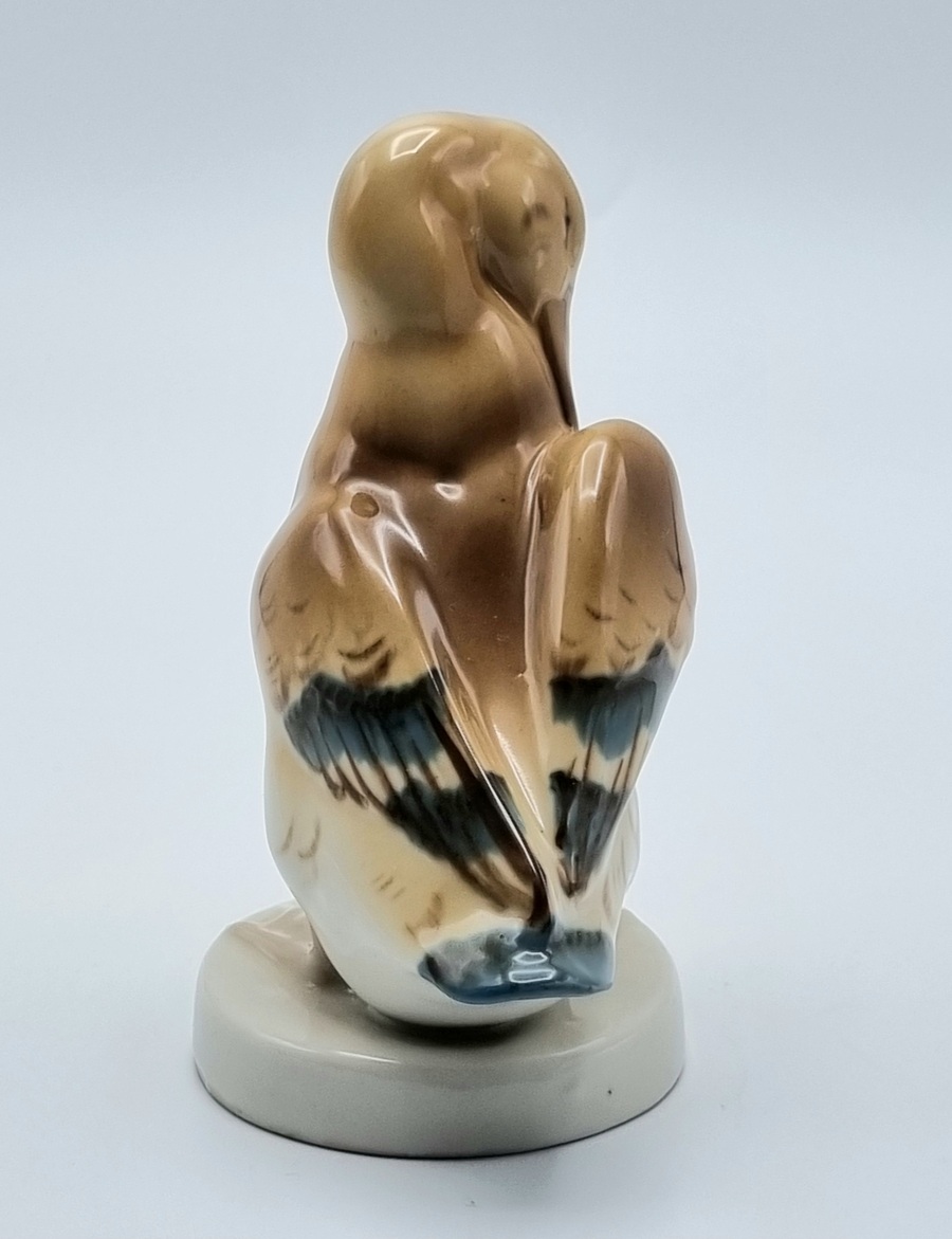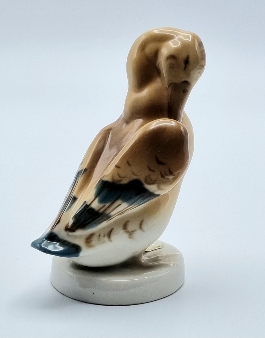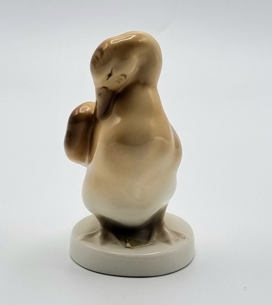 Porseleinen beeldje van een eend, uitgevoerd door Royal Dux. Voorzien van originele driehoek sticker van Royal Dux en aan de onderzijde gemerkt met stempel en voorzien van modelnummer 3160 19. Made in Czechoslovakia, midden 20e eeuw. |
