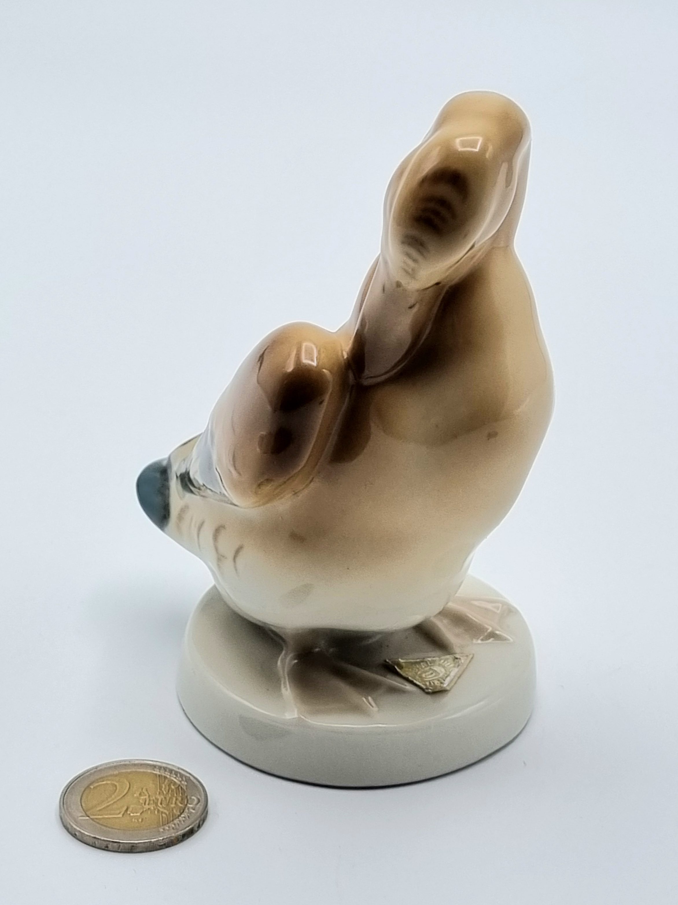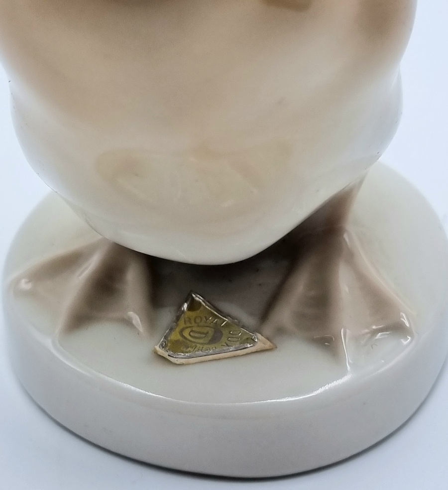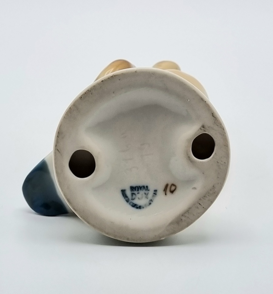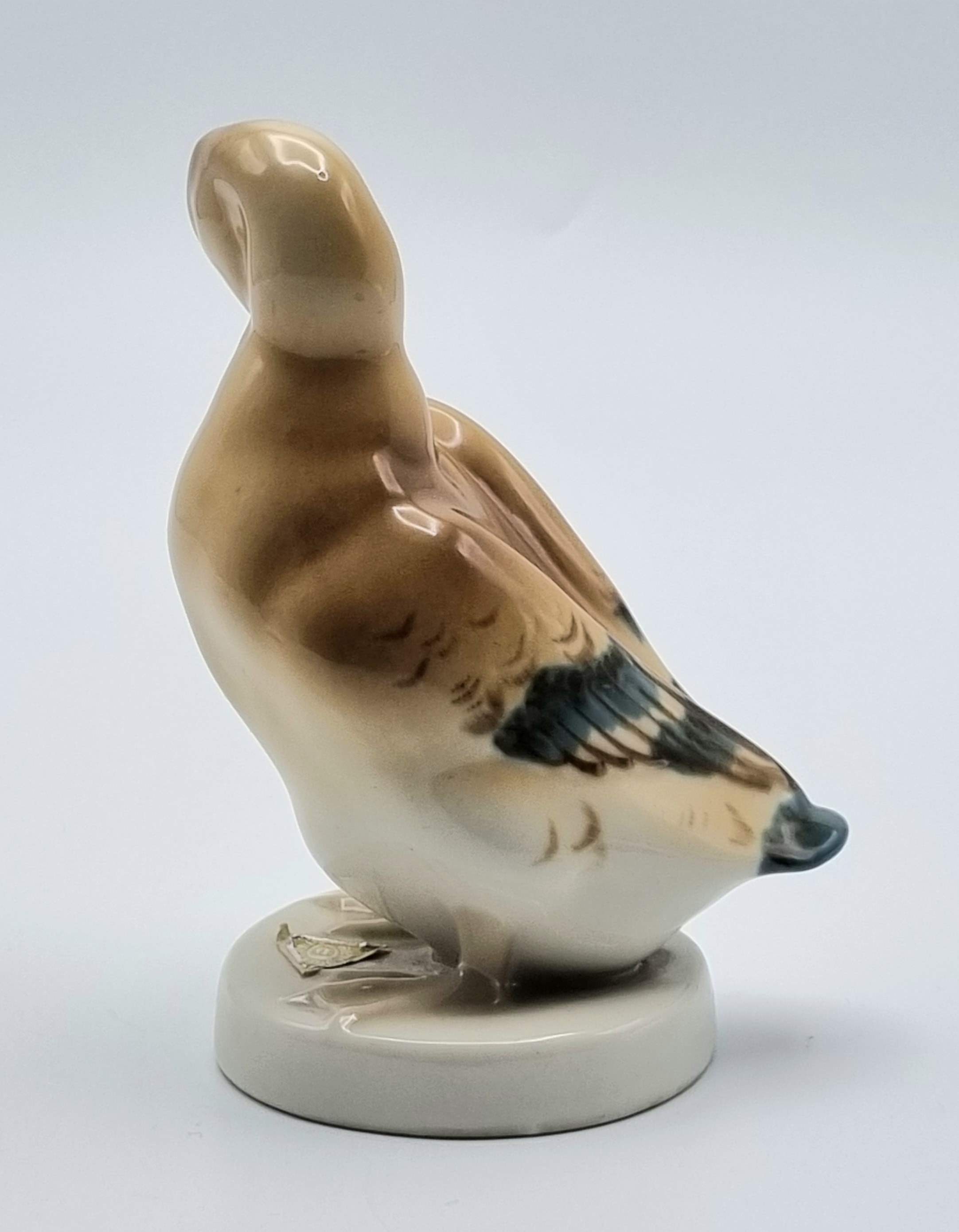 Porseleinen beeldje van een eend, uitgevoerd door Royal Dux. Voorzien van originele driehoek sticker van Royal Dux en aan de onderzijde gemerkt met stempel en voorzien van modelnummer 3160 19. Made in Czechoslovakia, midden 20e eeuw. |
