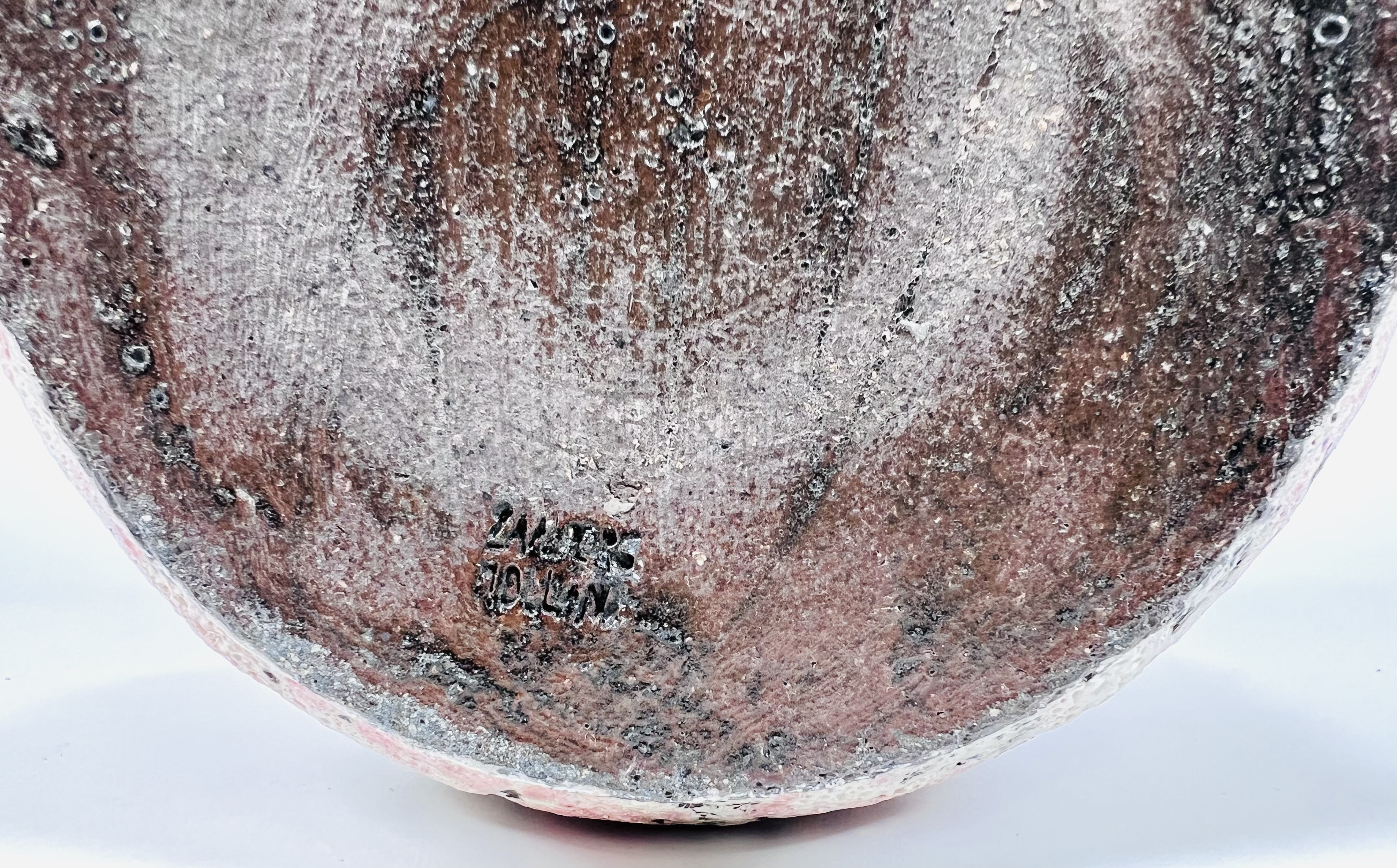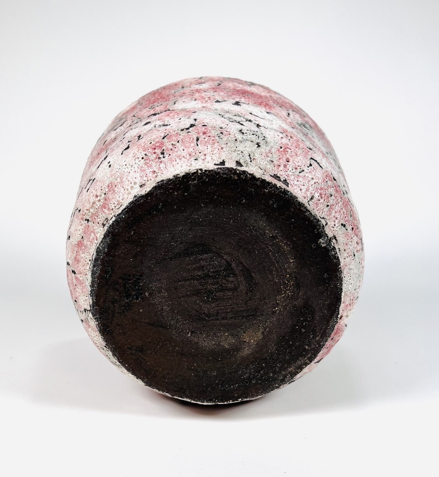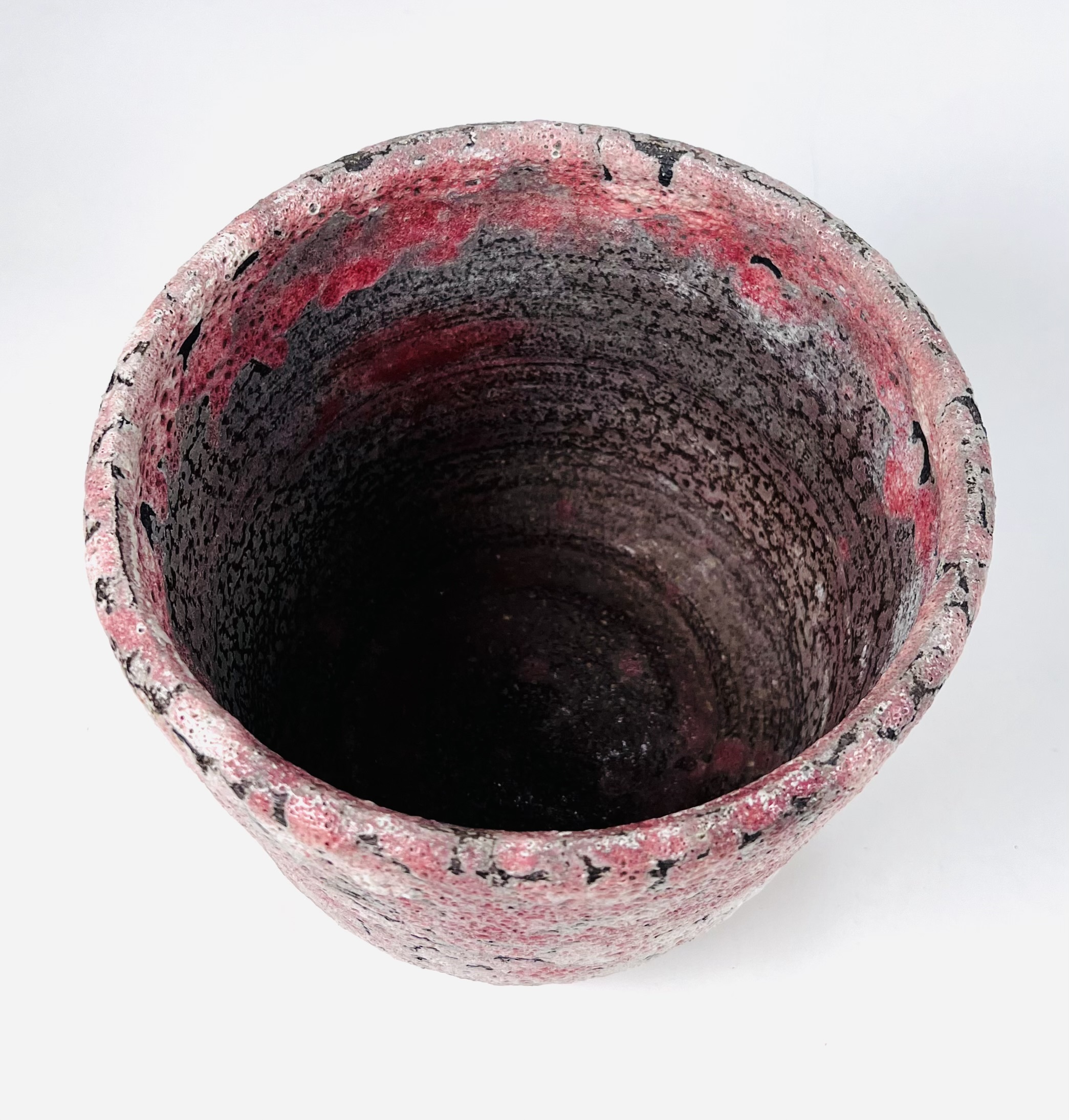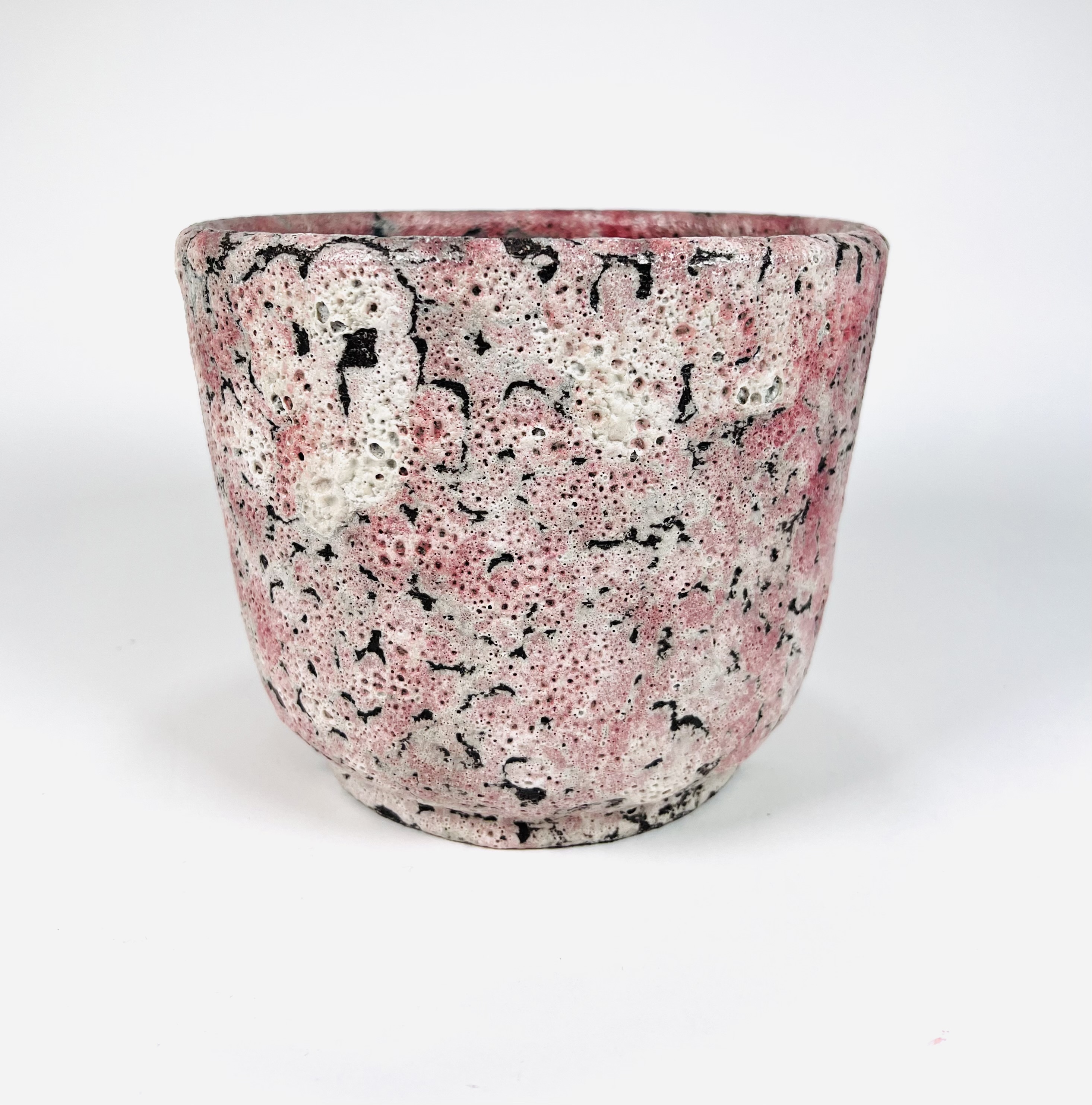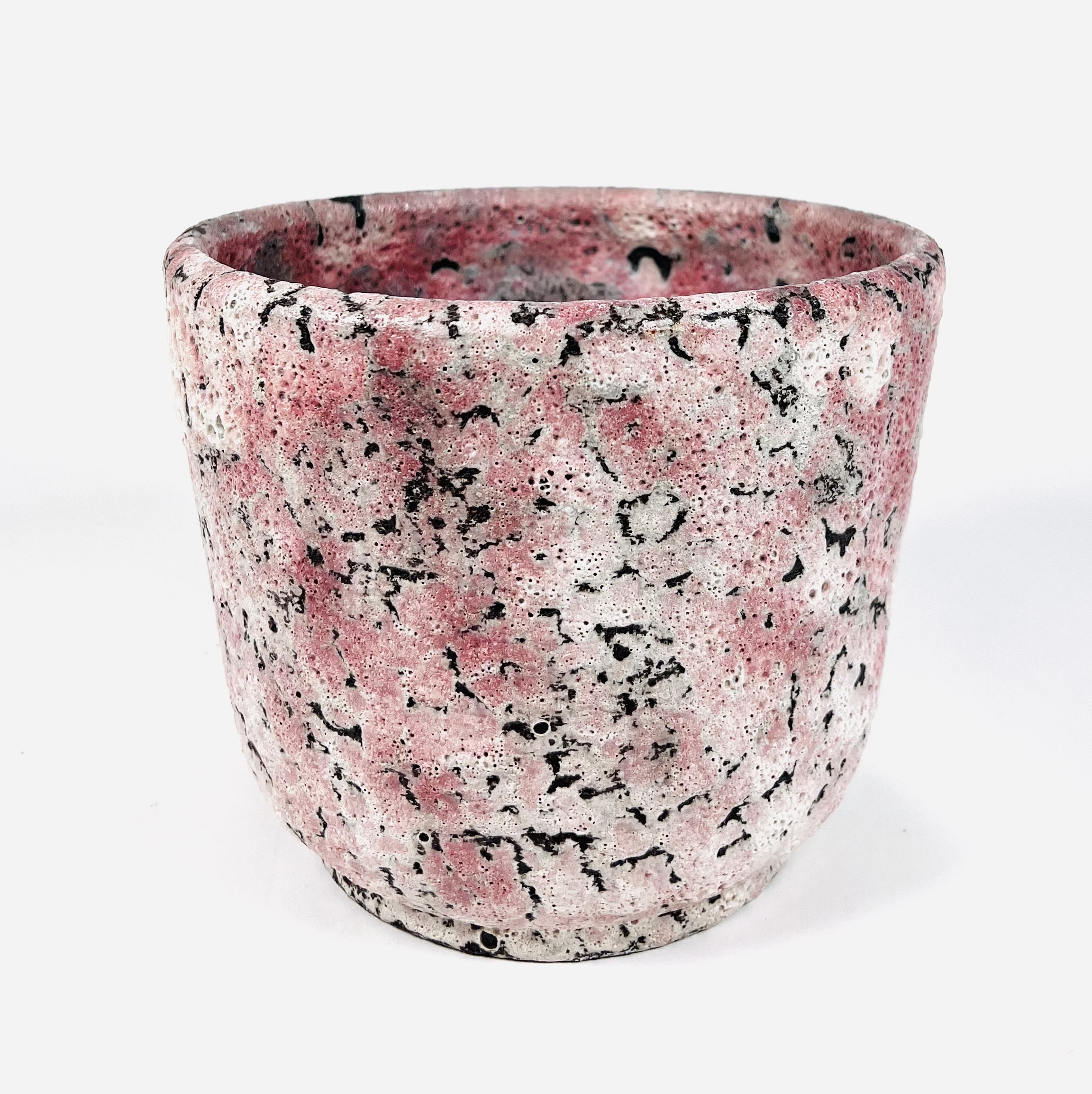Aardewerken cache-pot voorzien van roze-grijze bruisglazuur van Potterie Zaalberg te Zoeterwoude. Aan de onderzijde gemerkt Zaalberg Holland. Jaren 60. |