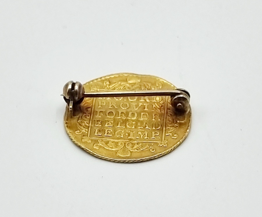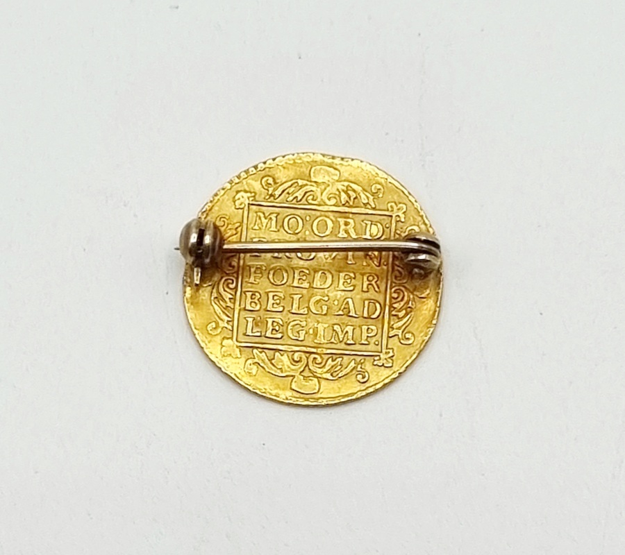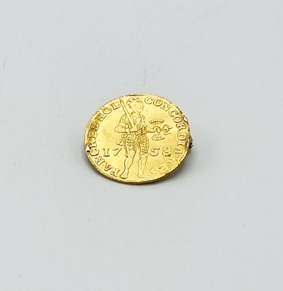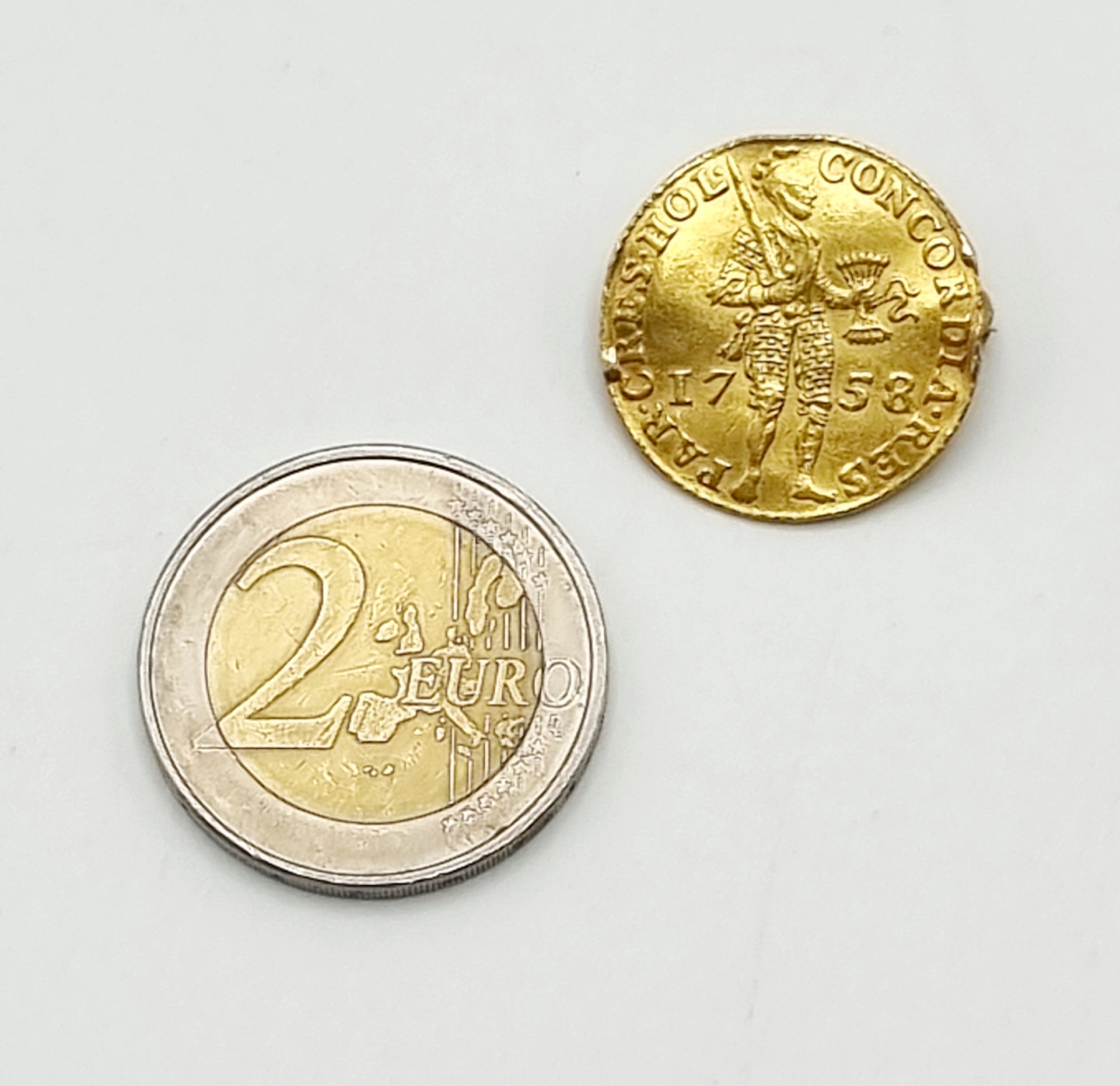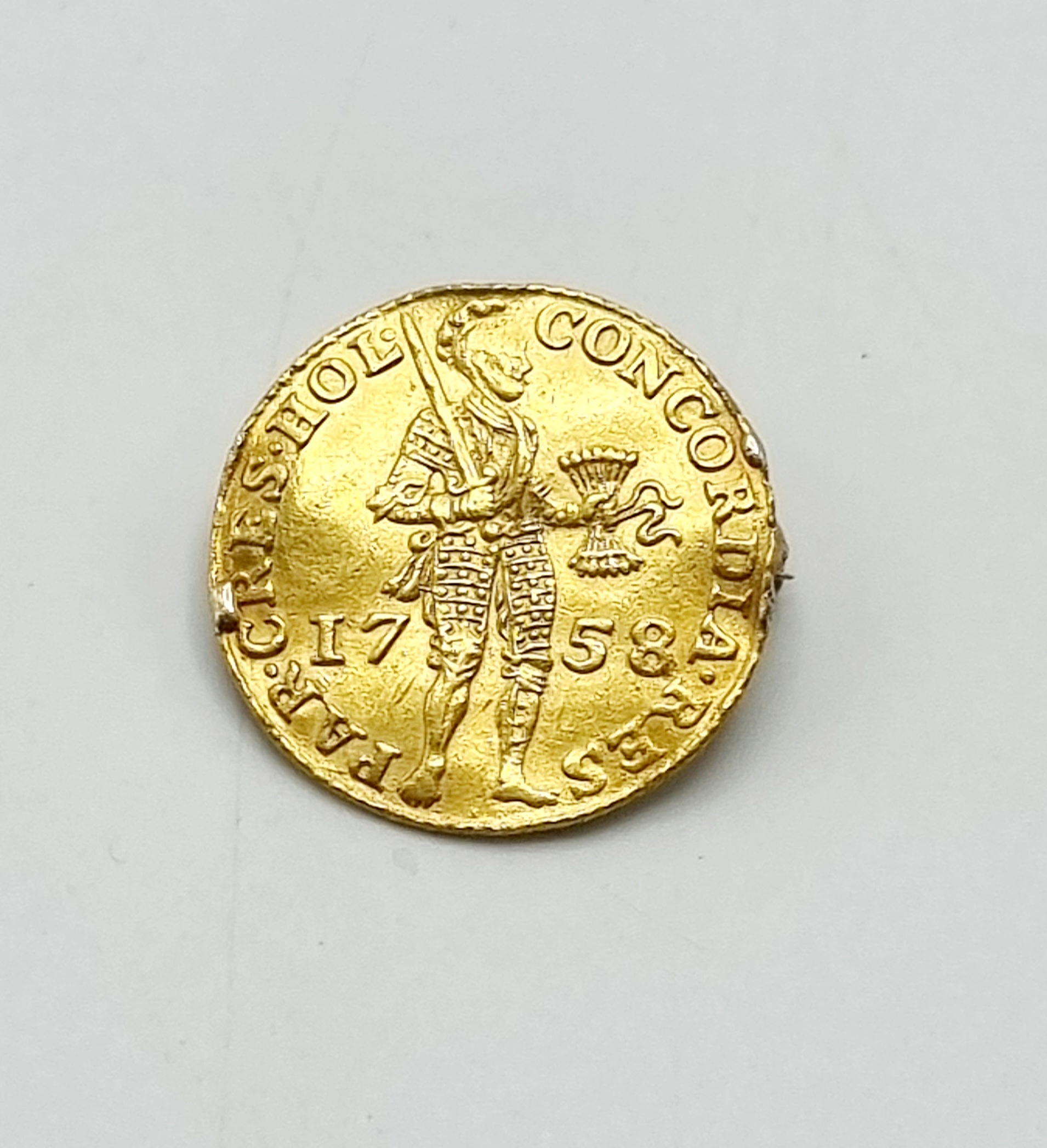 Hollandse gouden dukaat in brochevorm. Voorzijde een staande ridder met Spaanse helm, zwaard, bundel met zeven pijlen met opschrift “Concordia.Res. Par.Cres.Hol” met vermelding 1758 en keerzijde in vierkant “Mo.Ord.Provin.FoederBelg.Adlleg.Imp.”. |