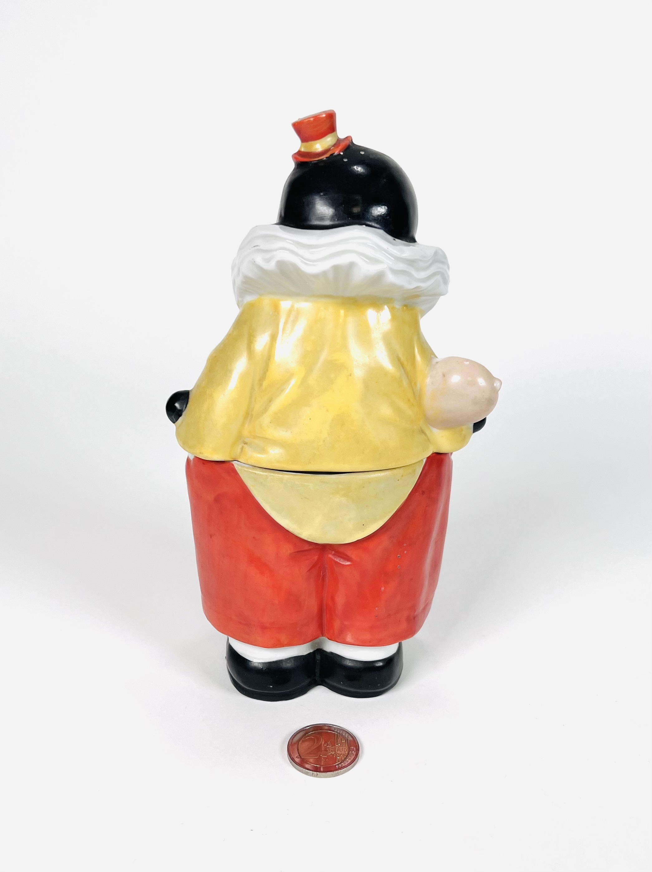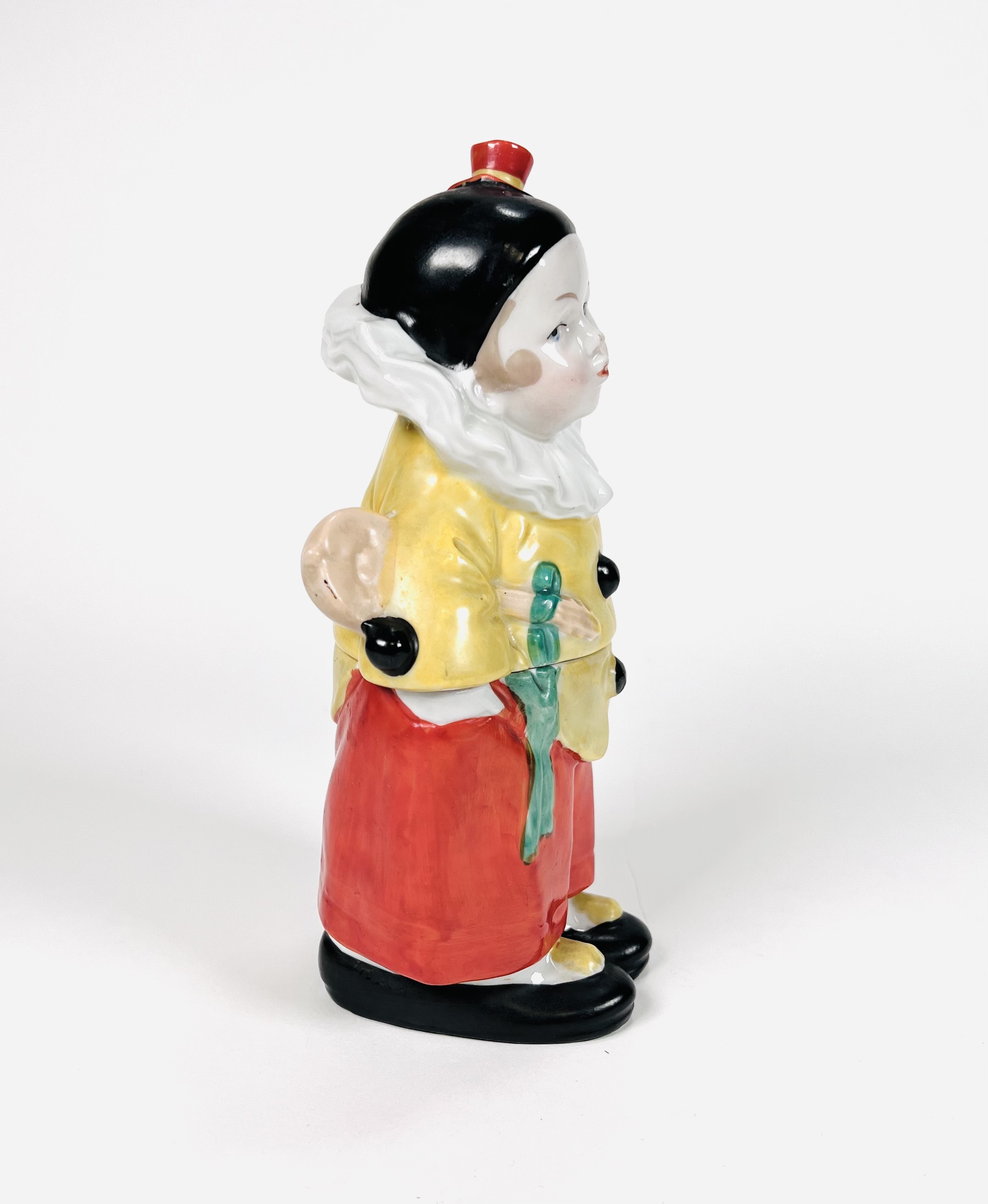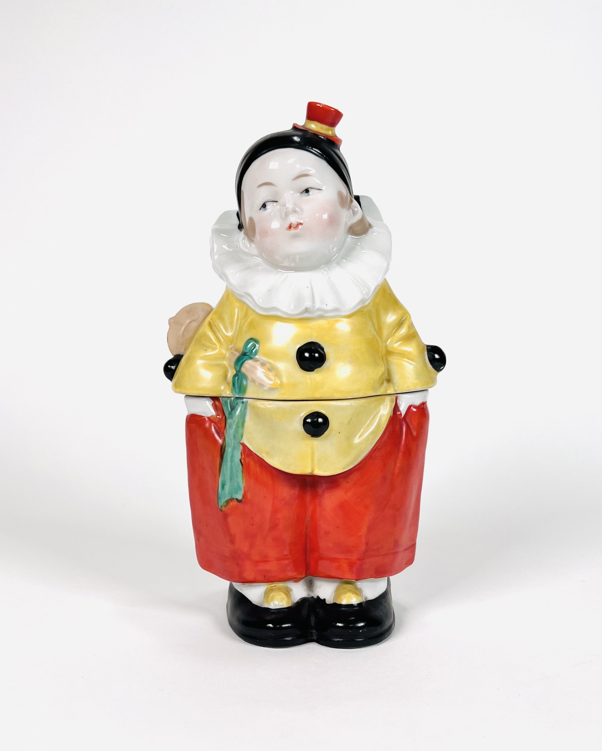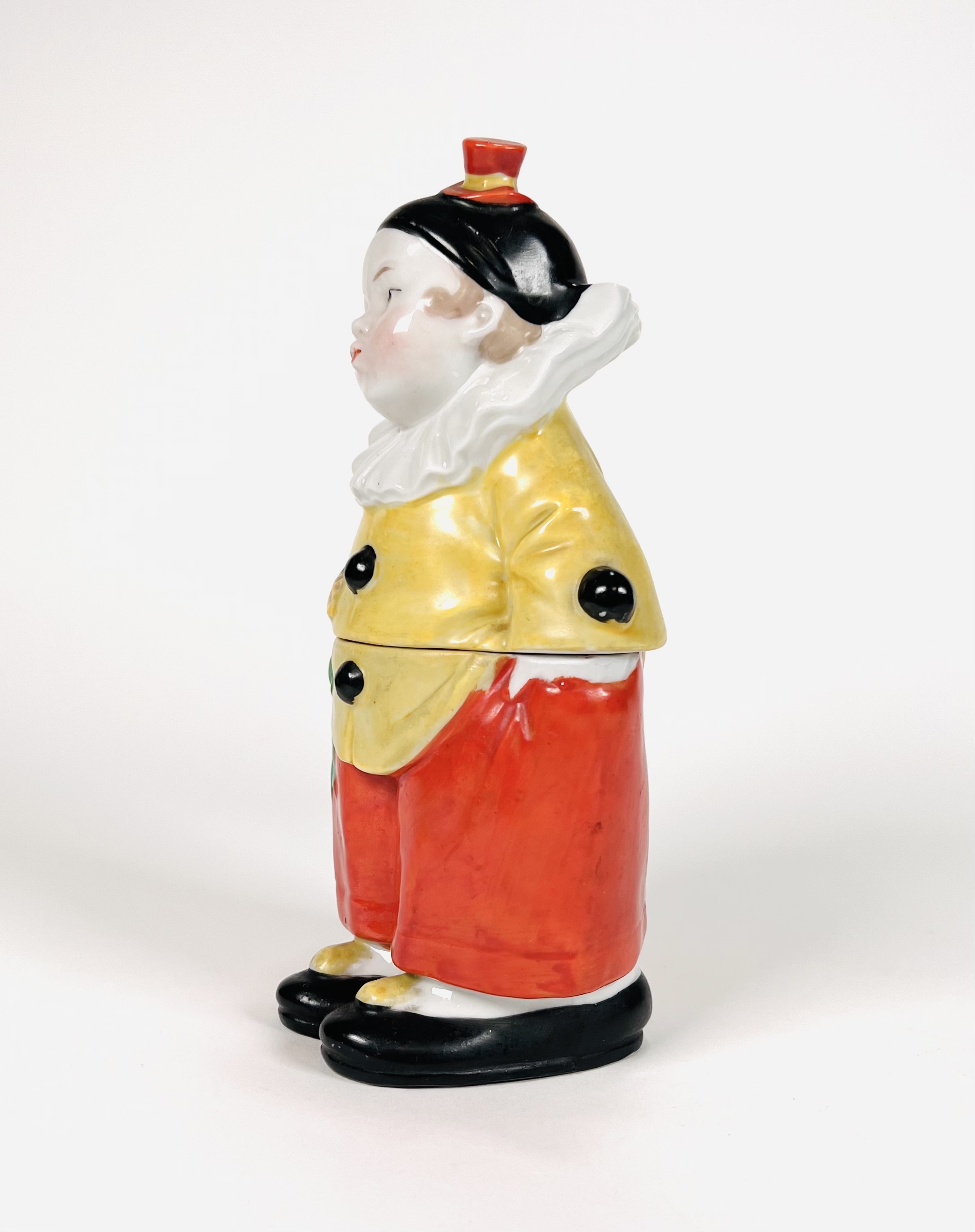 Keramieken Art Deco dekselpot van een jongen in gekleurd Pierrot kostuum met mandoline. Aan de onderzijde gemerkt met modelnummer 6029. Duitsland, jaren 30. |
