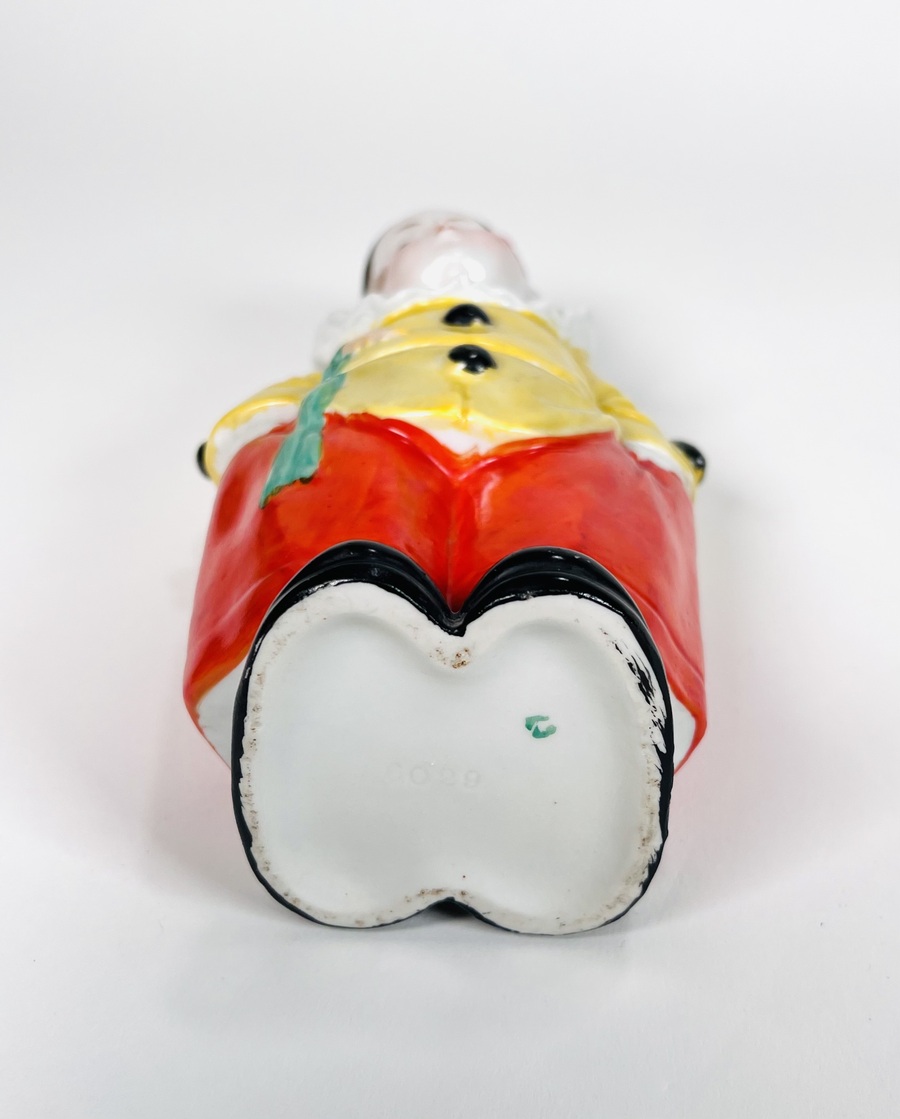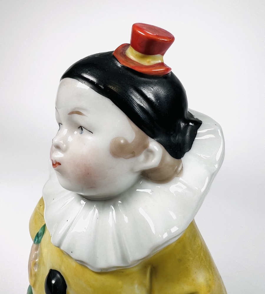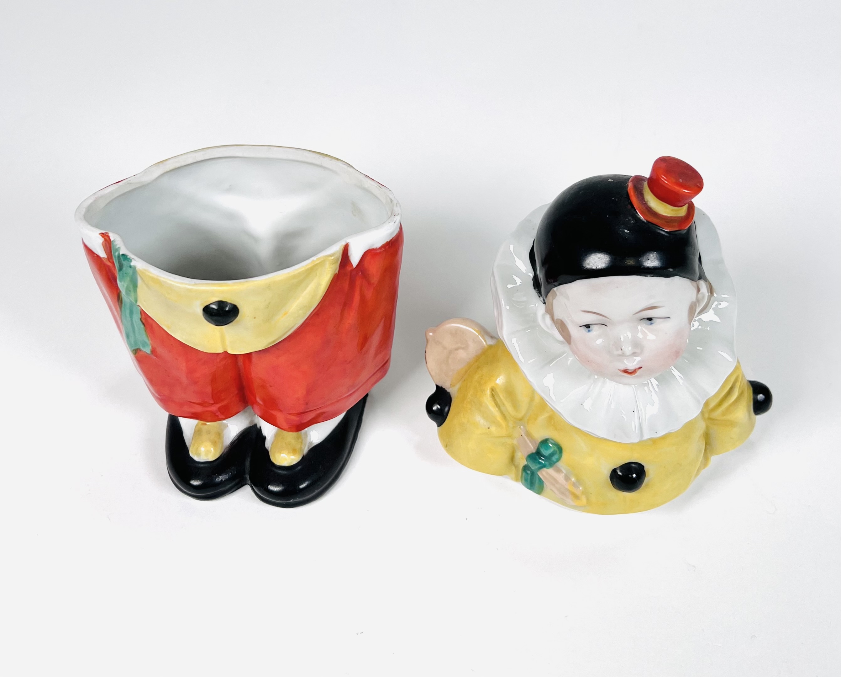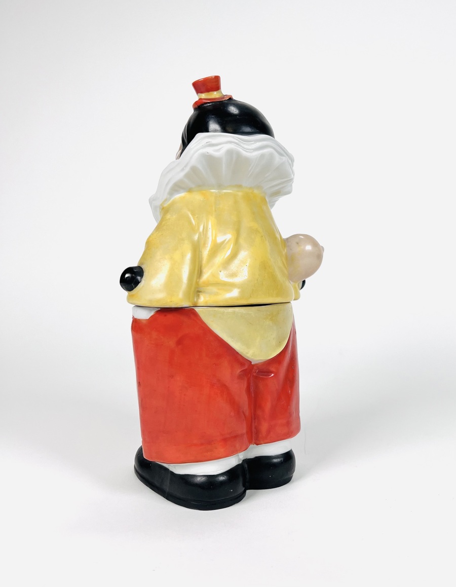Keramieken Art Deco dekselpot van een jongen in gekleurd Pierrot kostuum met mandoline. Aan de onderzijde gemerkt met modelnummer 6029. Duitsland, jaren 30. |