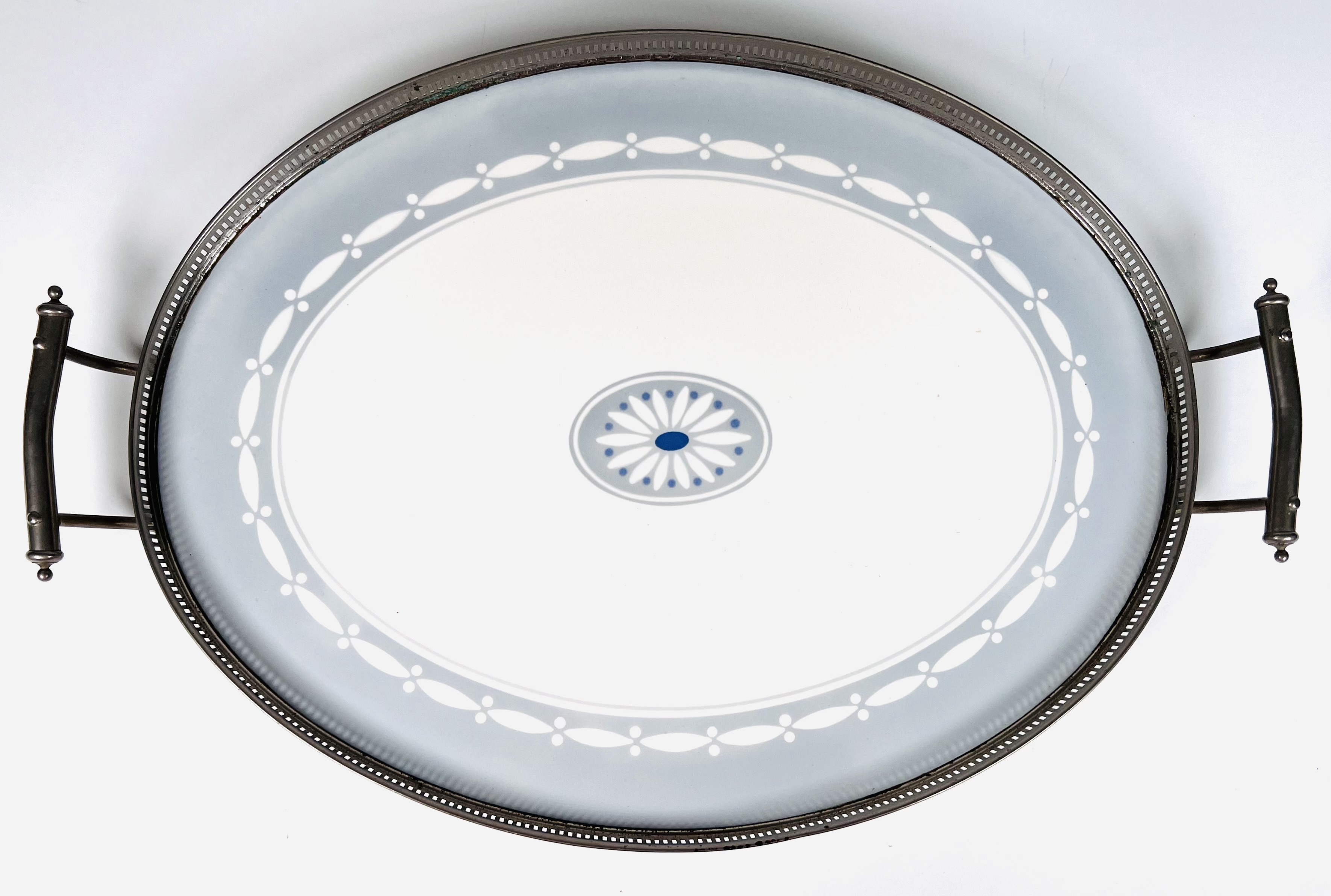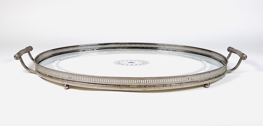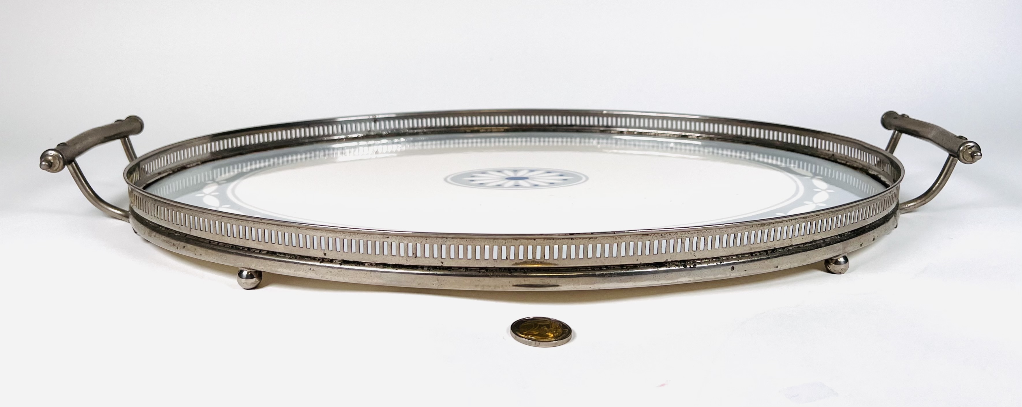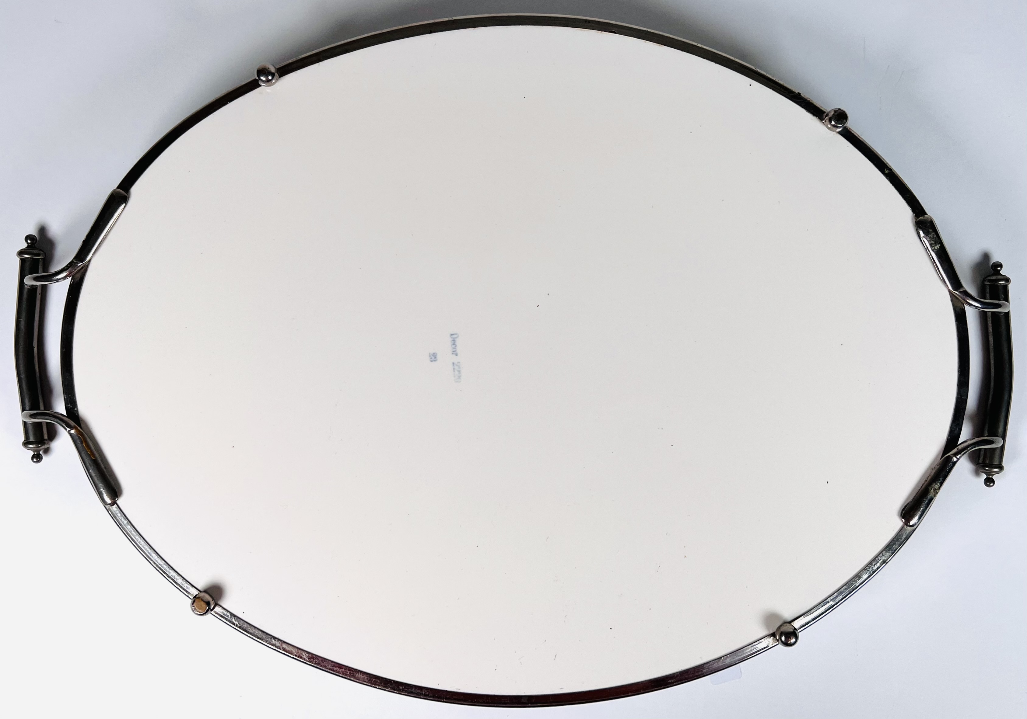 Keramieken Jugendstil dienblad met centraal gestileerd floraal motief, blad gevat in nikkelen montuur met handvatten. Dienblad is aan de onderzijde gemerkt met Decor 2220 en modelnummer 23. Jaren 20/30. |