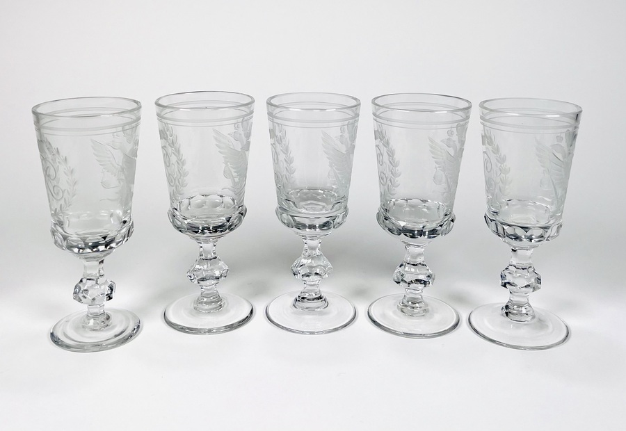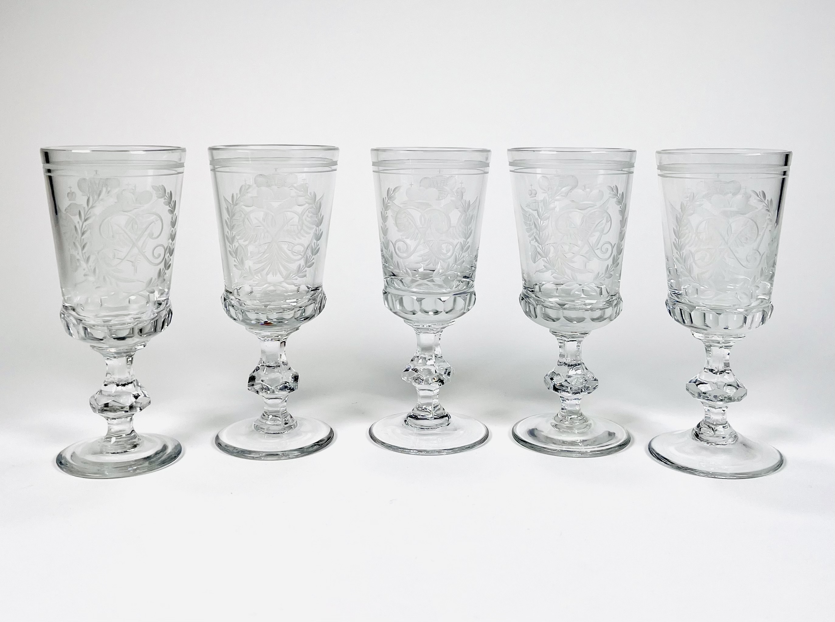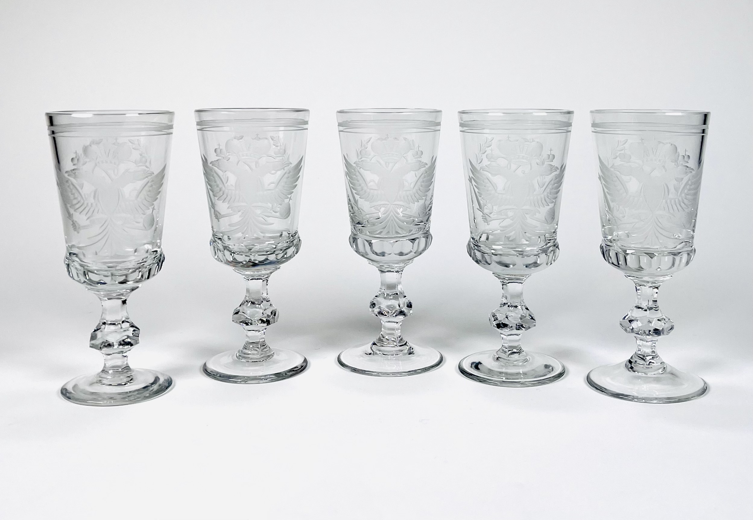 Vijf kristallen geslepen witte wijnglazen gedecoreerd met dubbelkoppige adelaar van de Romanov dynastie en voorzien van keizerlijk monogram. Rusland, einde 20ste eeuw. |