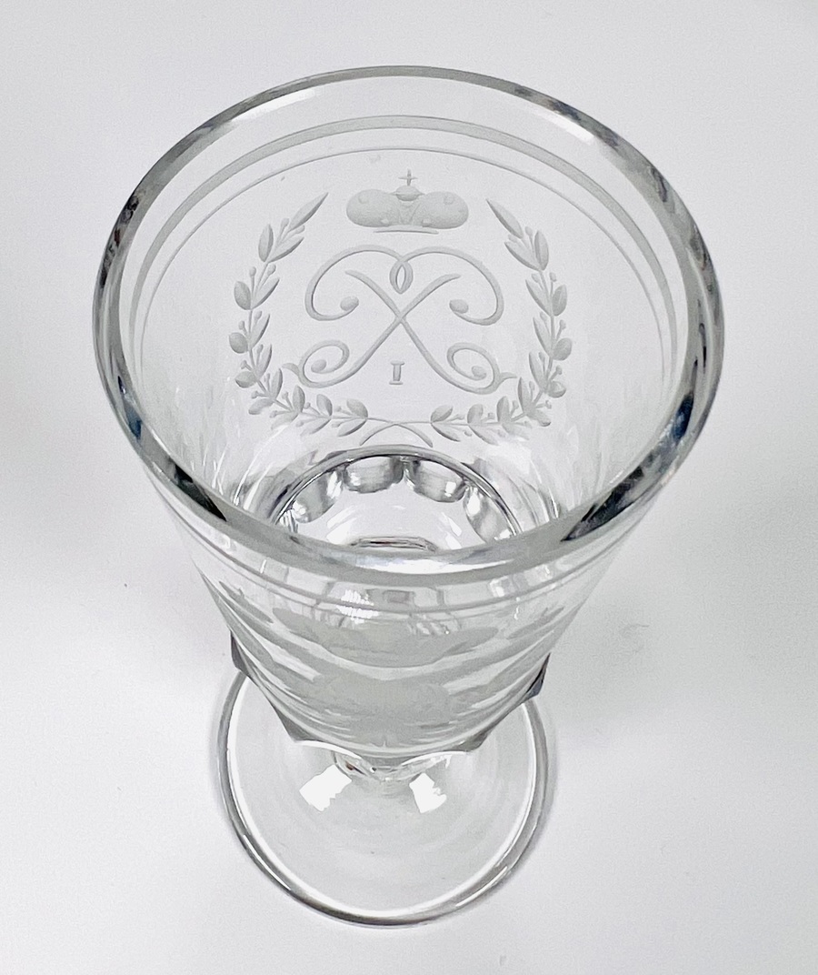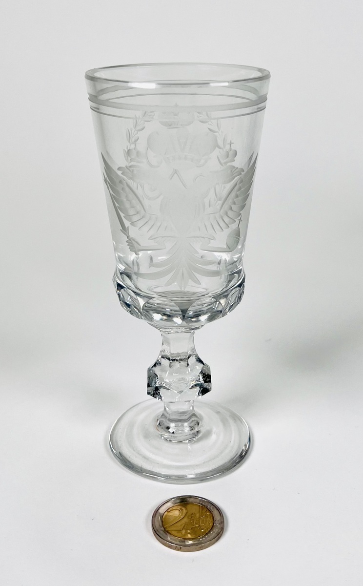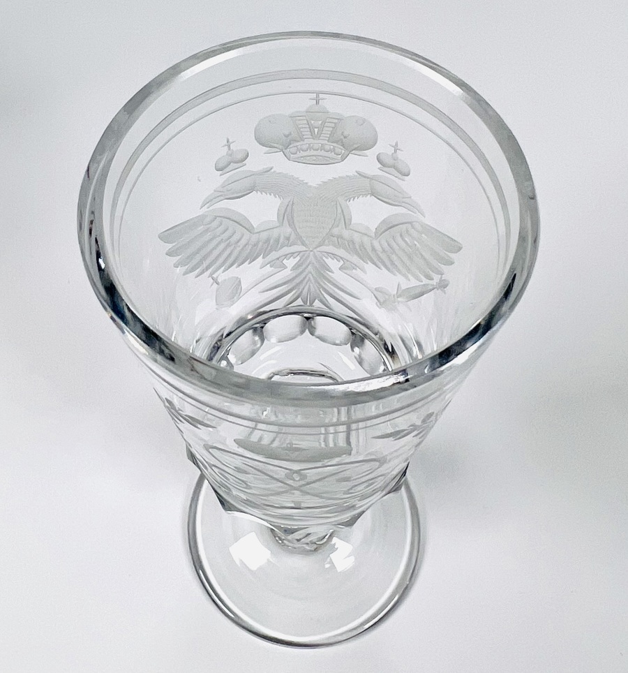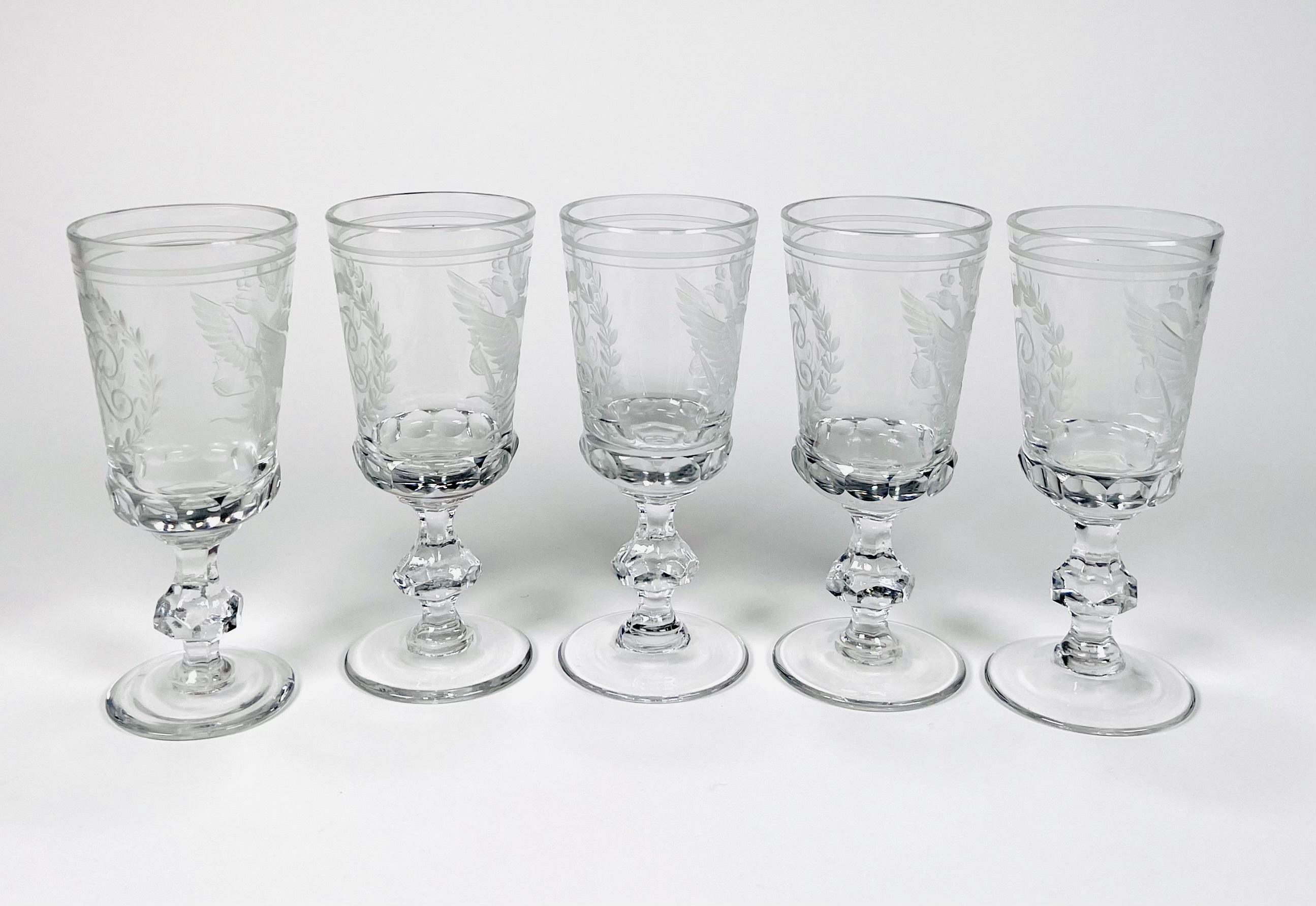 Vijf kristallen geslepen witte wijnglazen gedecoreerd met dubbelkoppige adelaar van de Romanov dynastie en voorzien van keizerlijk monogram. Rusland, einde 20ste eeuw. |