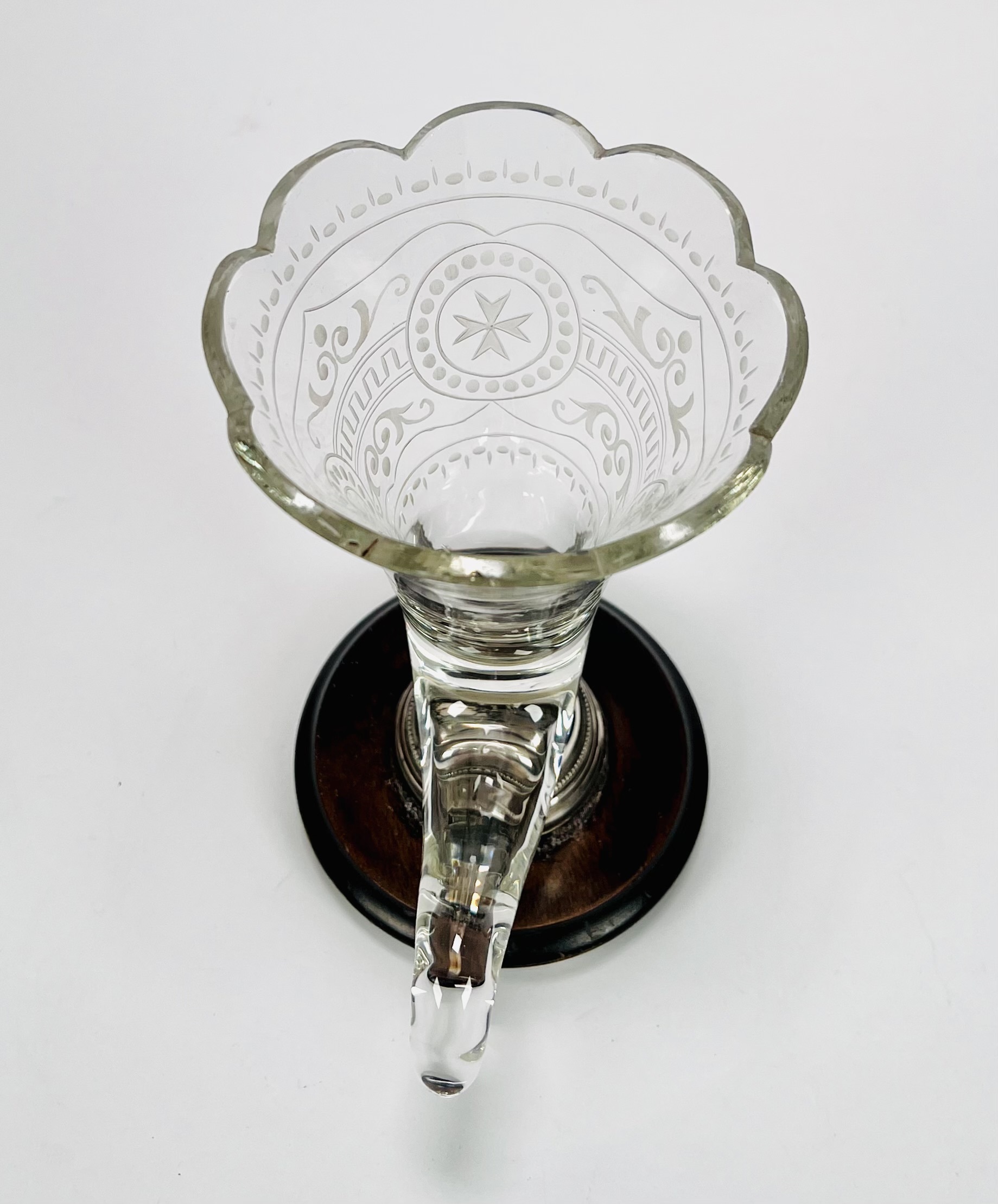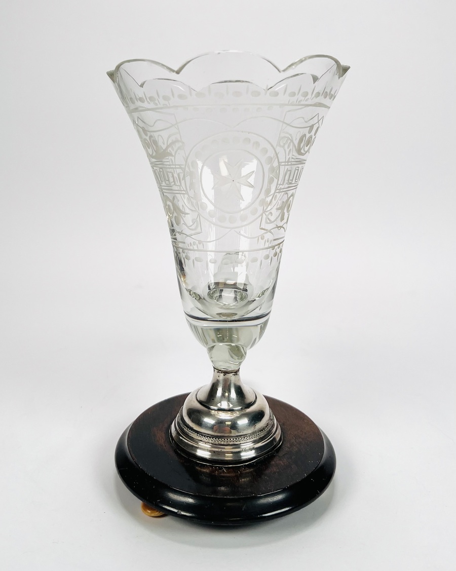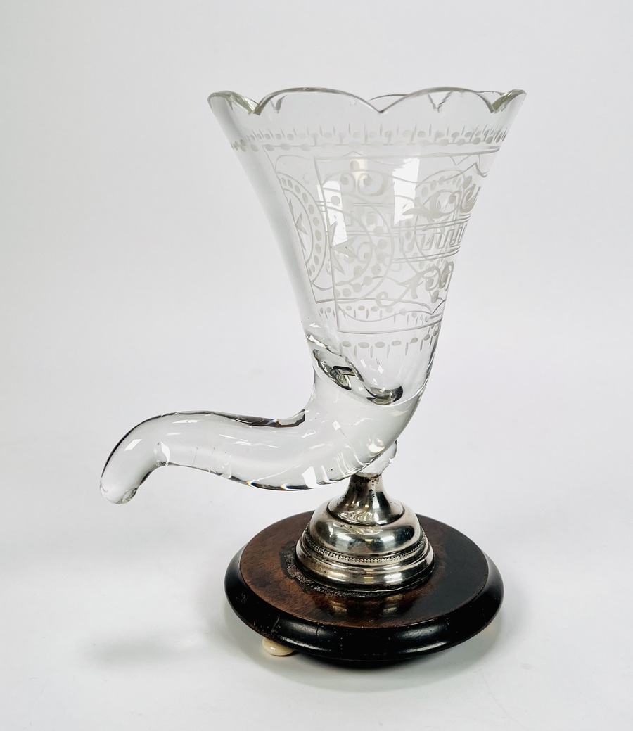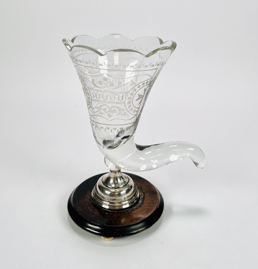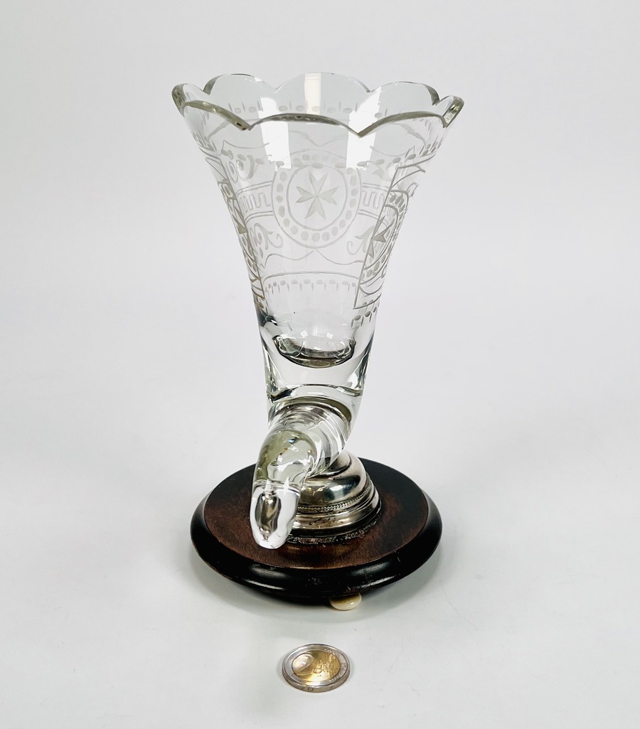 Glazen Hoorn des overvloeds glas op houten- en zilveren basis met benen bolpootjes. Geslepen glas is voorzien van een Maltezer kruis. Eerste helft 20e eeuw. |