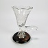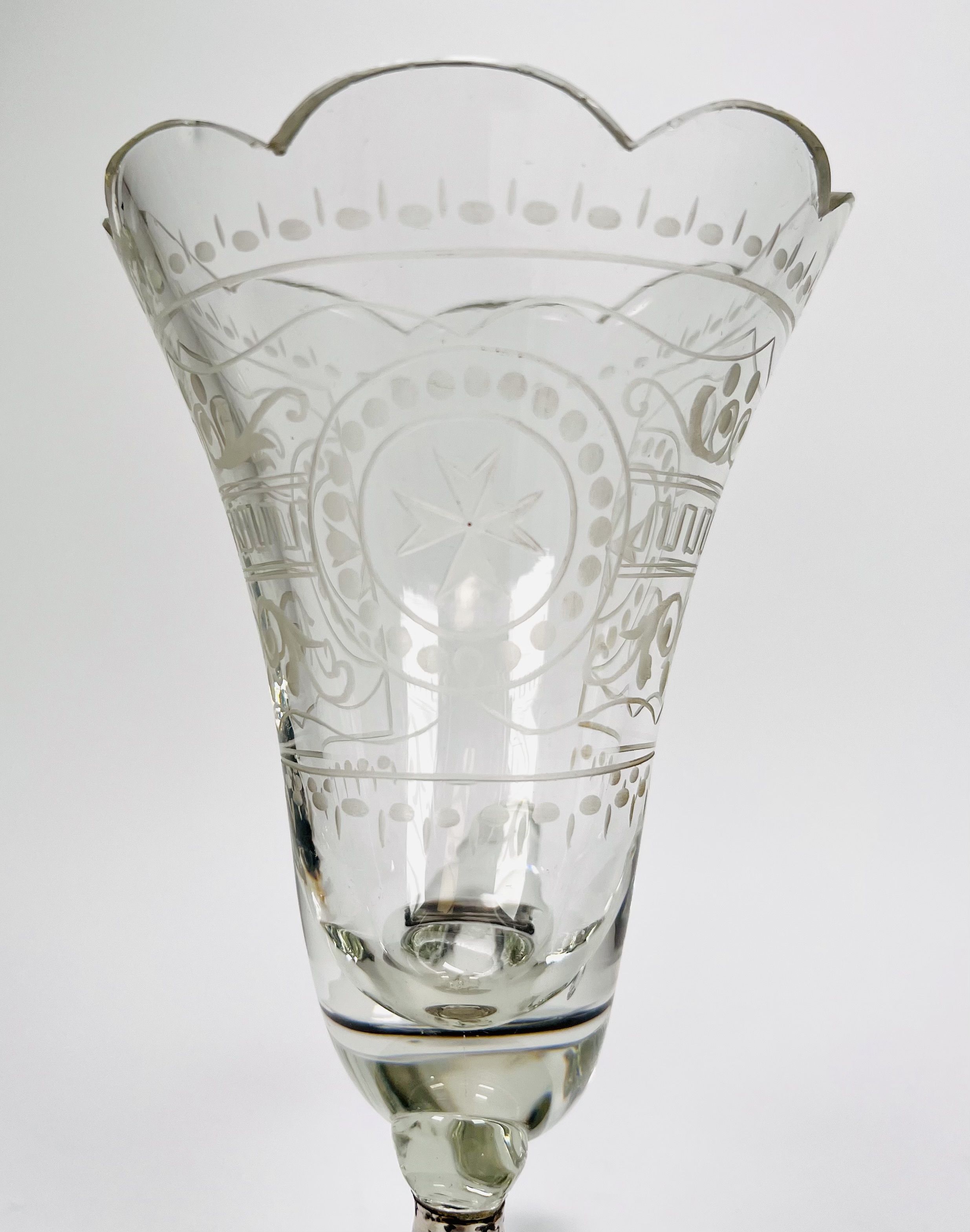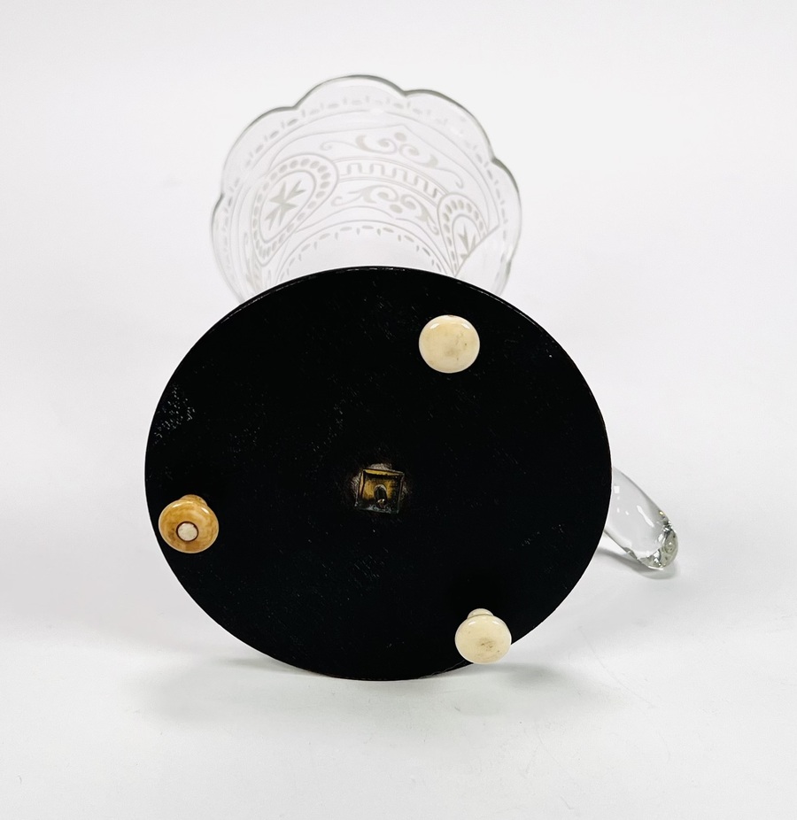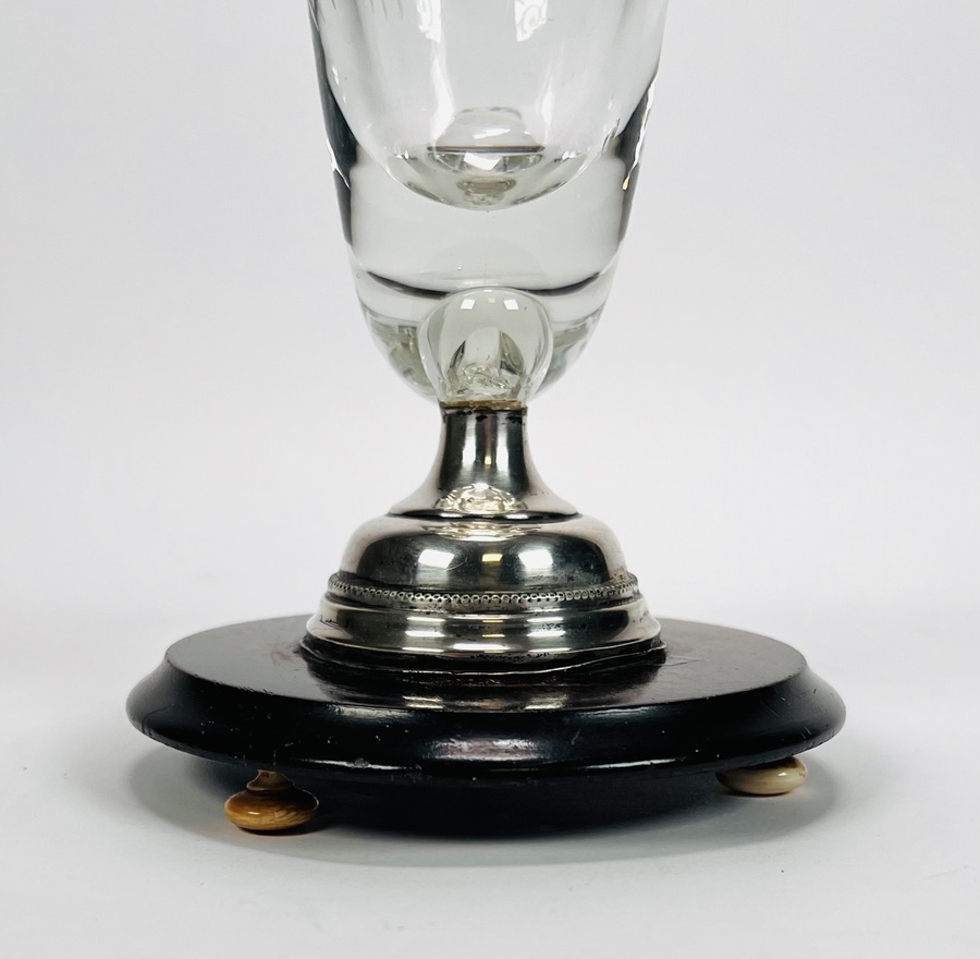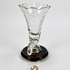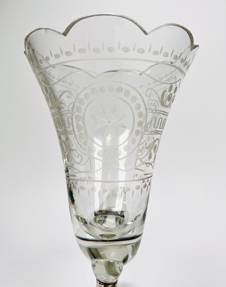 Glazen Hoorn des overvloeds glas op houten- en zilveren basis met benen bolpootjes. Geslepen glas is voorzien van een Maltezer kruis. Eerste helft 20e eeuw. |