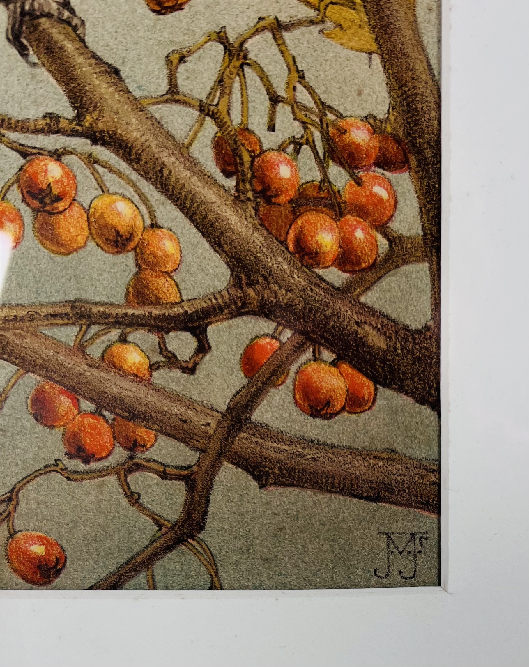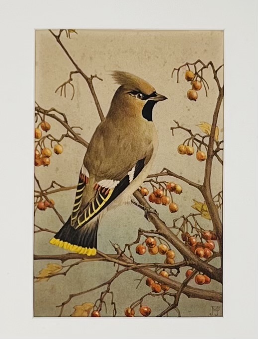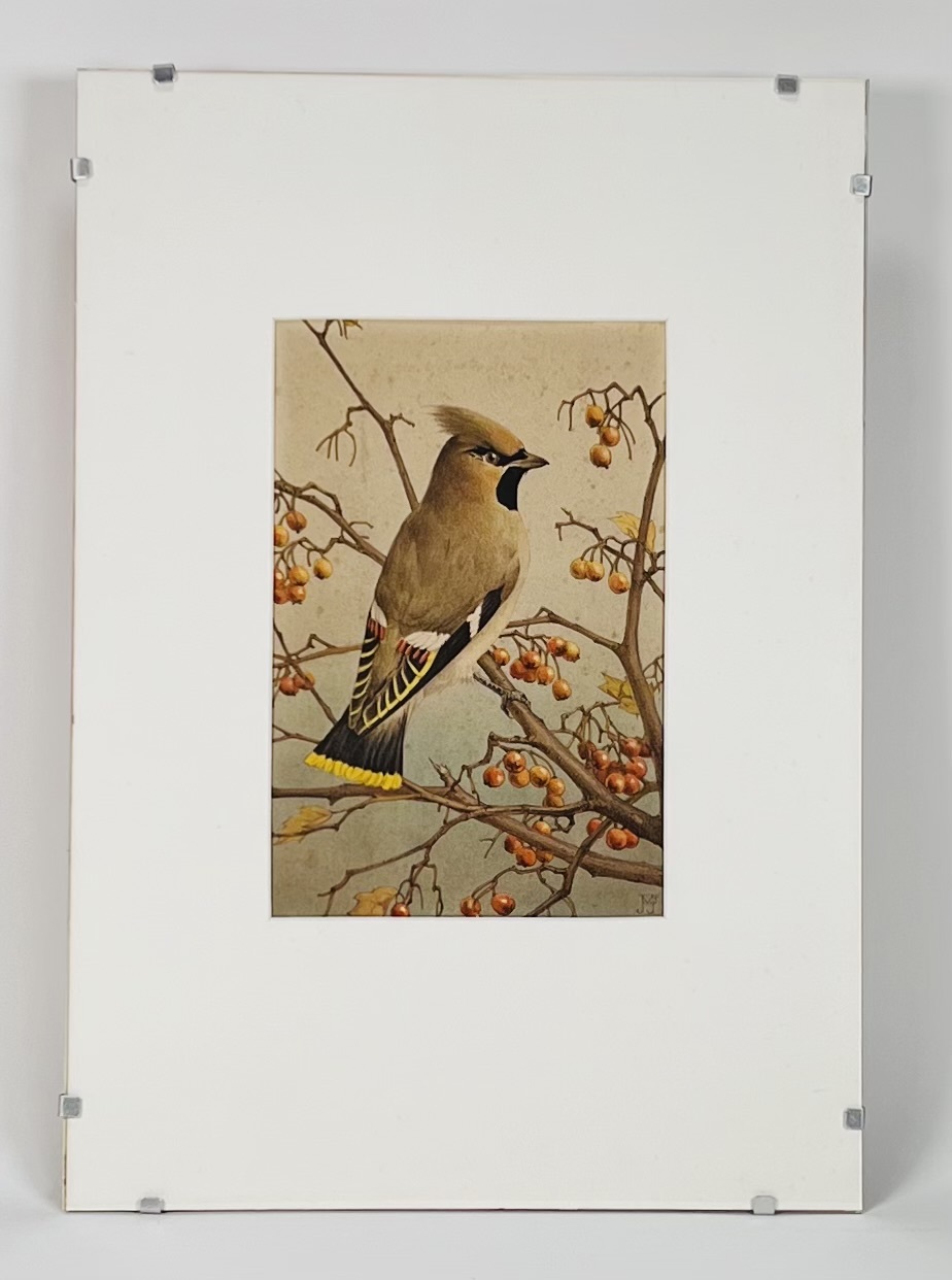 Lithografie van een pestvogel met lijsterbessen door Jan Voerman Jr., betreft een ingelijste kalenderplaat uit 1937. |