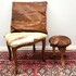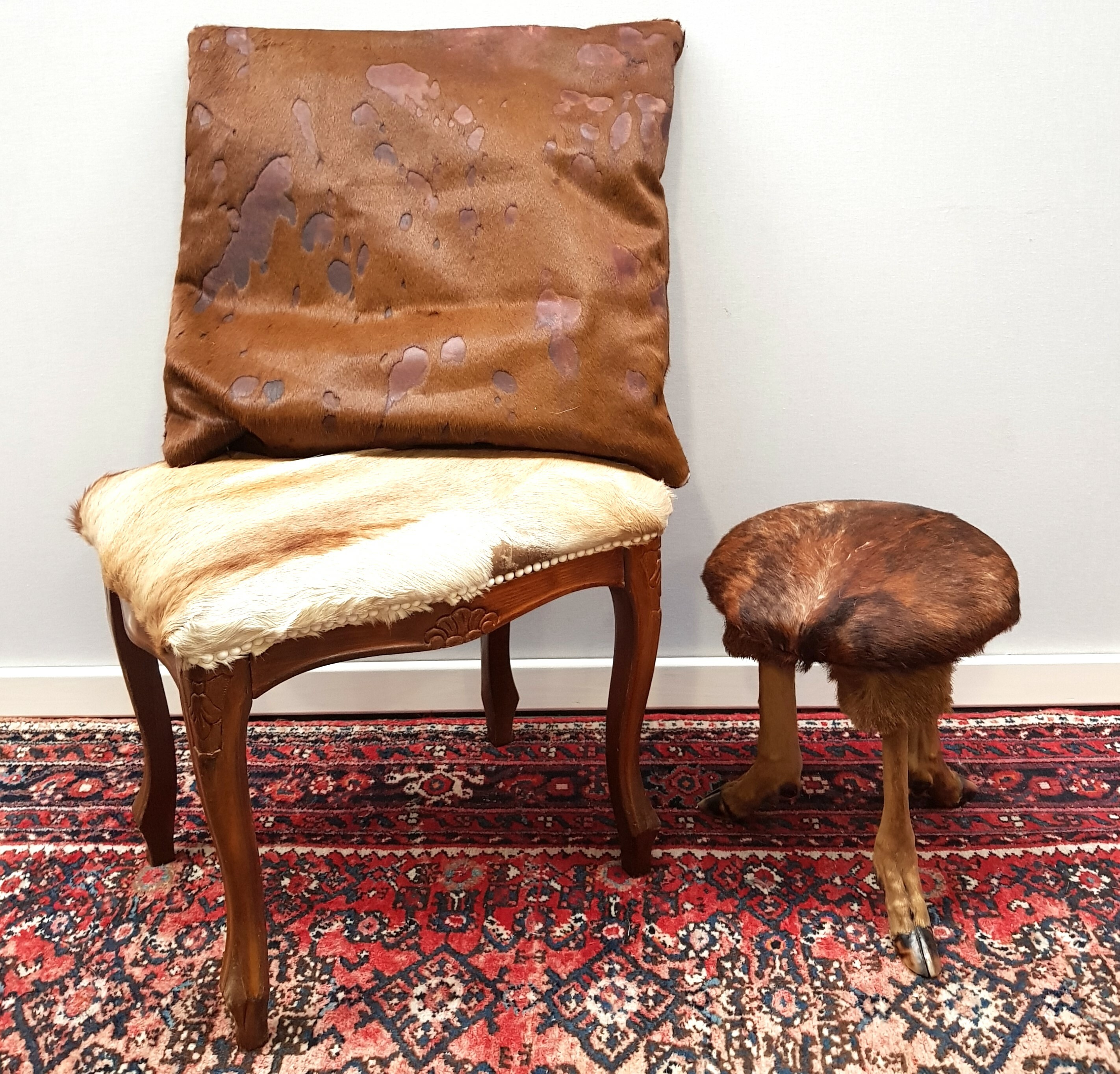 Twee krukjes, een krukje bekleed met antilopevel en een krukje bekleed met reebokvel en op reebokpoten. Tevens een kussen van paardenleder. Eind 20e eeuw. |