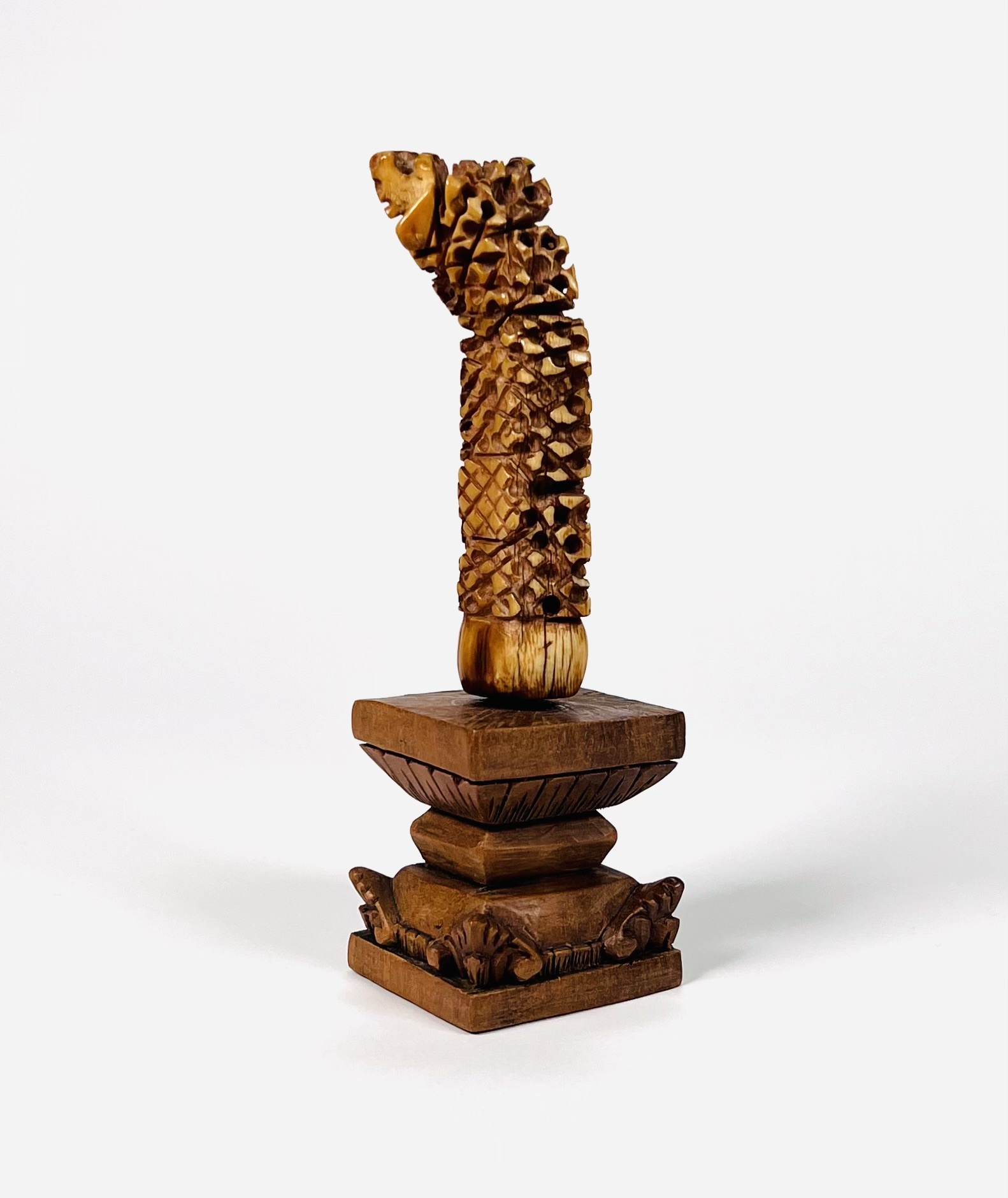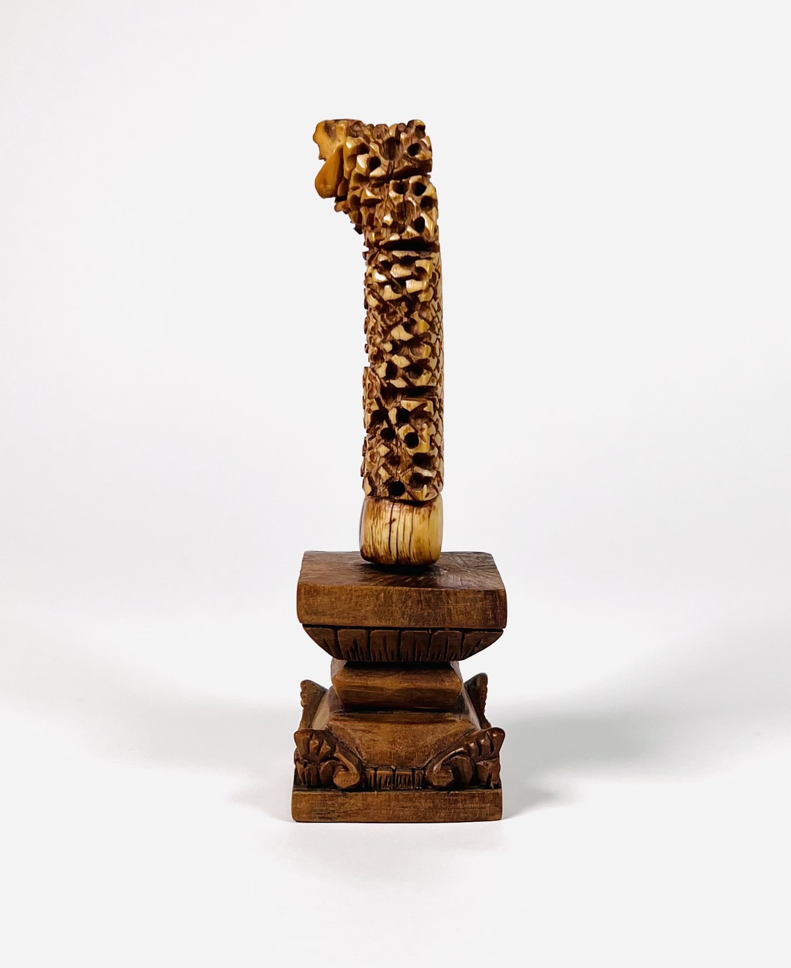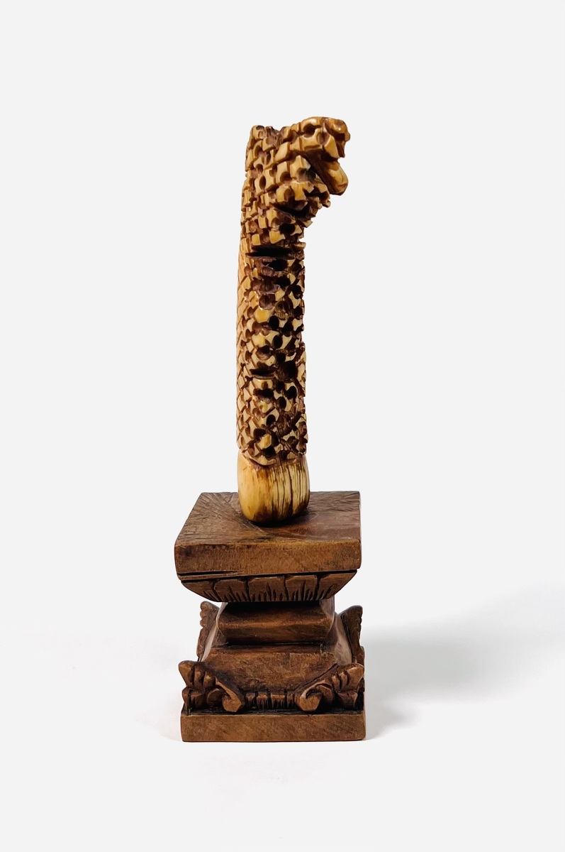Madoera krisgreep op een houten sokkel, gebaseerd op de levensboom van het Oost-Javaanse eiland Madoera. 18e eeuw. |