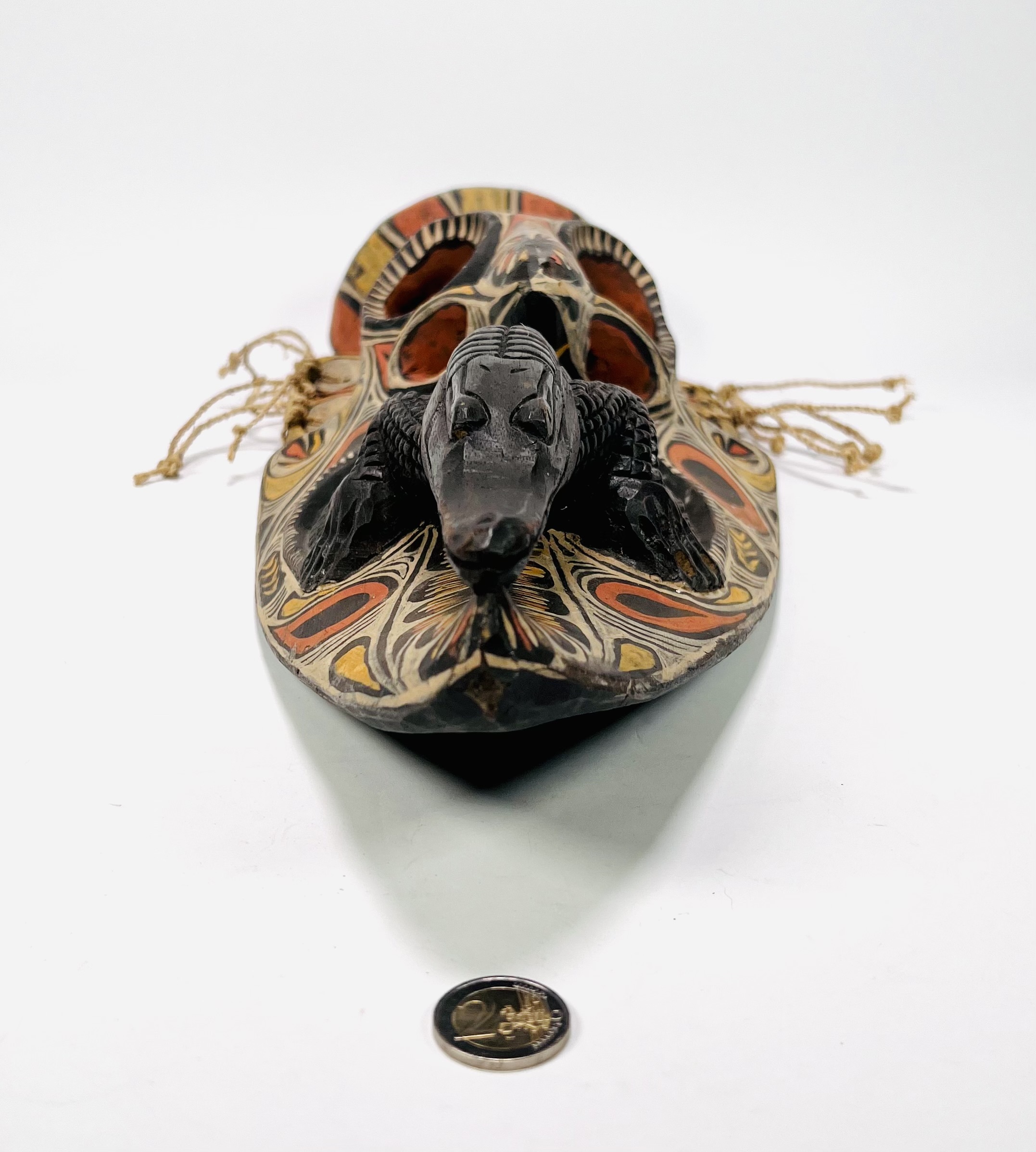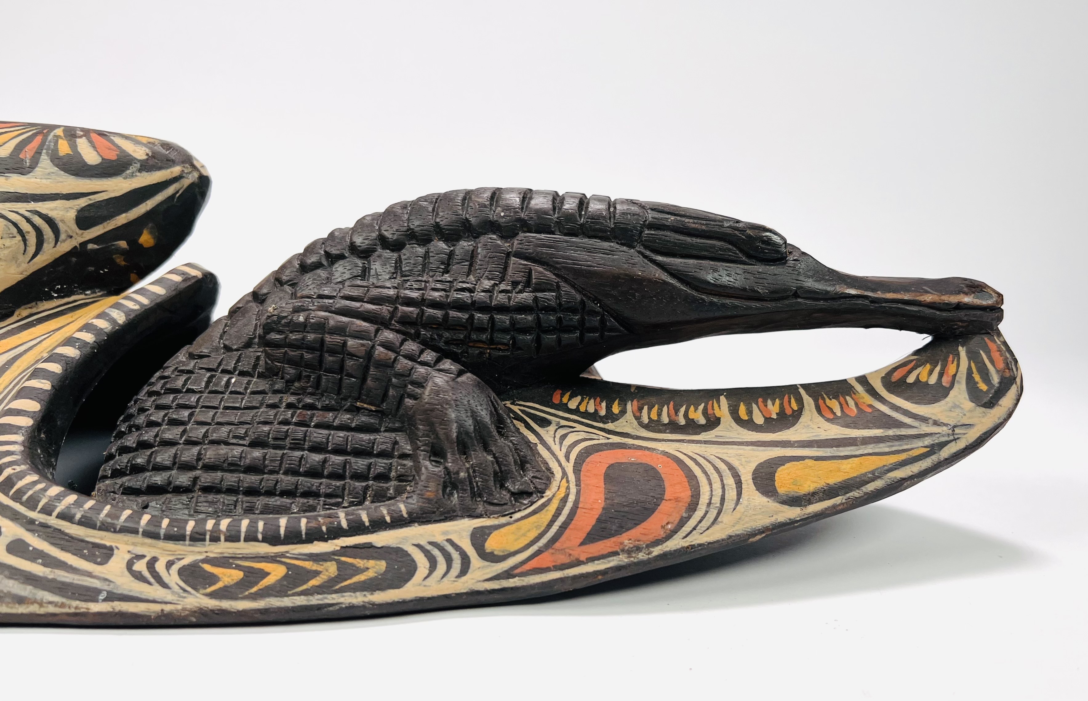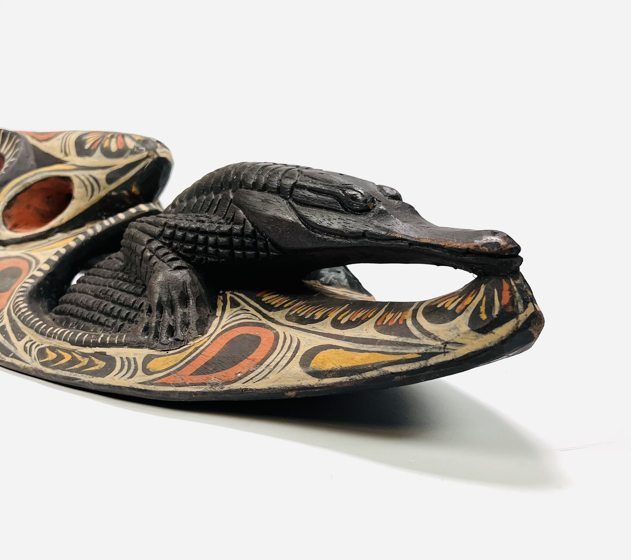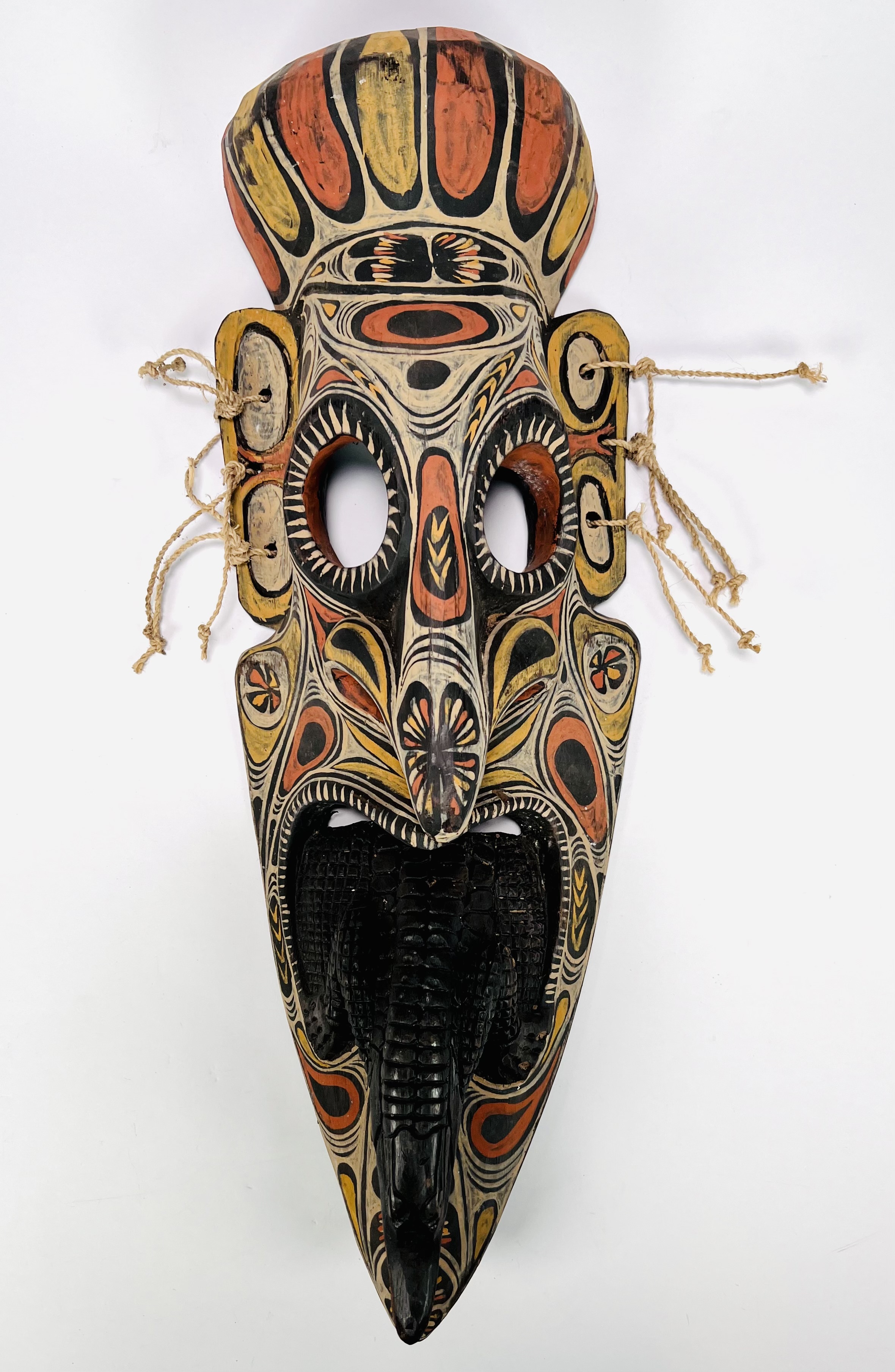 Houten Savi/Tambanum polychroom beschilderd wandmasker. Herkomst Centraal Sepik rivierengebied, Papoea-Nieuw-Guinea, 20e eeuw. |